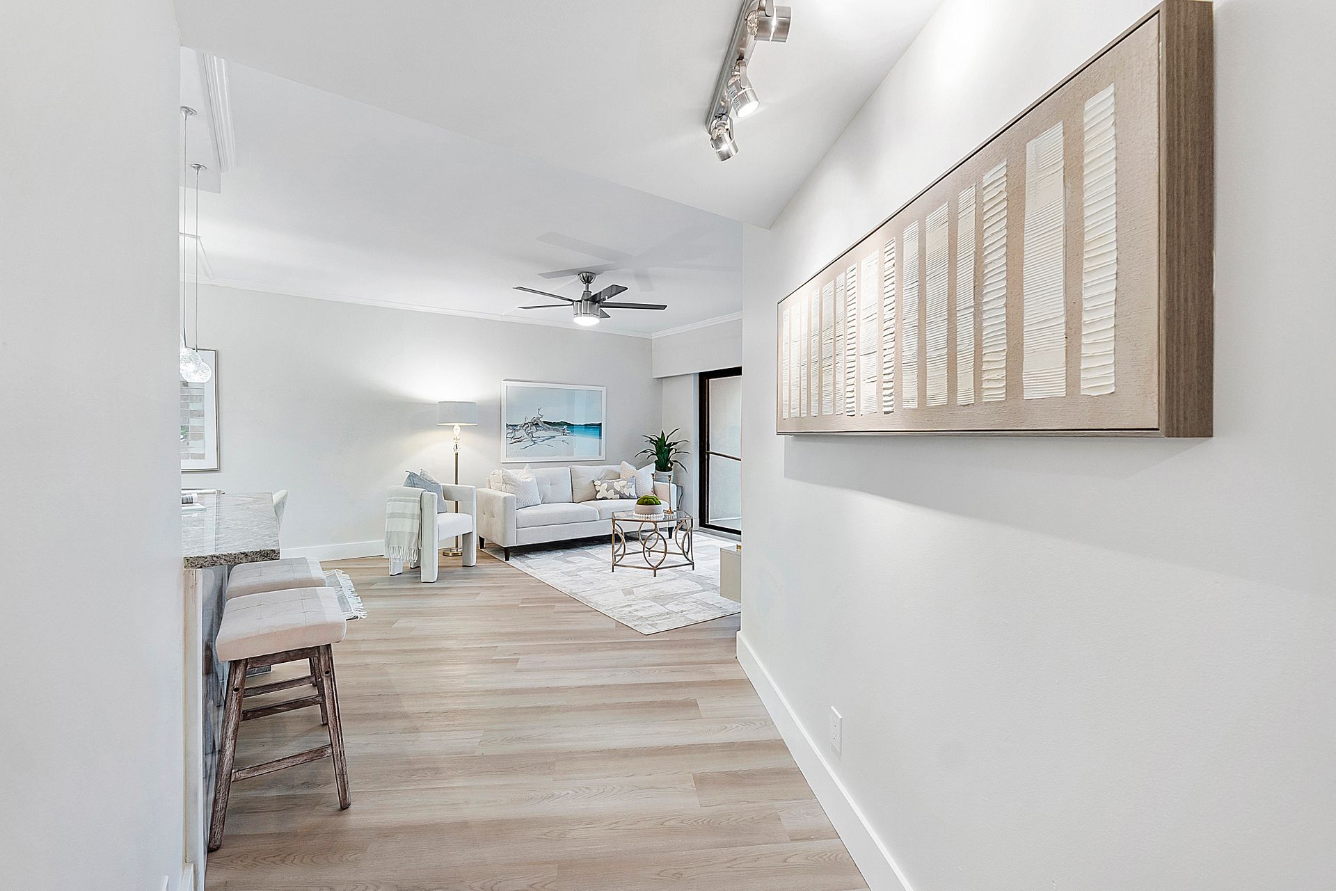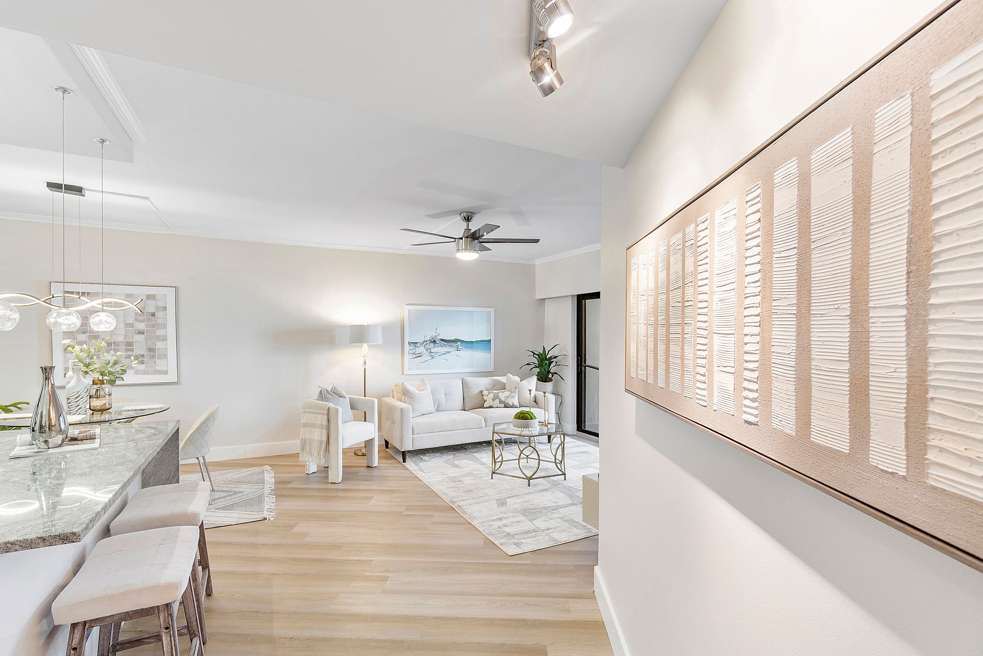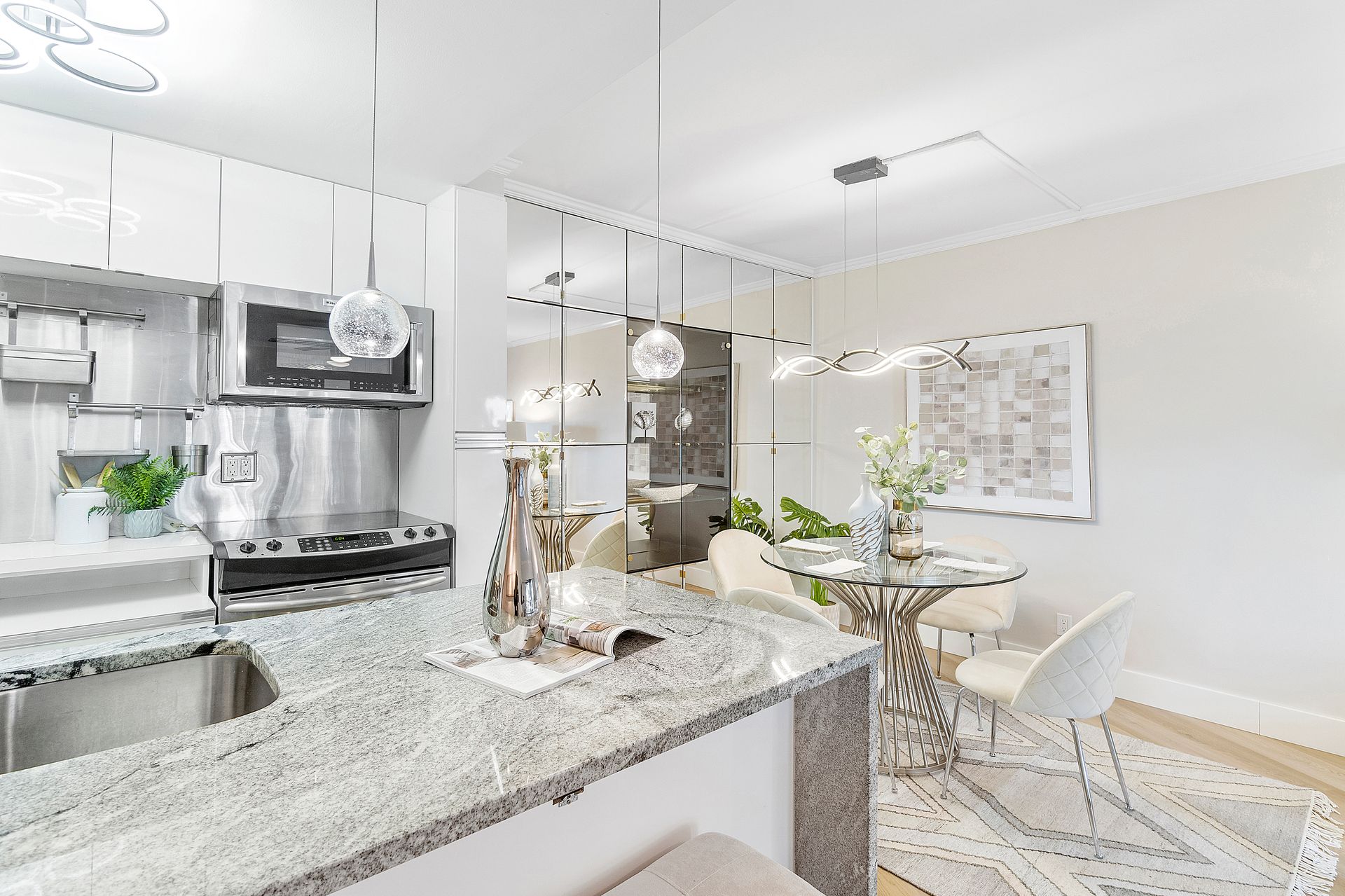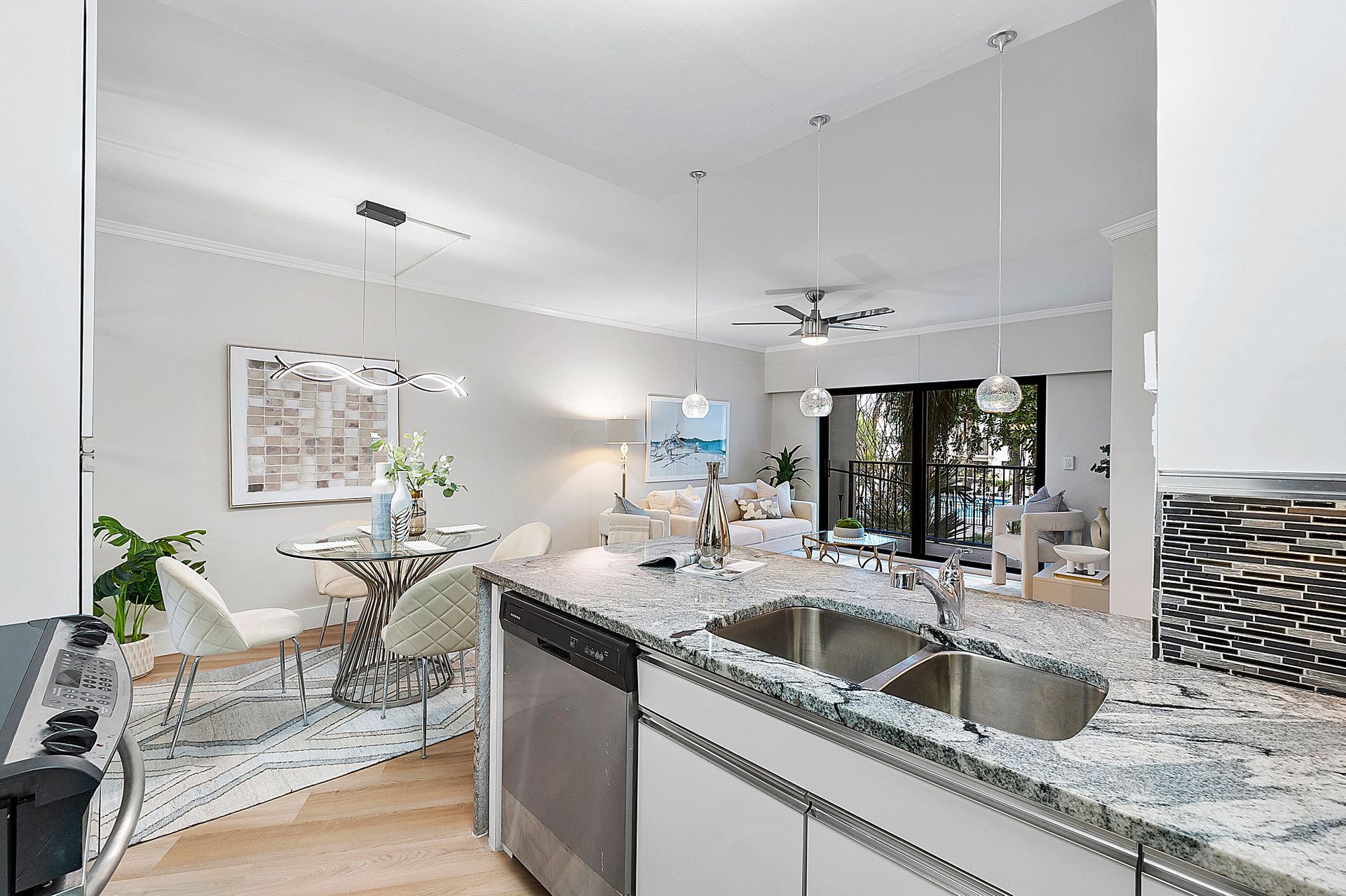 The stylish open-concept kitchen boasts custom cabinetry, sleek granite countertops, and high-end appliances, while luxurious laminate flooring flows seamlessly throughout the unit. Freshly painted with a modern, elegant aesthetic, this home is move-in ready.
