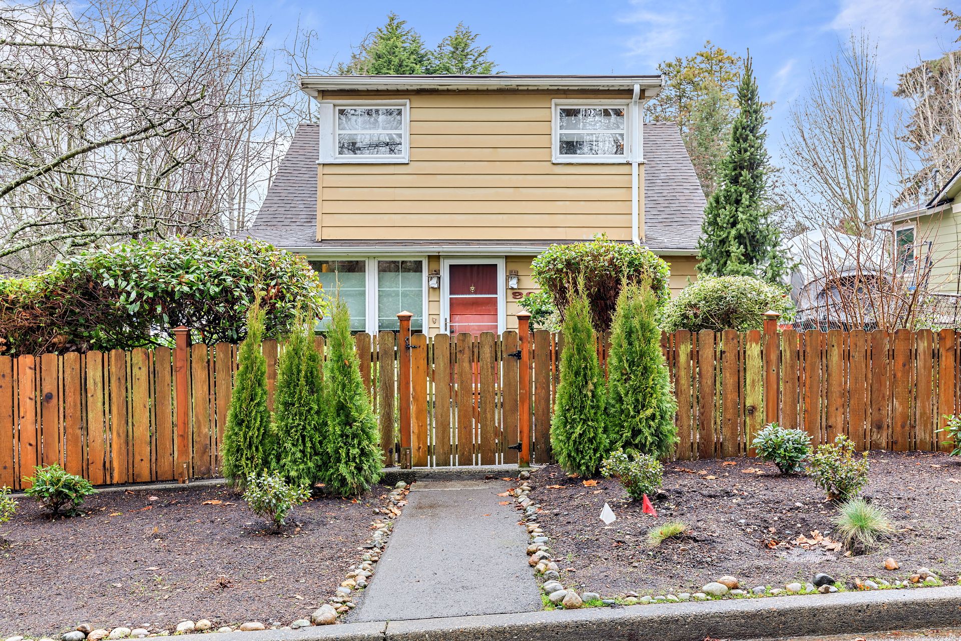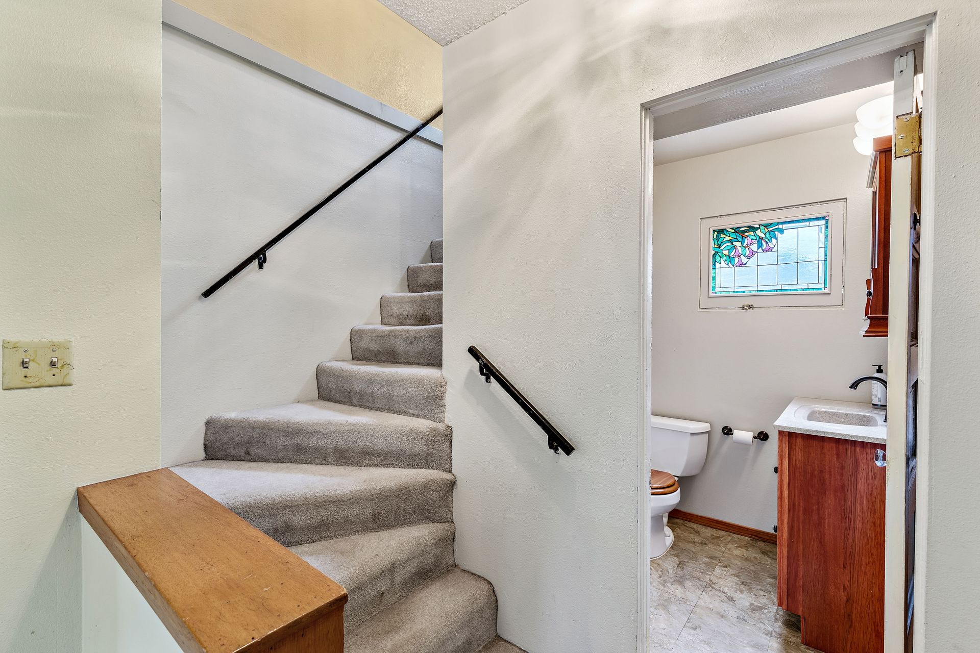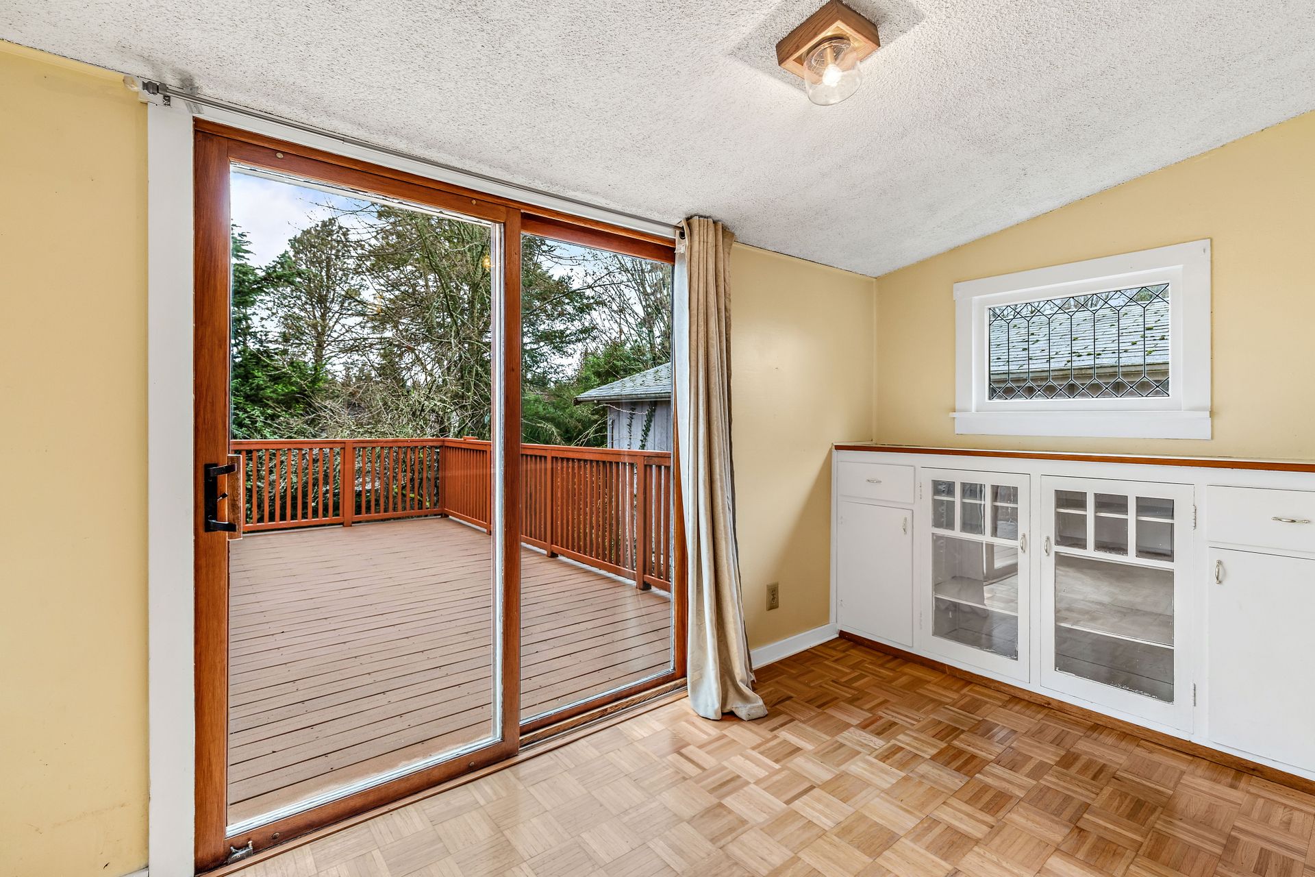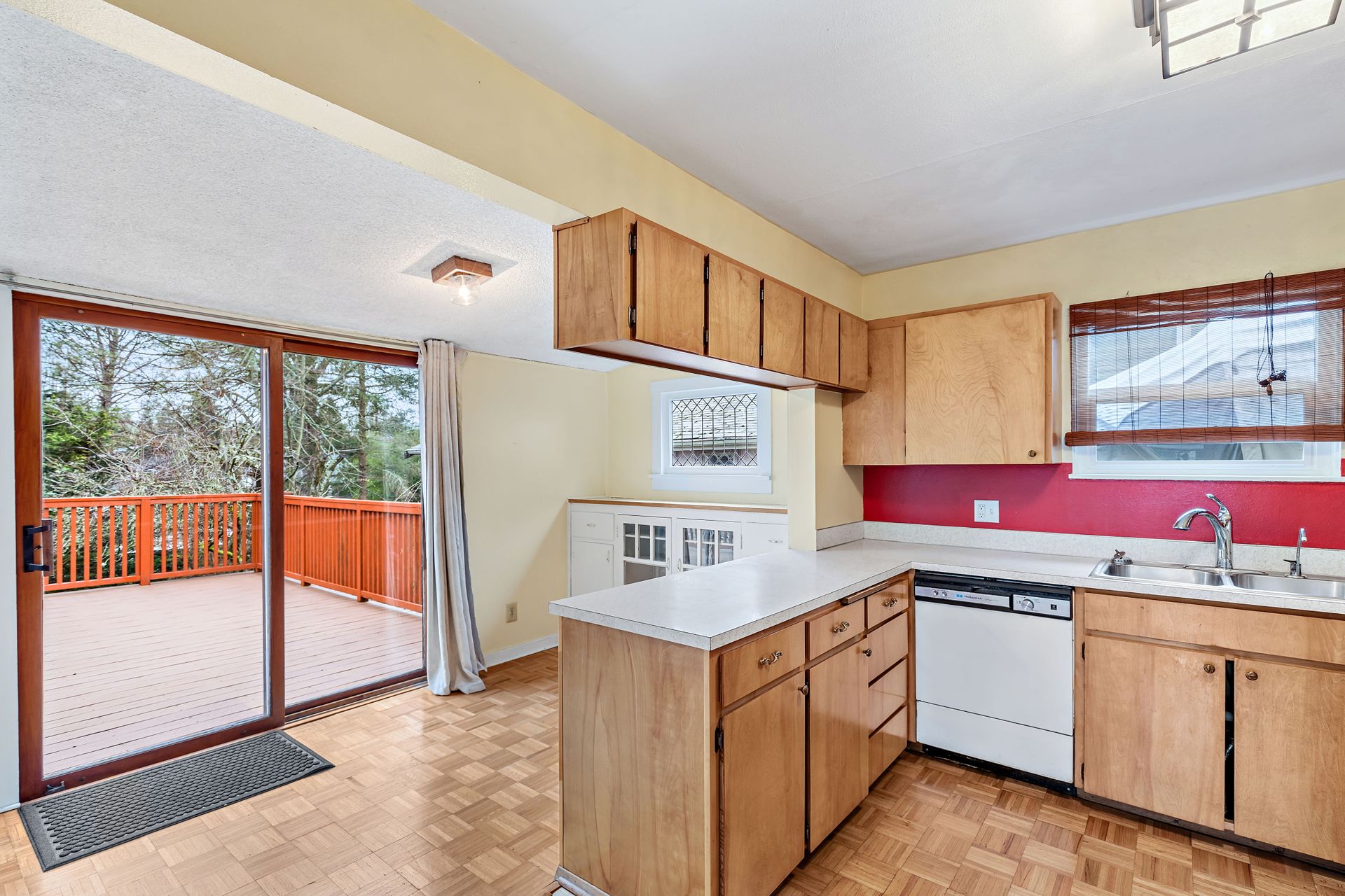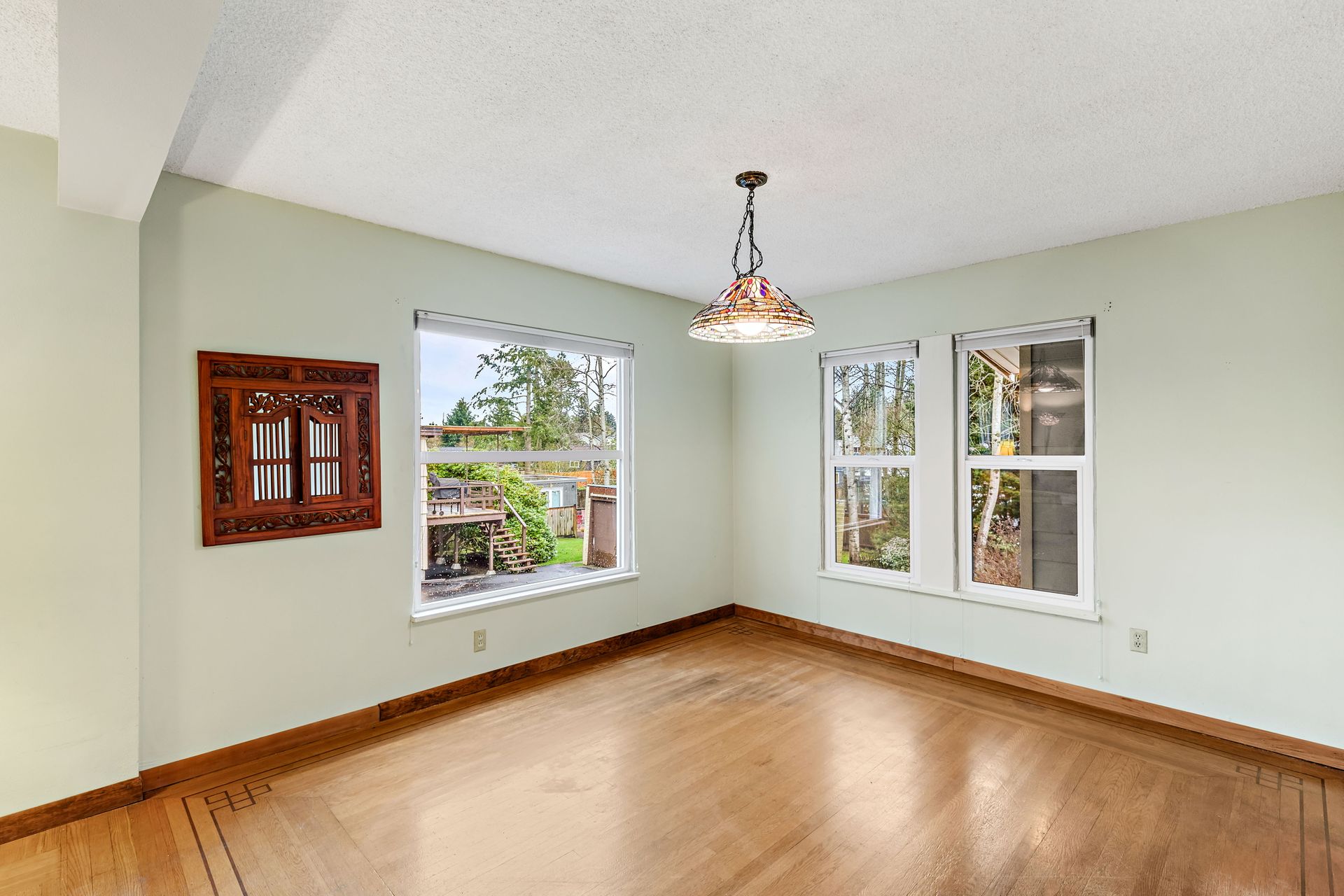Vintage charm, park view. Ready for modern living in a home with historic features. This Greenwood home offers hardwood floors, a spacious main living area and an eat-in kitchen. The private bedroom on the main floor is perfect for sleep or work. Enjoy the expansive deck that oversees a private backyard with plenty of room to entertain or create an outdoor oasis. Upstairs features two bedrooms with privacy from the main living area, storage and a tile bathroom. Handmade stained-glass windows offer both character and beauty. This home is complete with an immaculate yard with great curb appeal as well as a backyard ideal for play or gardening. Onsite parking, roomy basement storage and convenient access to Greenwood amenities. Move in now, update to your taste.
