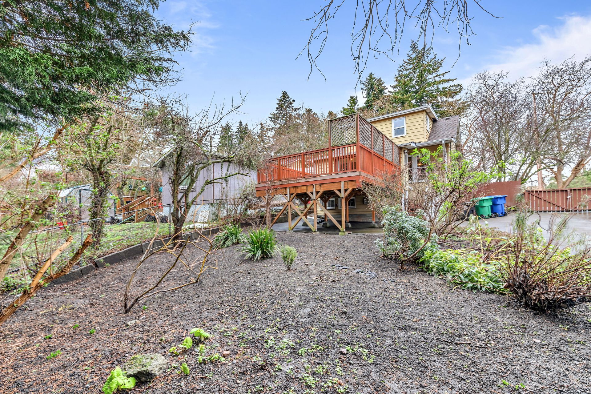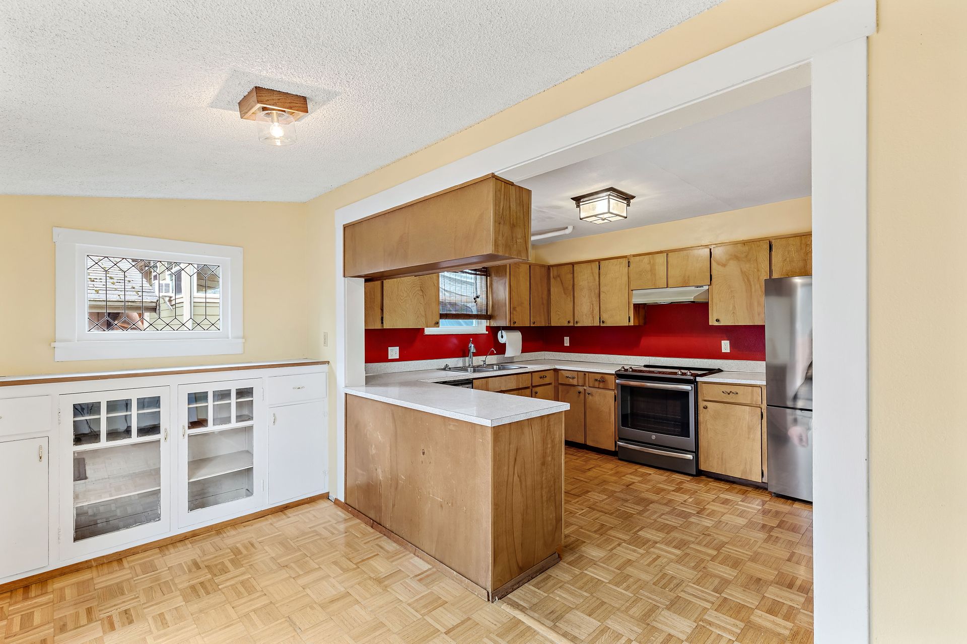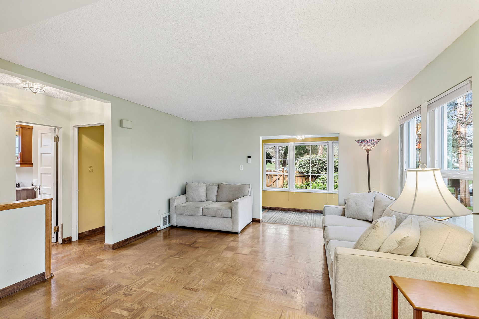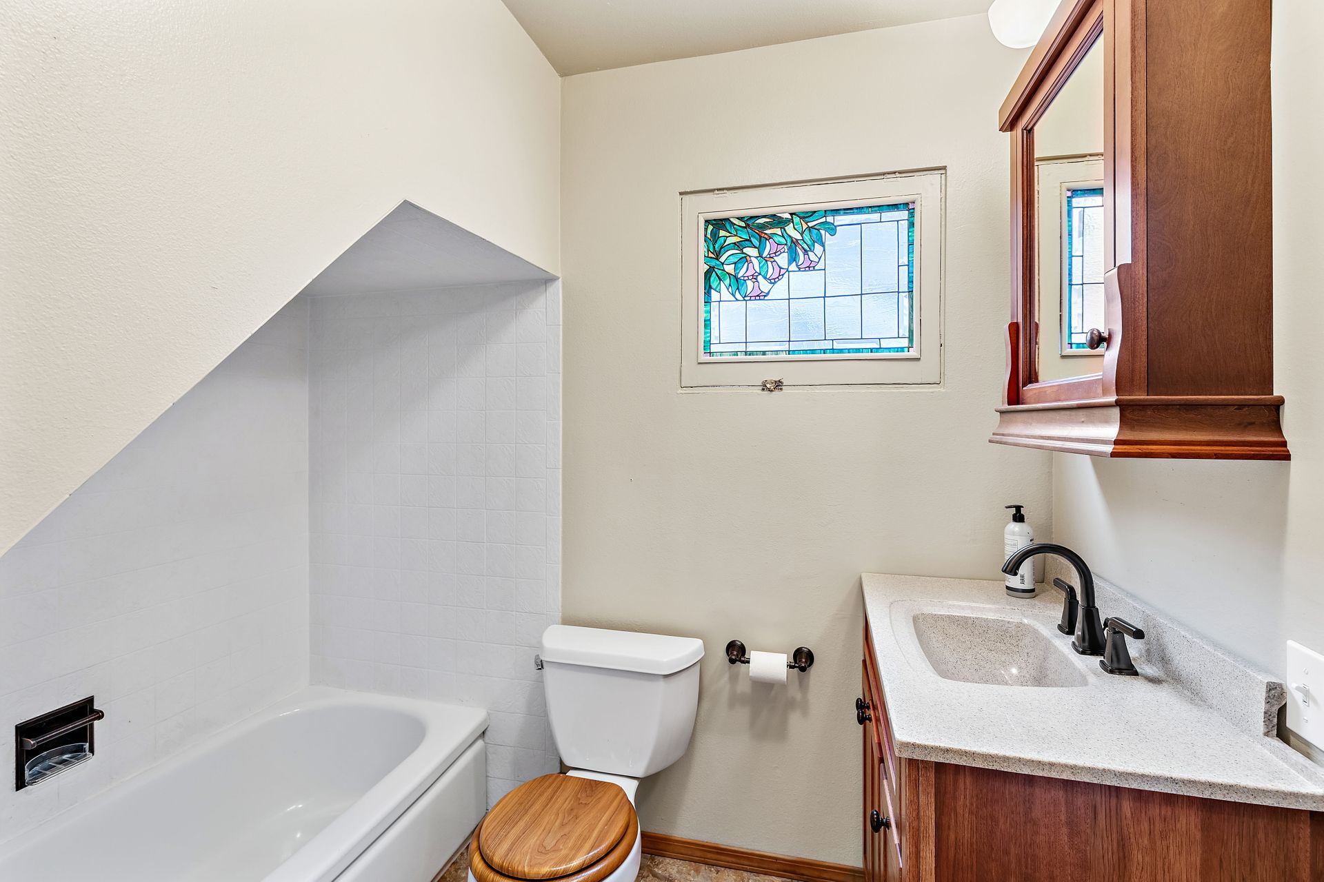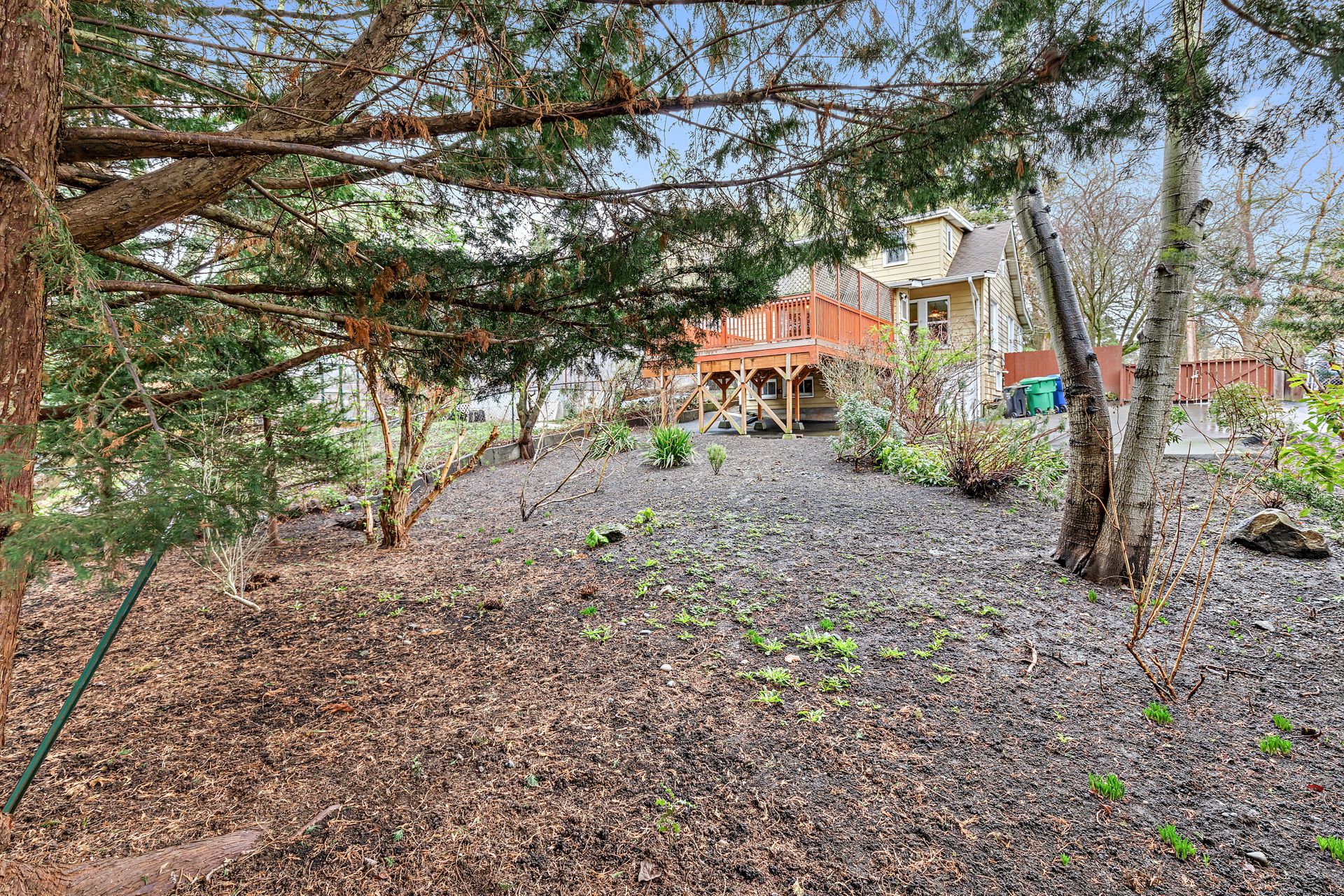 Vintage charm, park view. Ready for modern living in a home with historic features. This Greenwood home offers hardwood floors, a spacious main living area and an eat-in kitchen. The private bedroom on the main floor is perfect for sleep or work. Enjoy the expansive deck that oversees a private backyard with plenty of room to entertain or create an outdoor oasis. Upstairs features two bedrooms with privacy from the main living area, storage and a tile bathroom. Handmade stained-glass windows offer both character and beauty. This home is complete with an immaculate yard with great curb appeal as well as a backyard ideal for play or gardening. Onsite parking, roomy basement storage and convenient access to Greenwood amenities. Move in now, update to your taste.