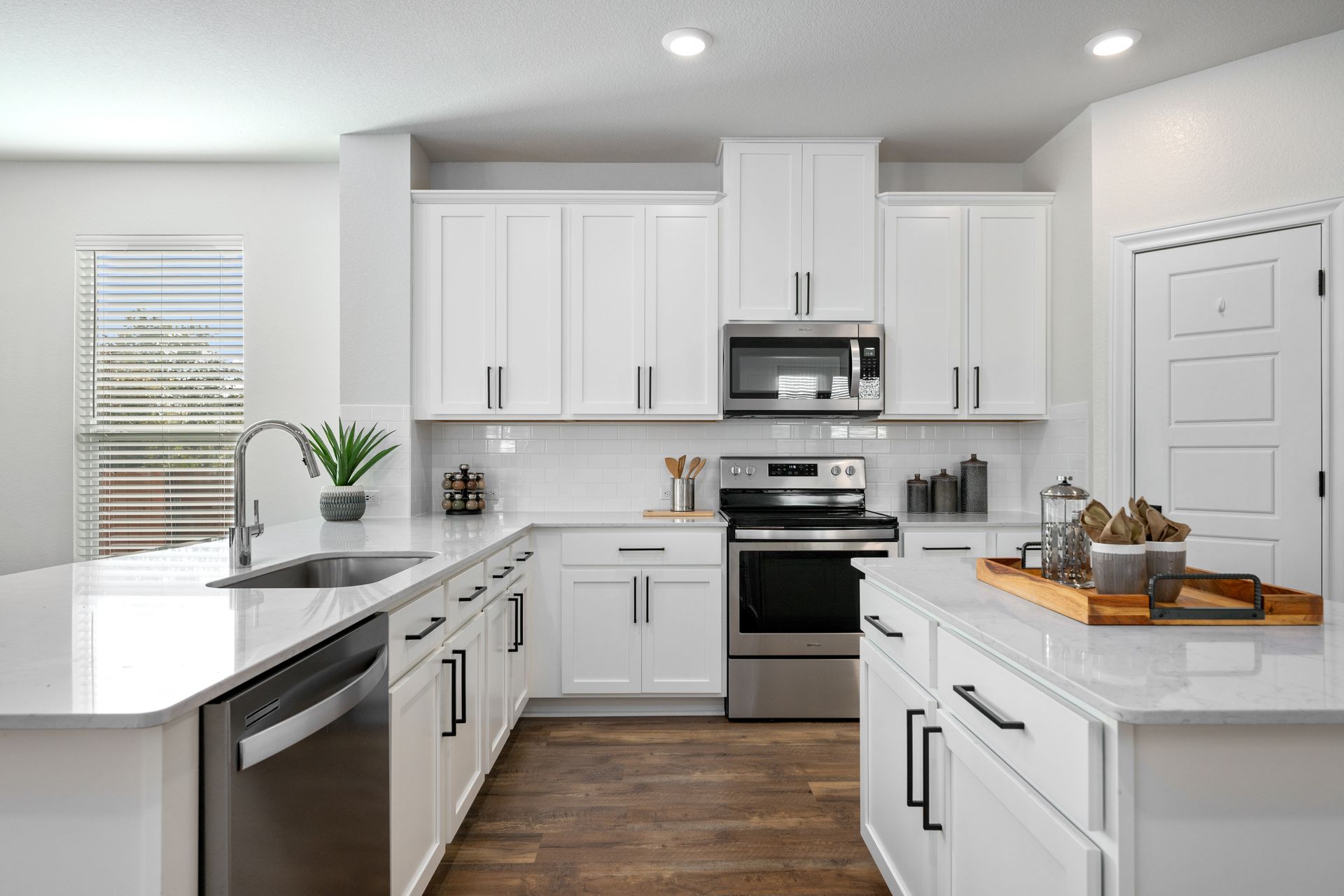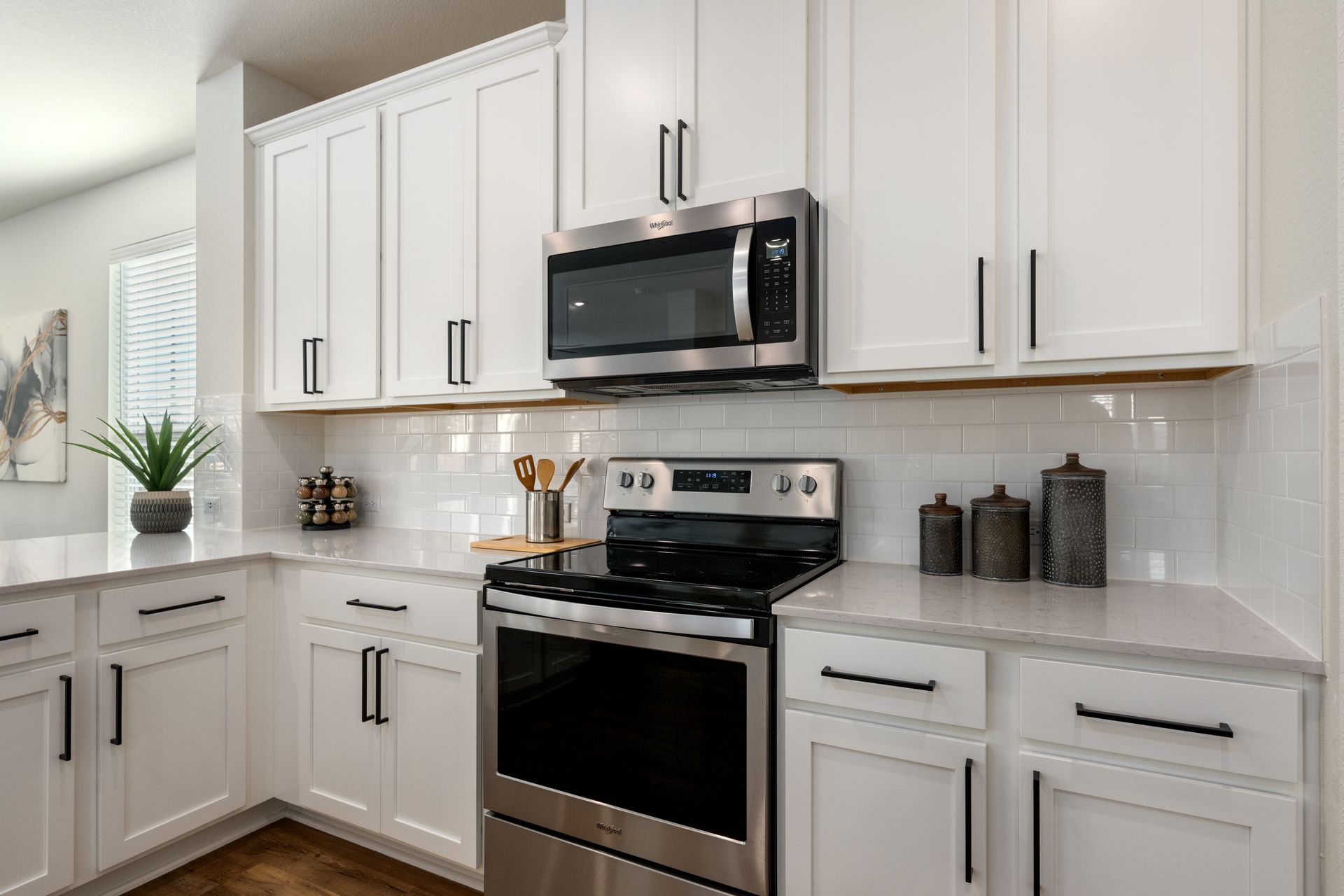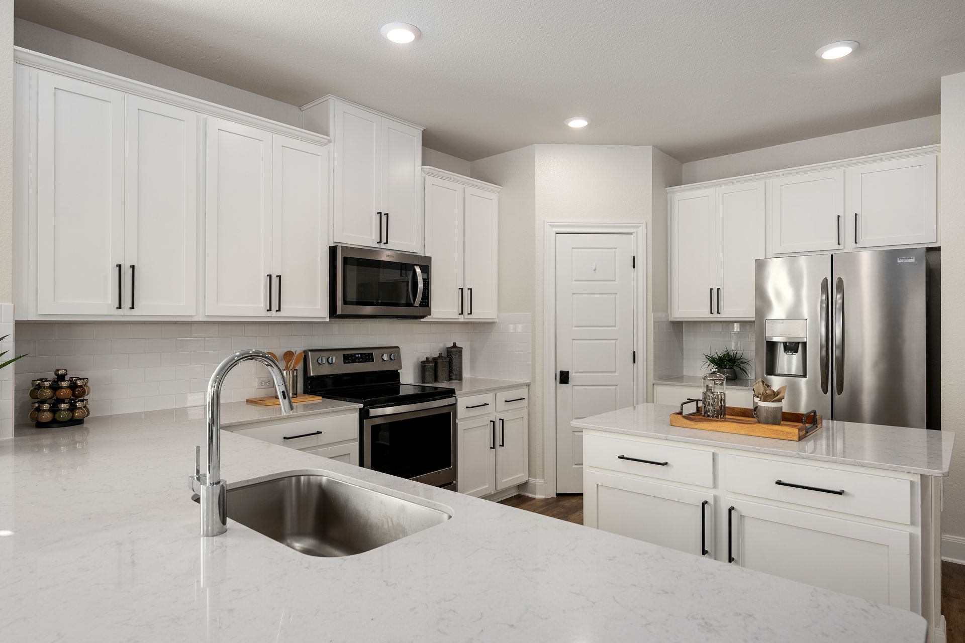 Stunning kitchen featuring white quartz countertops, subway tile backsplash and upgraded designer fixtures. Enjoy the convenience of a center island with ample storage, stainless steel appliances, a spacious walk-in pantry and under-counter lighting.