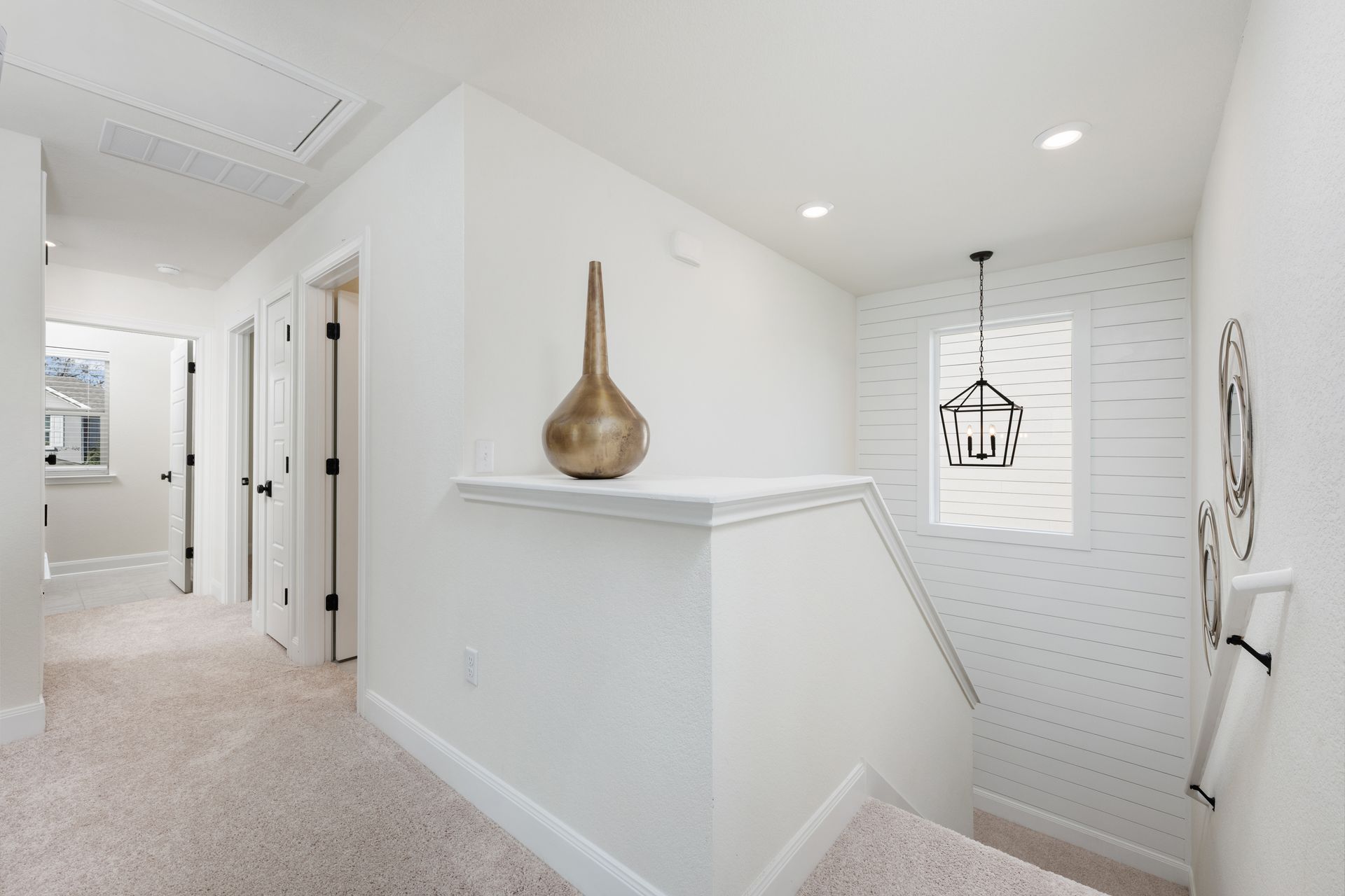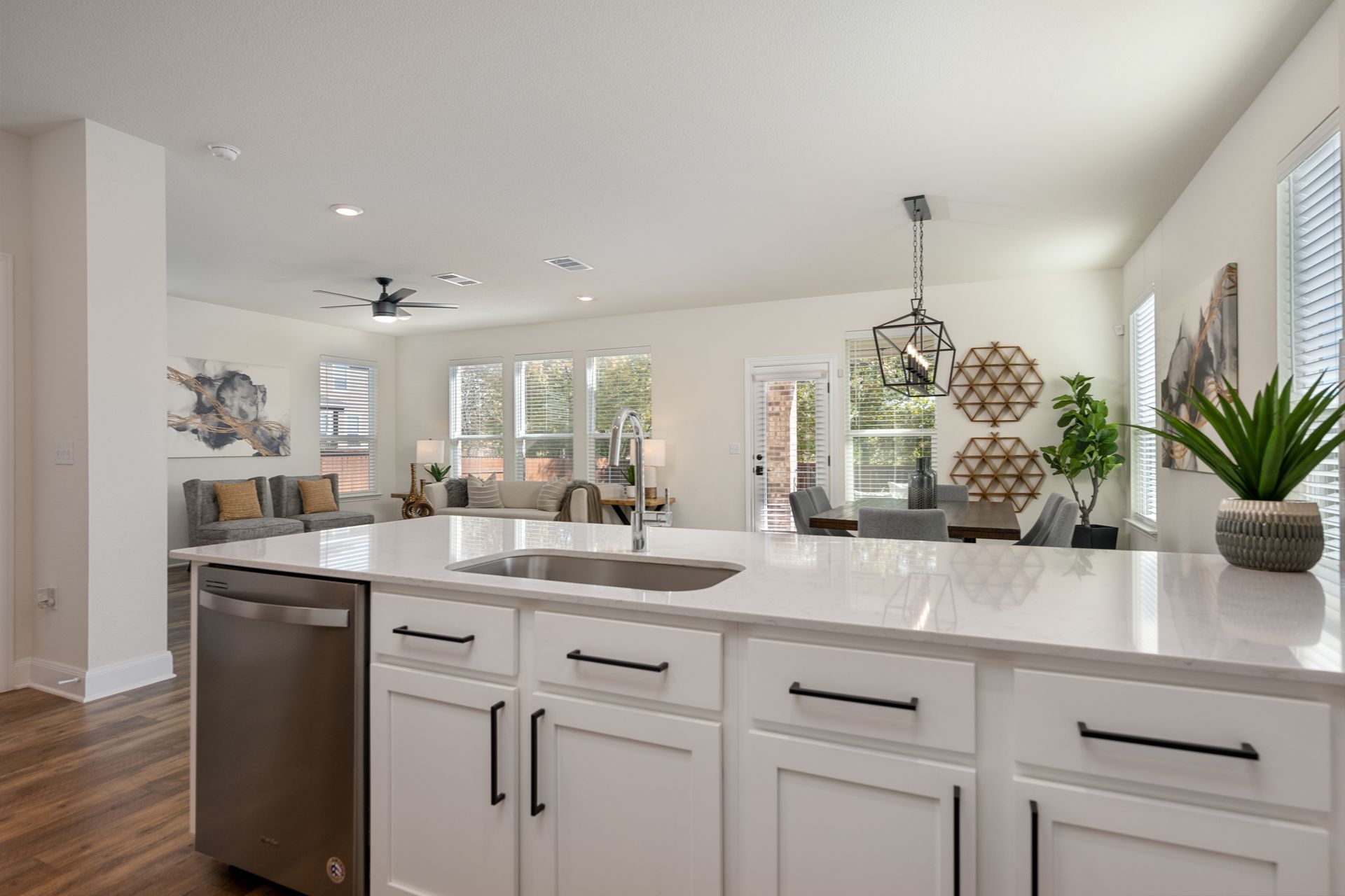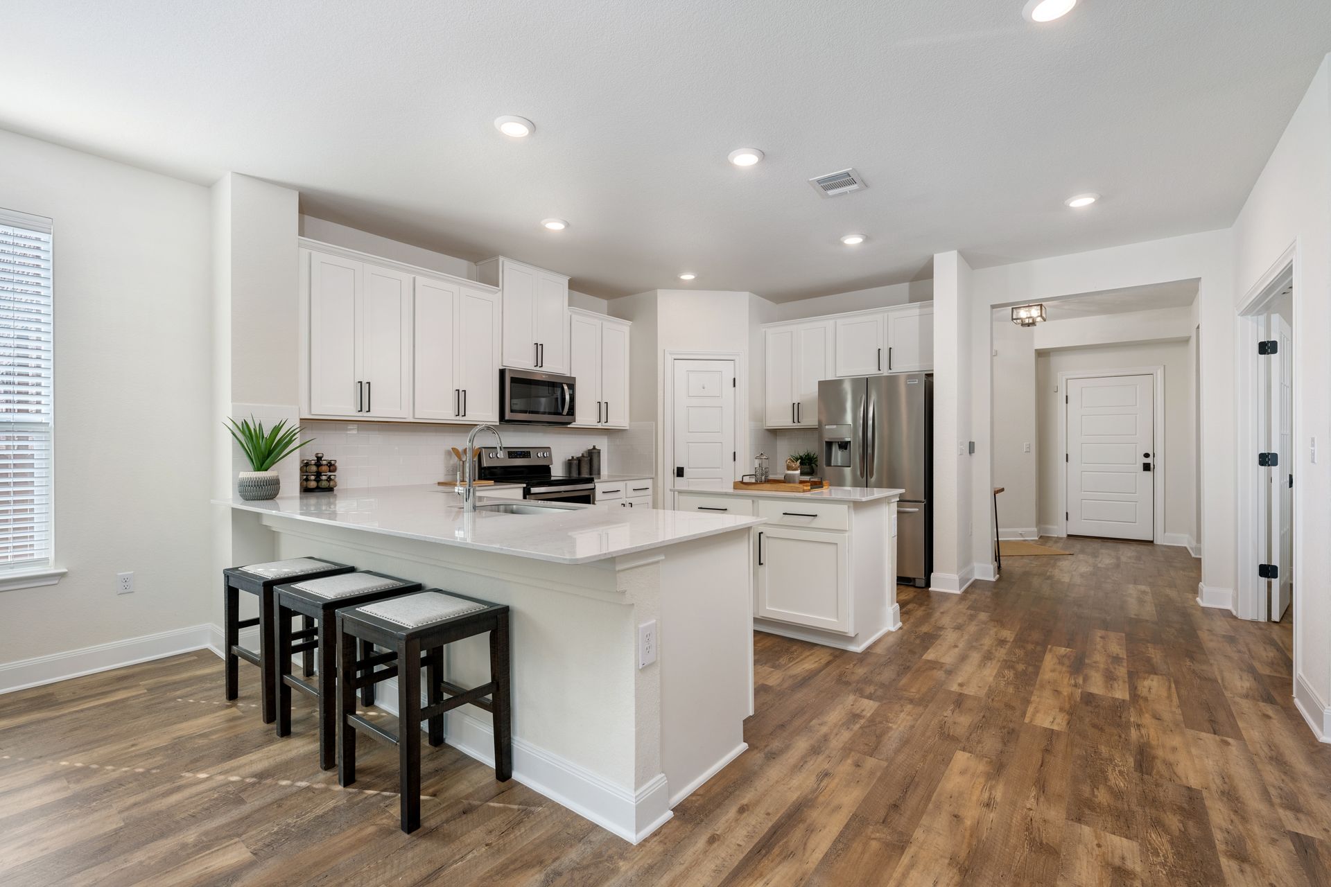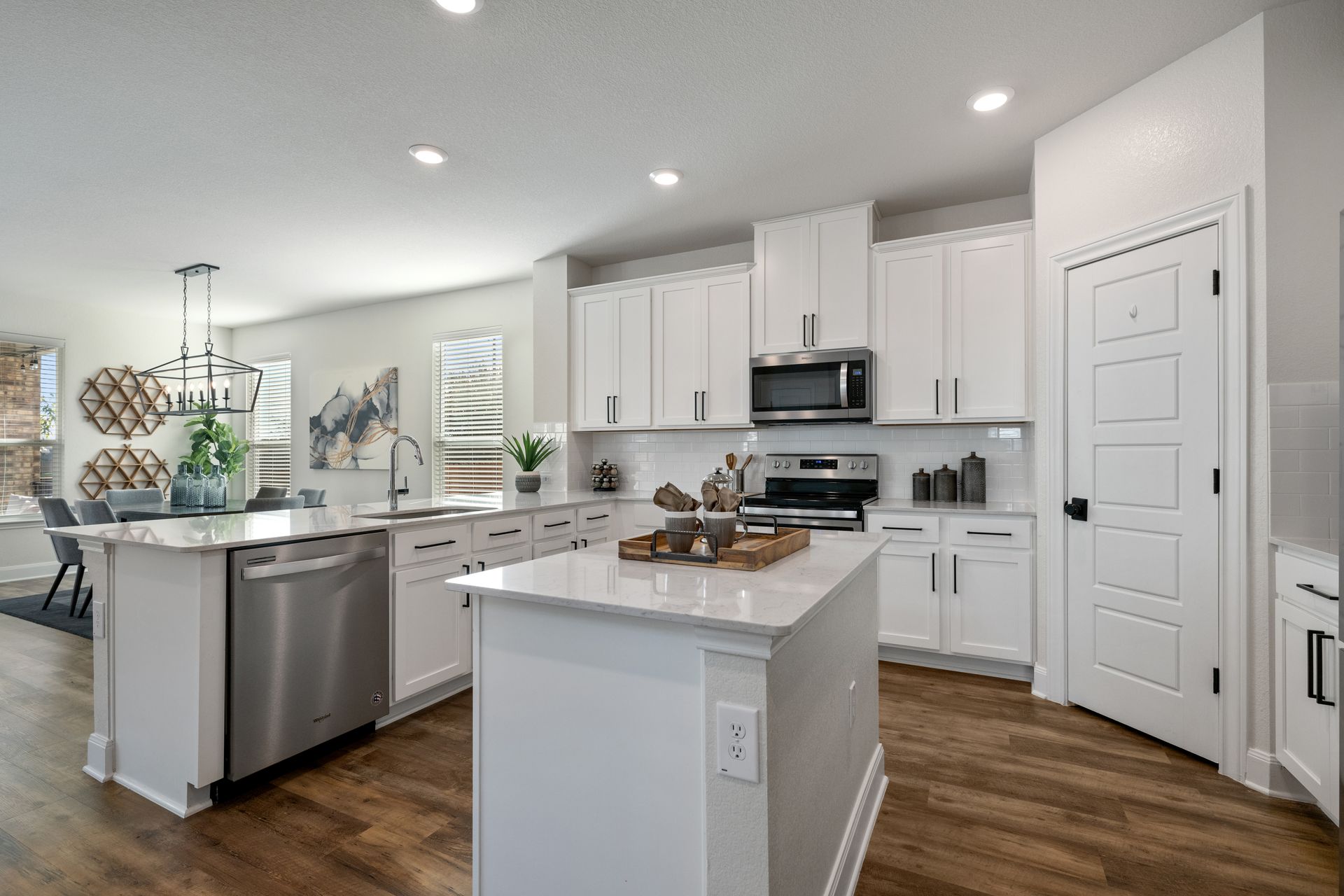 Stunning kitchen featuring white quartz countertops, subway tile backsplash and upgraded designer fixtures. Enjoy the convenience of a center island with ample storage, stainless steel appliances, a spacious walk-in pantry and under-counter lighting.