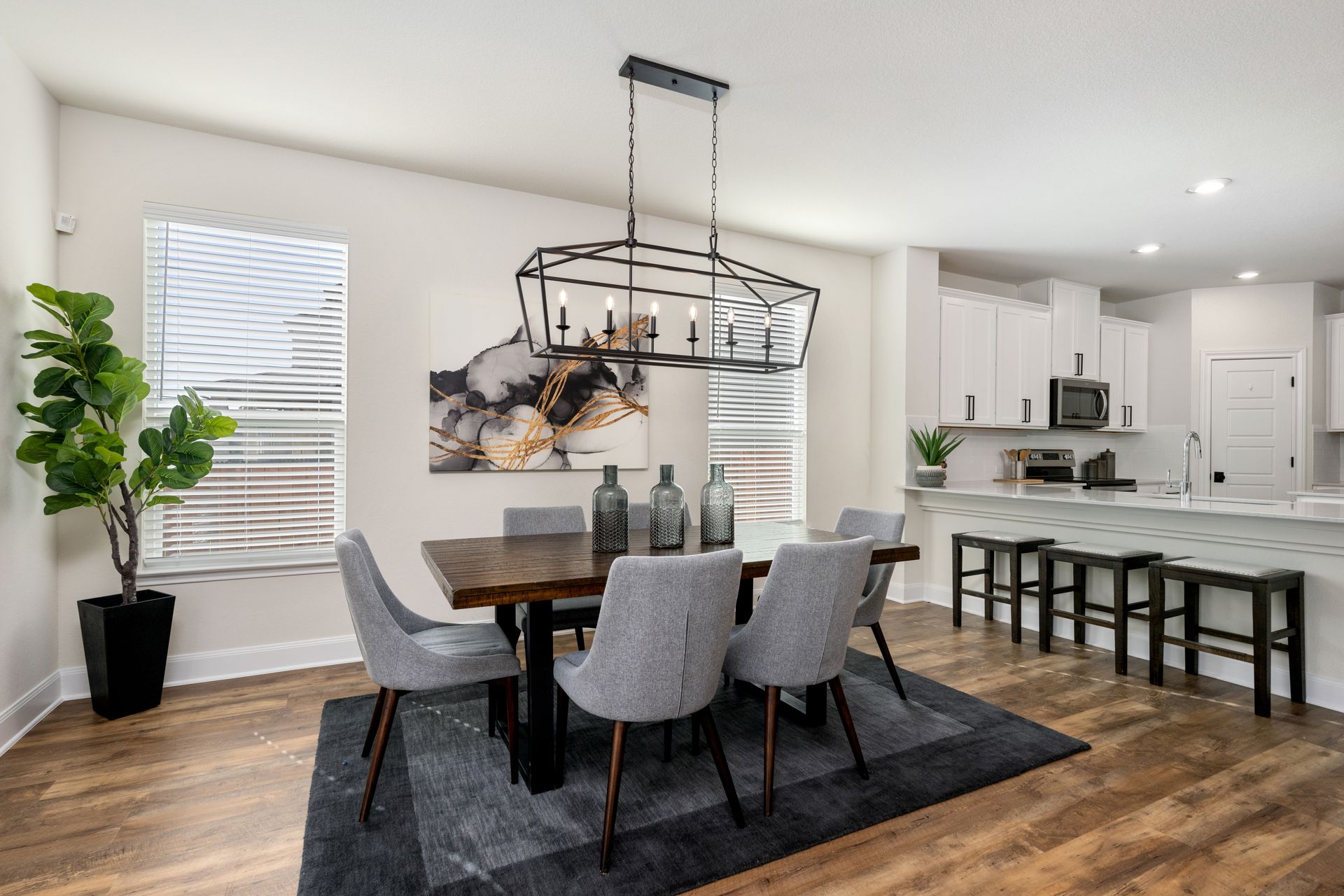 Generously sized, open main living/dining area adorned with wood plank laminate flooring throughout the entire first floor. Both living and dining, spans an impressive 28.5 feet by 16.5 feet, with a wall-of-windows inviting abundant natural light.