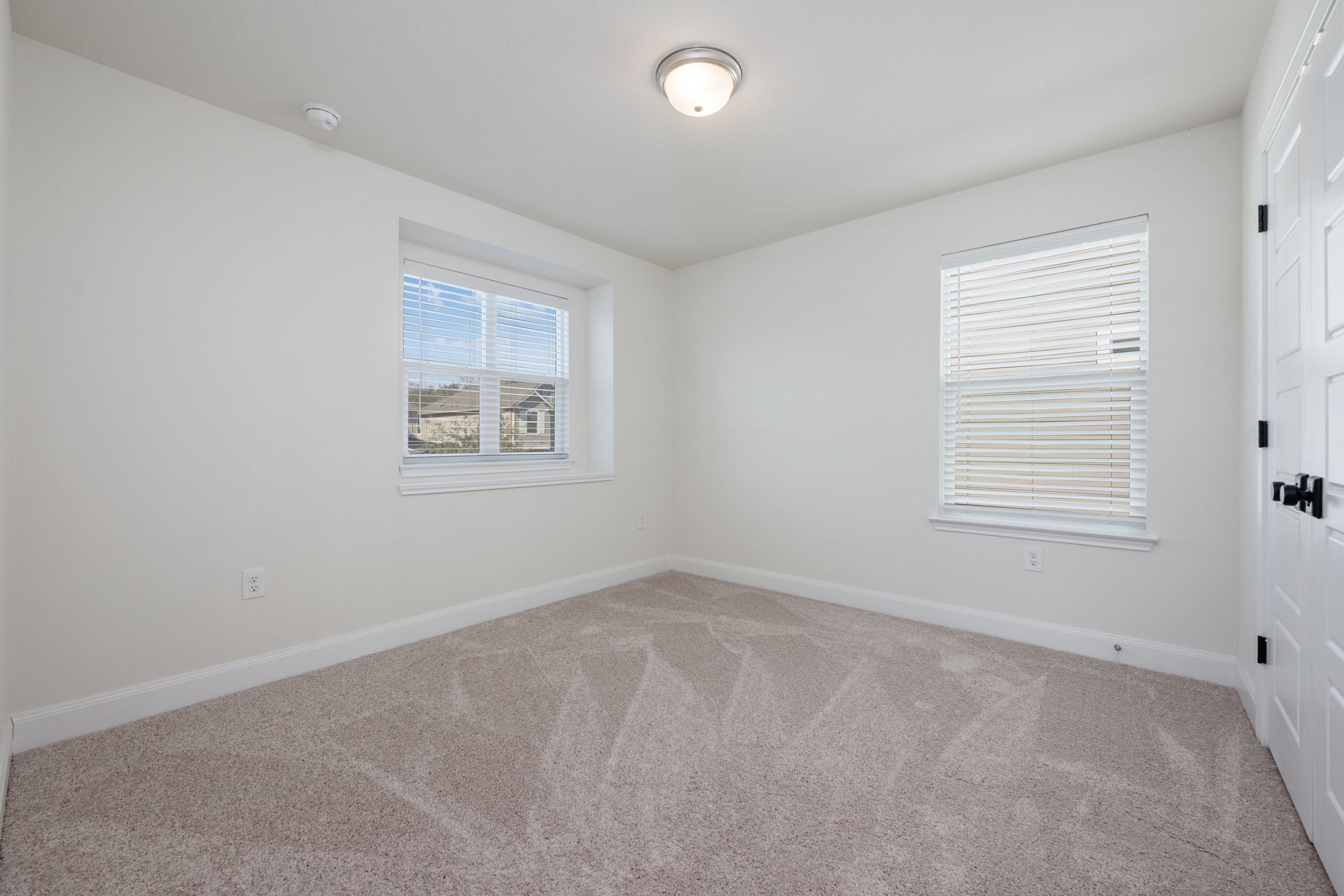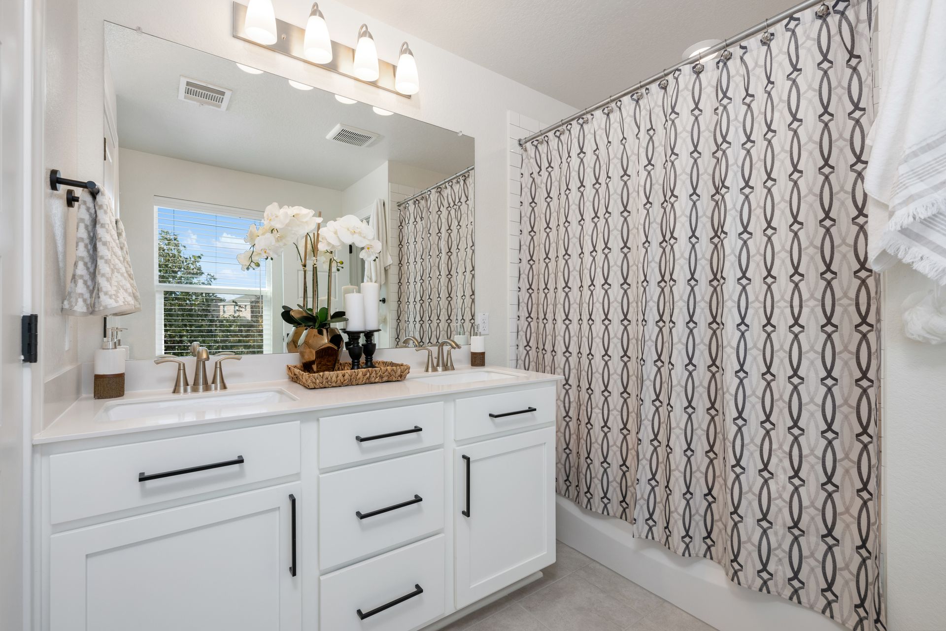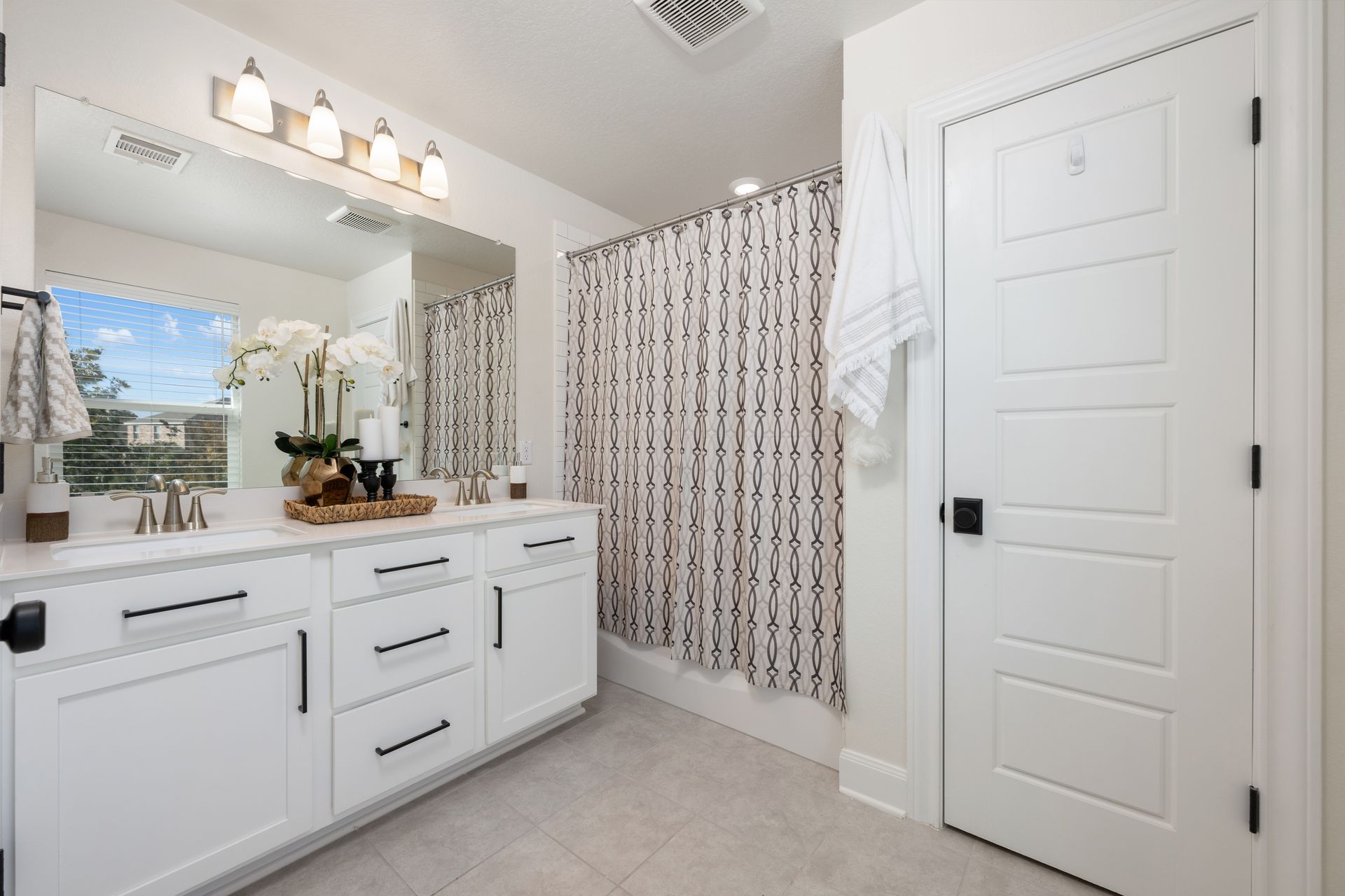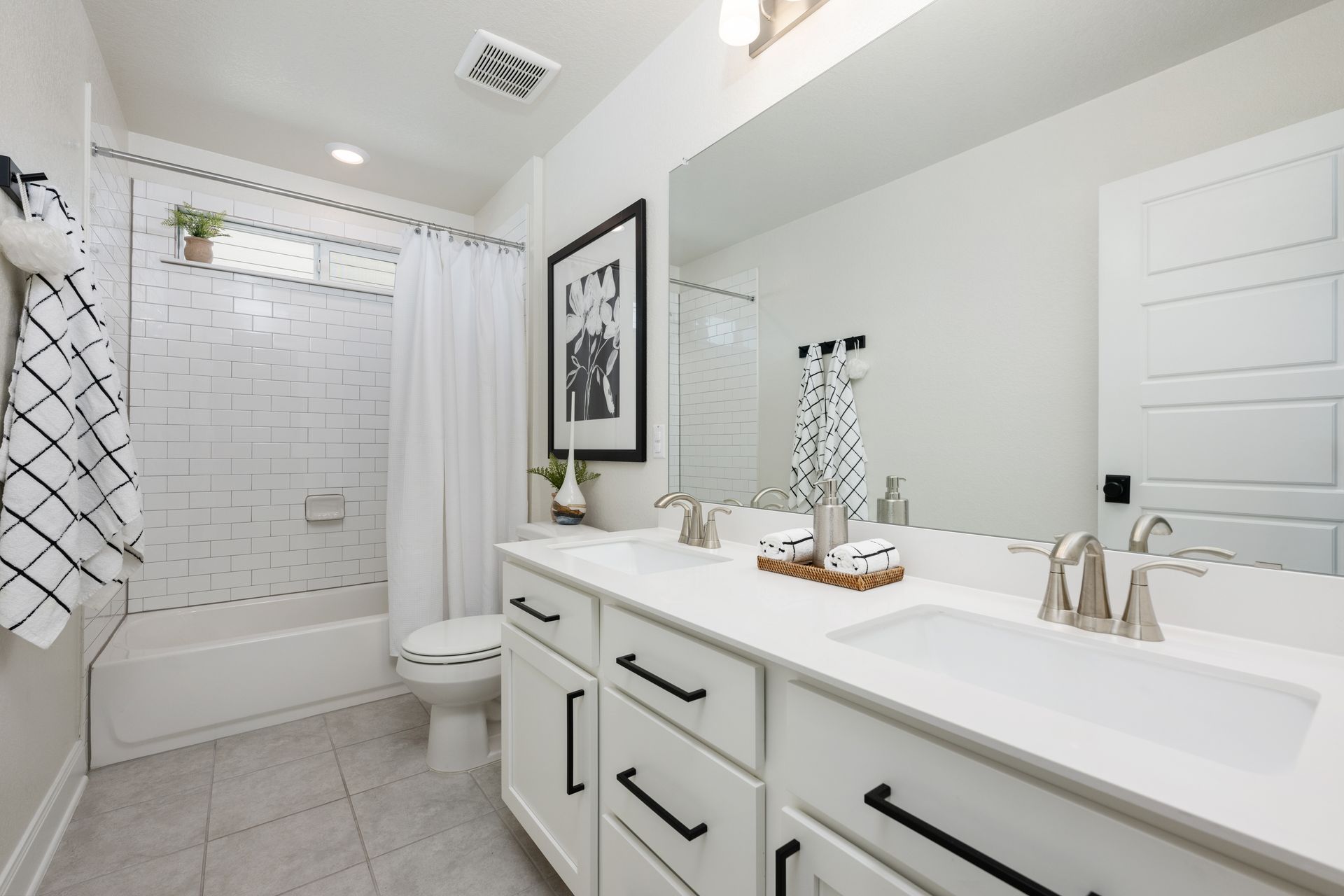 Bedrooms two and three share a full bathroom with dual vanity sinks, quartz countertops and subway tile.