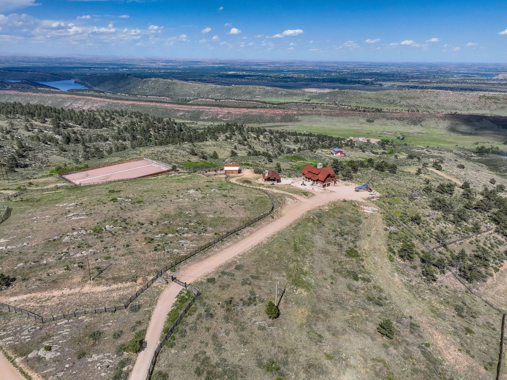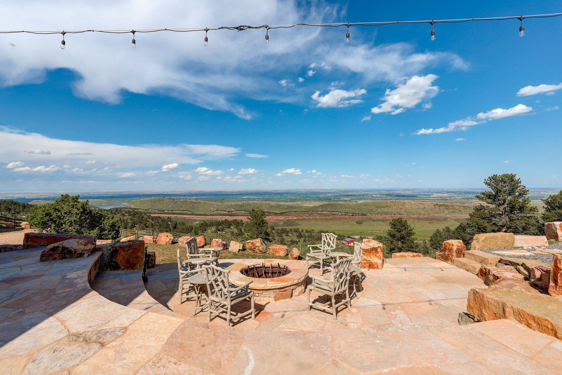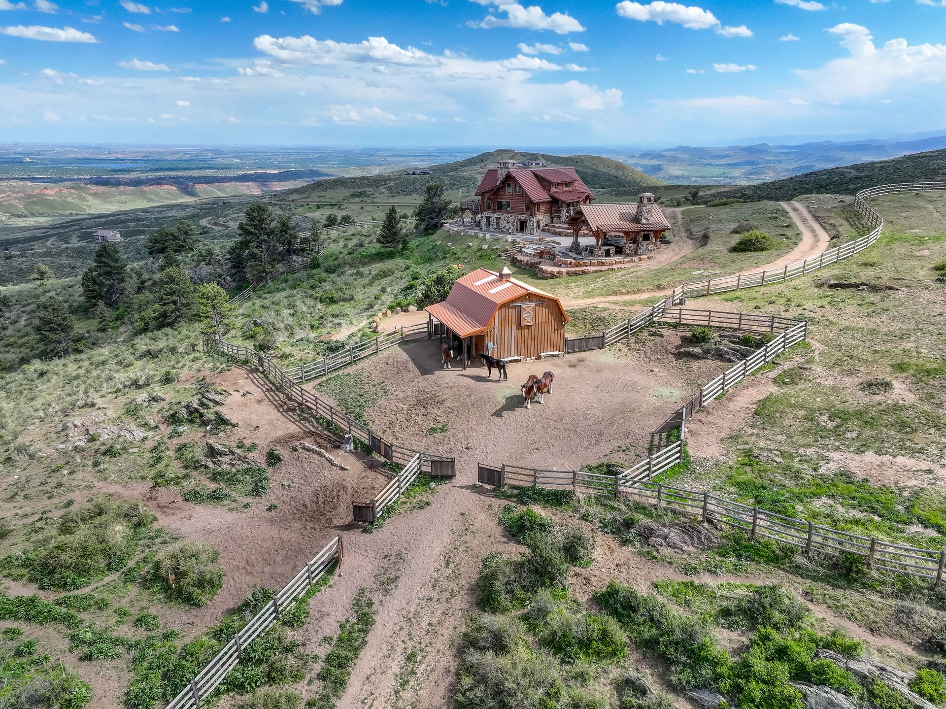 One-of-a-kind, exceptional equestrian estate spanning over 38 acres with 360-degree views. *Option to combine with a neighboring parcel for a total of 73 acres* Luxurious indoor/outdoor living at its finest, this estate combines mountain log home grandeur with the refined elegance of top-quality finishes. Utmost exclusion and privacy lie here behind the gates of this exclusive community. Upon entering the property, you will be WOW'd by views framed by the accordion doors creating walls of glass that make up the entire east side of the home. The kitchen has been outfitted with premium appliances, including Subzero, Meile and AGA. Eye-catching copper and reclaimed wood countertops on the large center prep island make up this opulent space. Seamless flow to the great room highlighted by soaring, beamed ceilings. The main level primary suite boasts unbeatable views of Horsetooth Reservoir, deck access and loft. Sumptuous copper soaking tub in the luxe five-piece bath which also features a rain shower. The walk-out lower level makes for another great entertaining space with wet bar and two secondary bedrooms with outdoor access. The equestrian facilities are state of the art and offer a heated, two-stall barn with auto water and comfort mats. Full-size dressage riding arena with round pen and plenty of warm-up space. You will love the outdoor entertaining space in this breathtaking setting that has every amenity imaginable: a huge, well-appointed kitchen with Viking appliances, wood pizza oven, wood fire pit, lighting and a sound system. The city lights below provide a priceless backdrop for sophisticated entertaining and stylish living.