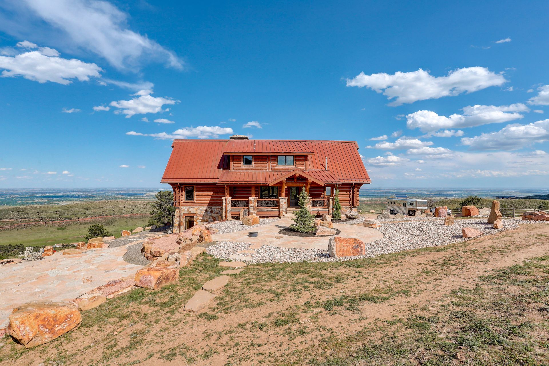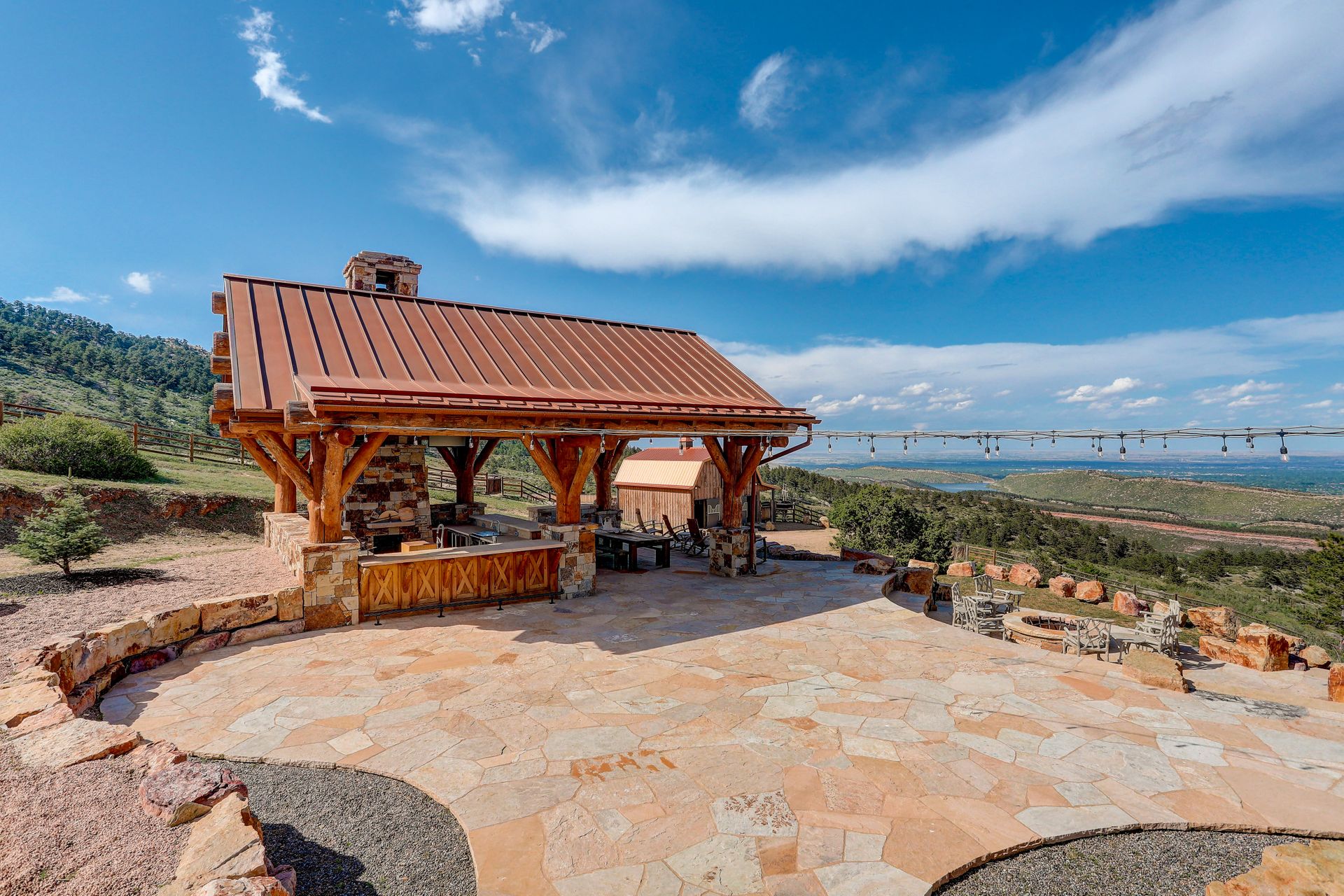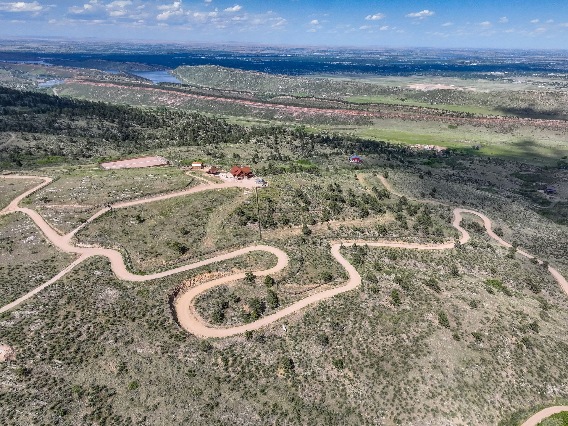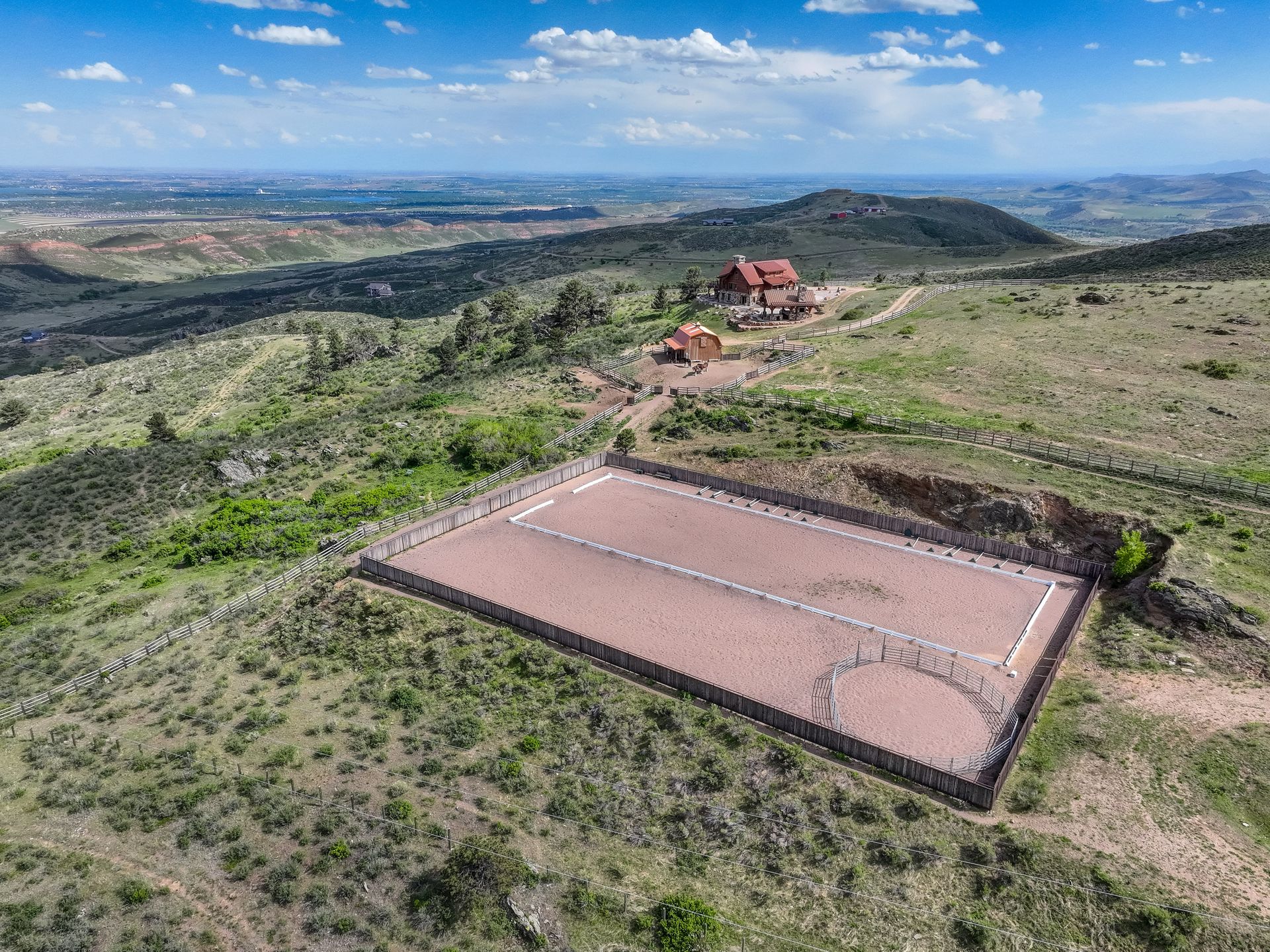One-of-a-kind, exceptional equestrian estate spanning over 38 acres with 360-degree views. *Option to combine with a neighboring parcel for a total of 73 acres* Luxurious indoor/outdoor living at its finest, this estate combines mountain log home grandeur with the refined elegance of top-quality finishes. Utmost exclusion and privacy lie here behind the gates of this exclusive community. Upon entering the property, you will be WOW'd by views framed by the accordion doors creating walls of glass that make up the entire east side of the home. The kitchen has been outfitted with premium appliances, including Subzero, Meile and AGA. Eye-catching copper and reclaimed wood countertops on the large center prep island make up this opulent space. Seamless flow to the great room highlighted by soaring, beamed ceilings. The main level primary suite boasts unbeatable views of Horsetooth Reservoir, deck access and loft. Sumptuous copper soaking tub in the luxe five-piece bath which also features a rain shower. The walk-out lower level makes for another great entertaining space with wet bar and two secondary bedrooms with outdoor access. The equestrian facilities are state of the art and offer a heated, two-stall barn with auto water and comfort mats. Full-size dressage riding arena with round pen and plenty of warm-up space. You will love the outdoor entertaining space in this breathtaking setting that has every amenity imaginable: a huge, well-appointed kitchen with Viking appliances, wood pizza oven, wood fire pit, lighting and a sound system. The city lights below provide a priceless backdrop for sophisticated entertaining and stylish living.