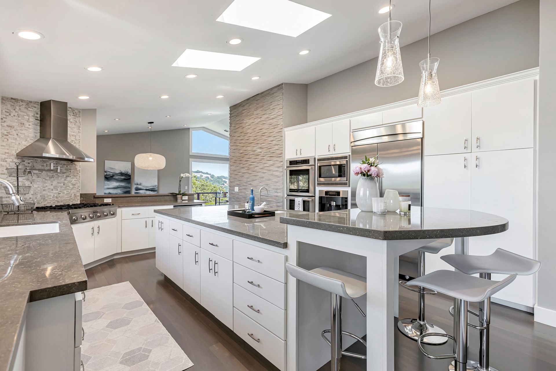 The upstairs level features the main living room, dining room, laundry room, and great room off the kitchen, allowing ample room for work, play, and hosting large get-togethers. The kitchen boasts high-end Thermador appliances, a breakfast bar, two dishwashers, and a built-in Miele coffee maker for your morning cappuccino, espresso, or coffee, all powered by solar panels.