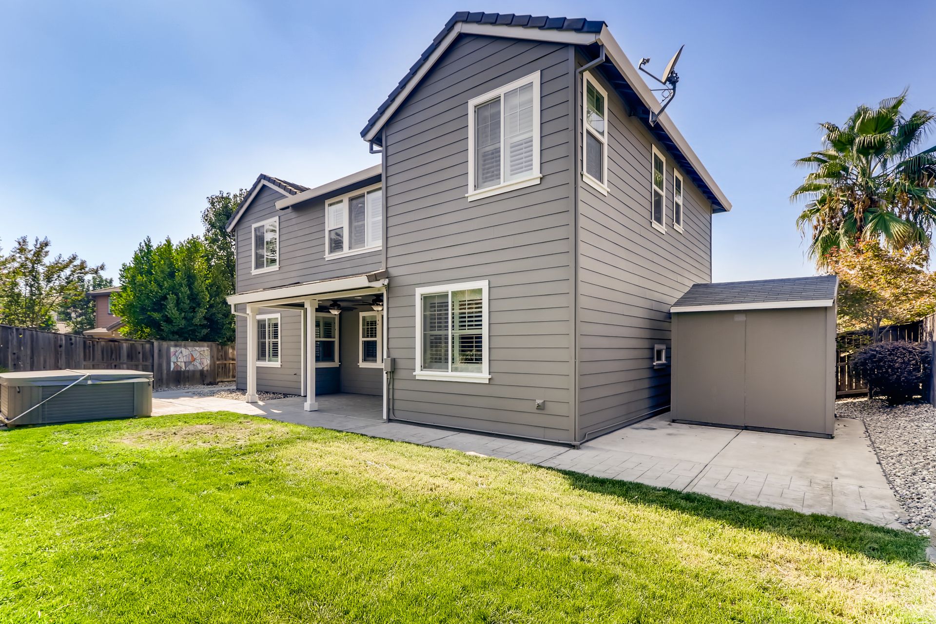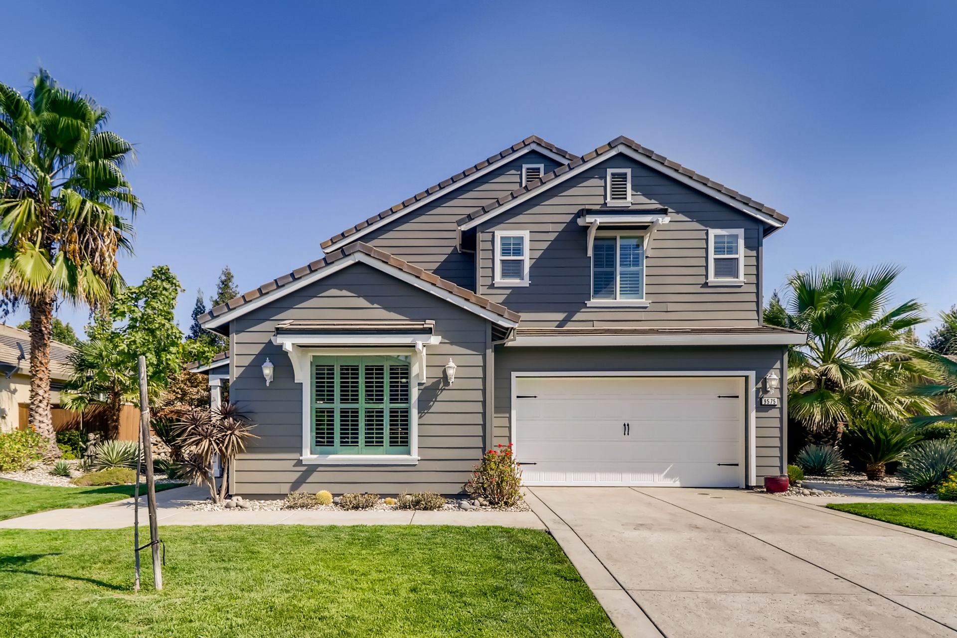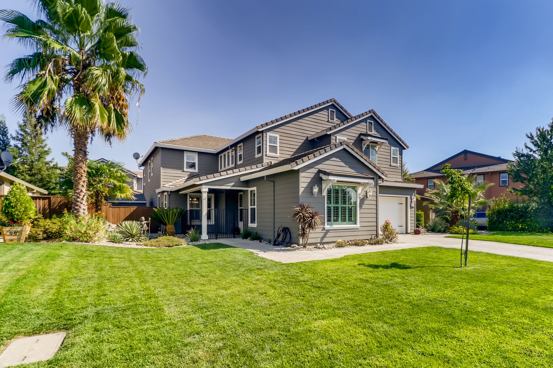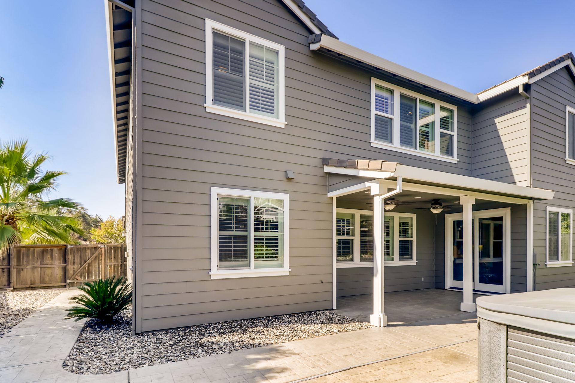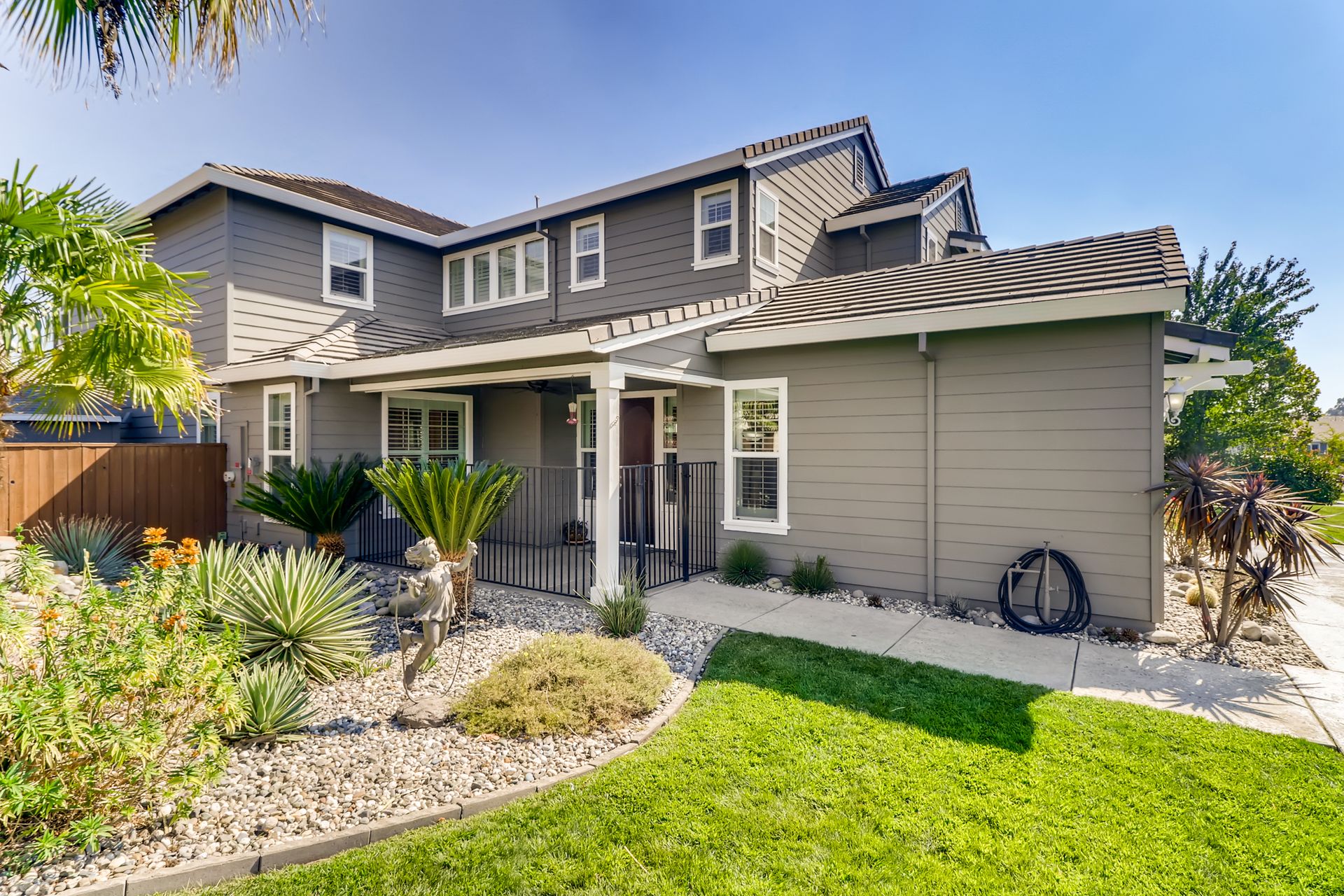 Home shows like a model! Gated courtyard in front of home, surrounding concrete hand stamped with a custom sea-shell design, and a long lasting tile roof. Recently painted both inside and out. Enjoy amazingly low utility bills, own your own solar and no Mello-Roos. This elegant home features over $100k in upgrades throughout such as a formal living with hand scraped walnut wood flooring, a vaulted ceiling, the separate dining room just off the grand hall, a dramatic hardwood staircase with custom iron work and wood banisters, large designer tile flooring, 5 inch wide baseboards and oversized front door. An entertainer's dream kitchen features maple cabinets w/toffee stain & old antique hardware, built in stainless steel appliances, a 5 burner gas range, Granite counters w/tumbled brick back splash, Huge kitchen island with sink and Recessed lighting. The family room has a Gas fireplace with hearth. Hand scraped walnut wood flooring throughout the house, plantation shutters, upstairs laundry, a Downstairs bedroom and full bath. Large covered patio in back with ample lighting and multiple ceiling fans. Storage shed built to match on side of property. 5 bedrooms, 4 full baths, 3 car garage on over 10,000 SF lot with plenty of room for RV and/or Boat storage on right side of home. Close to Morgan Creek Golf Club, parks and walking trails. Community backs to wild life preserve.