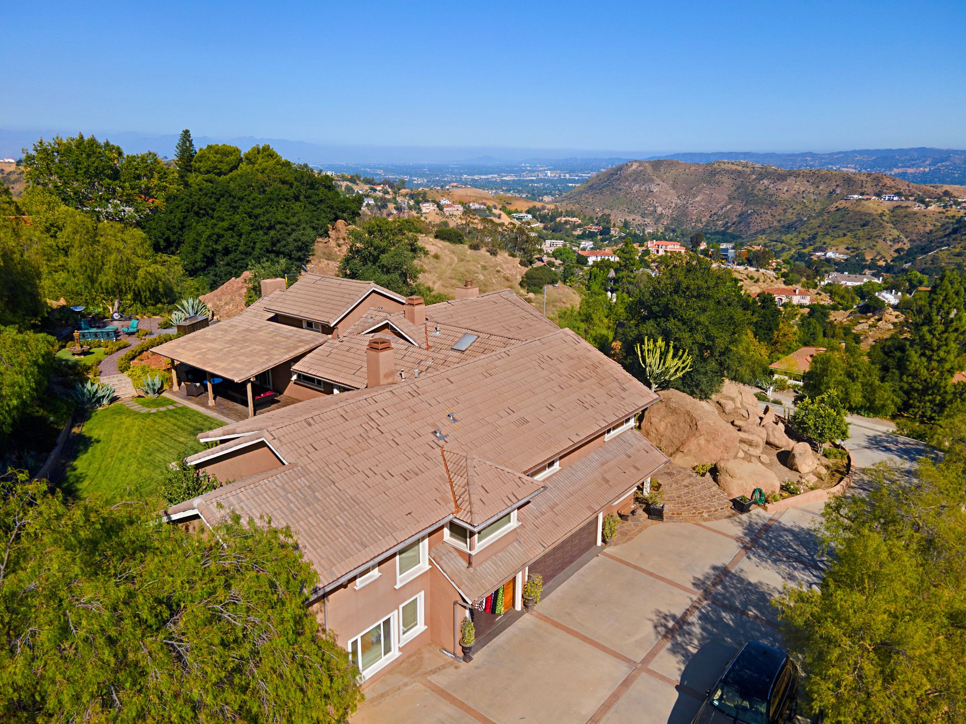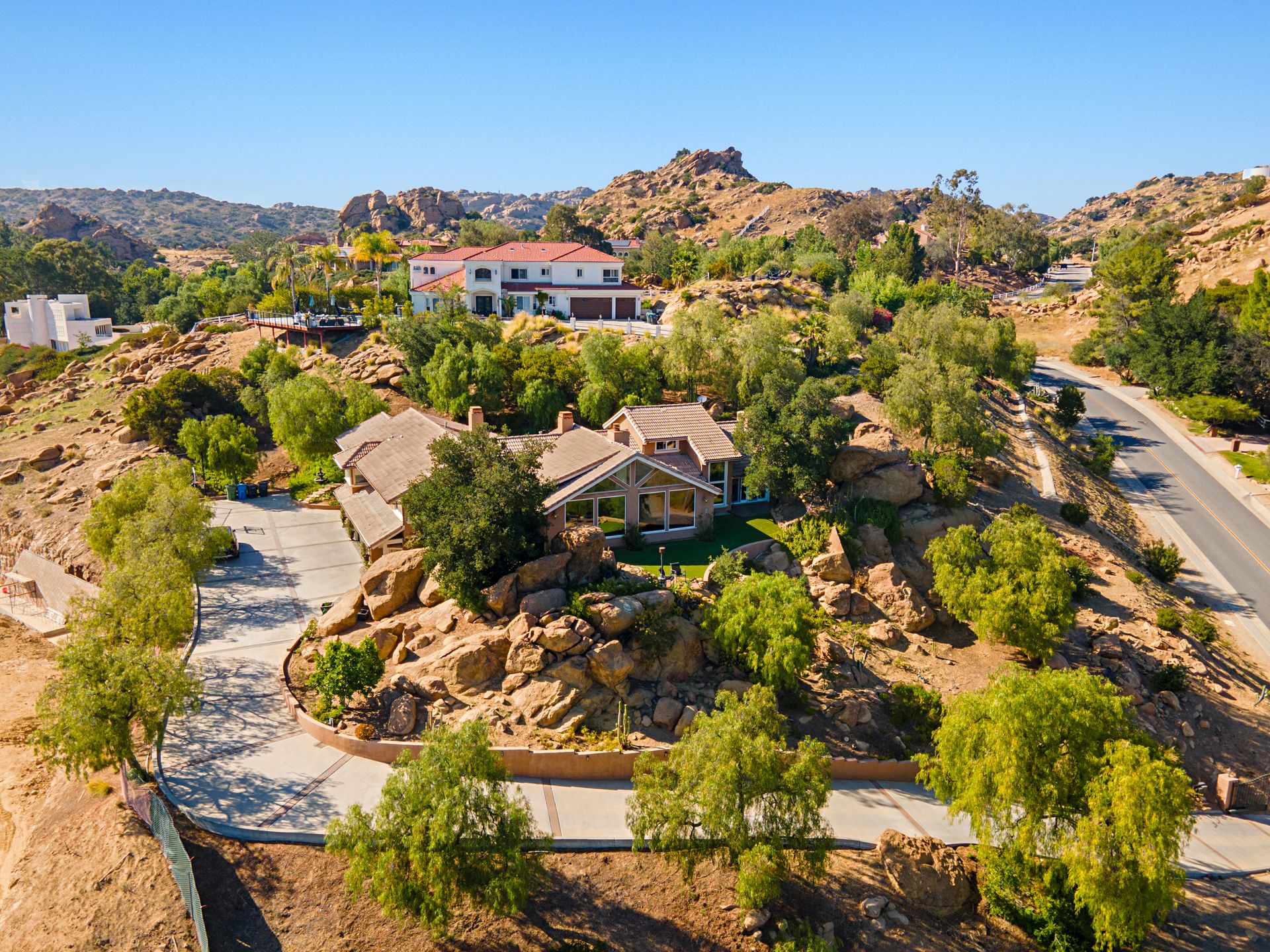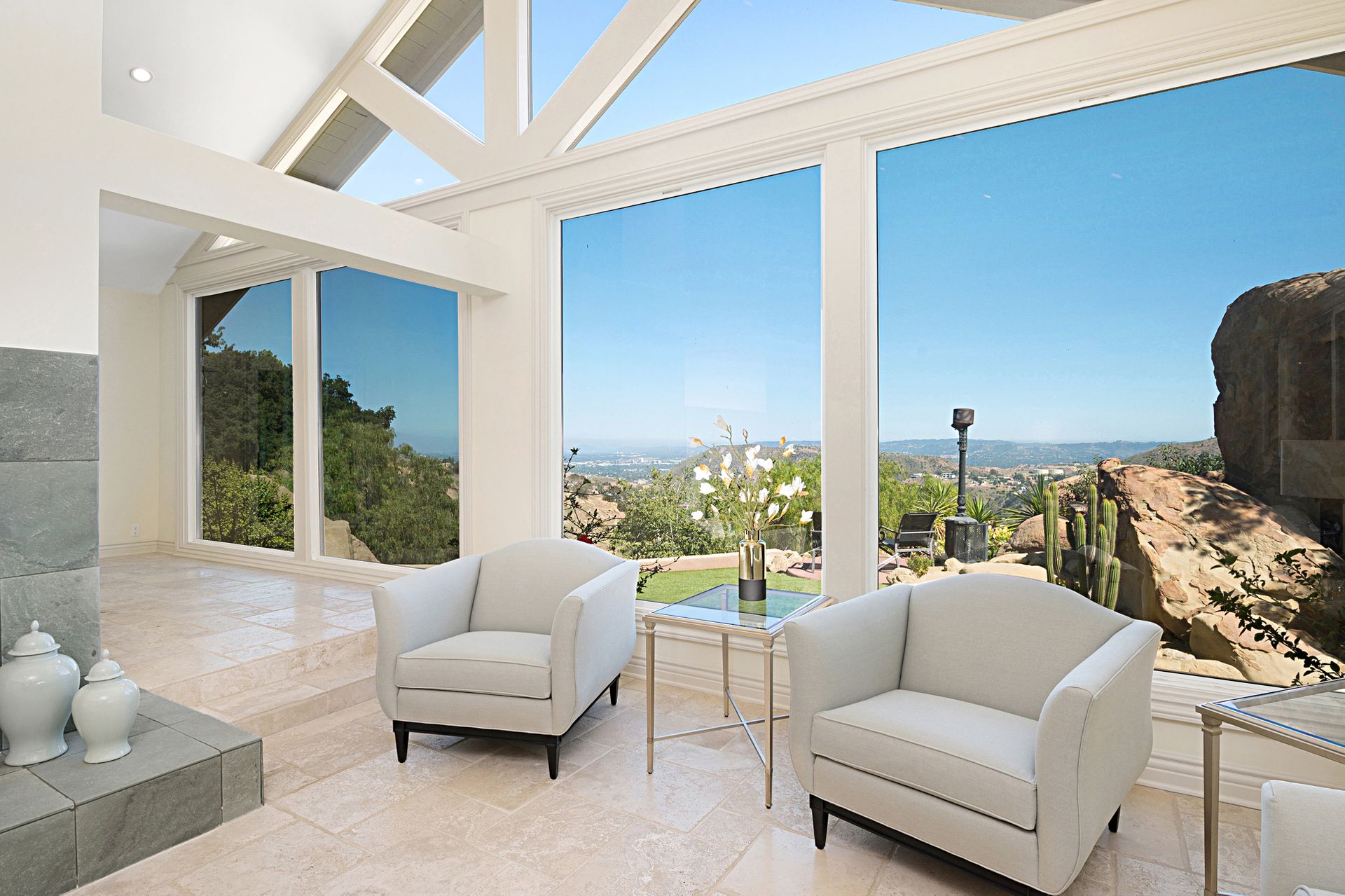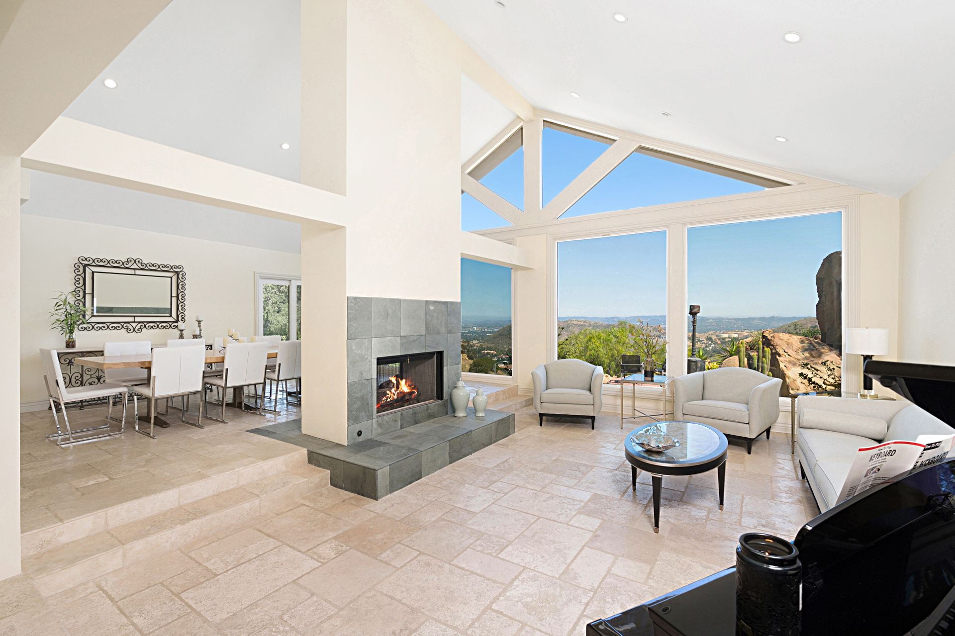 This stunning 4-bedroom estate nestled in the gated community of Bell Canyon offers unparalleled views of the canyon, boulders, and cityscape. Stepping into the grand living and dining areas, you're greeted by soaring cathedral wood ceilings and a double-sided slate fireplace. Floor-to-ceiling windows merge indoor and outdoor living, bathing the space in natural light.