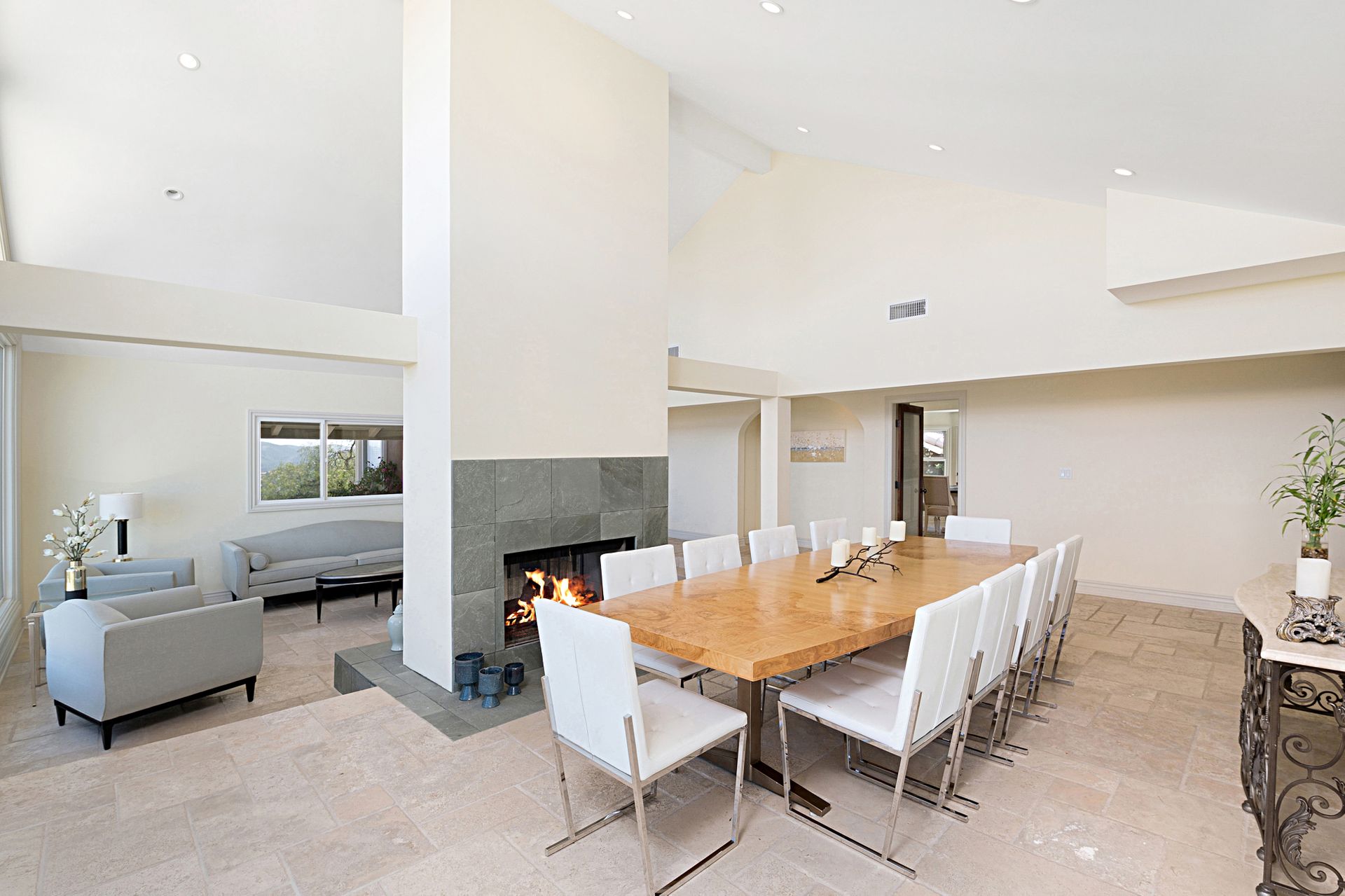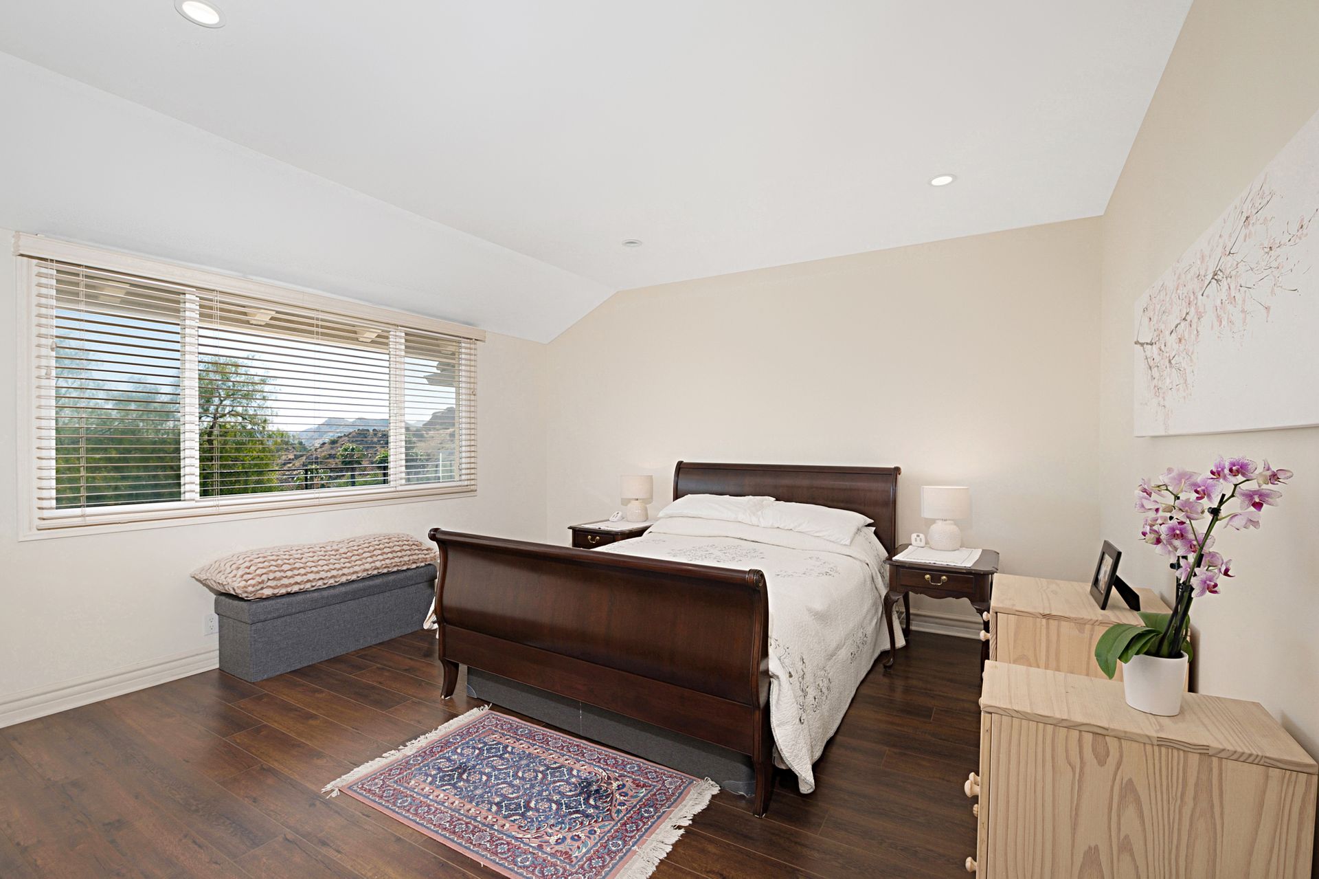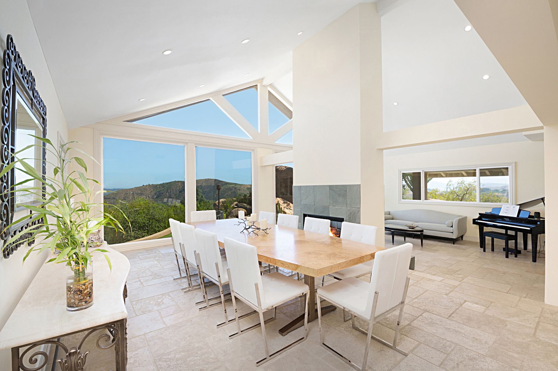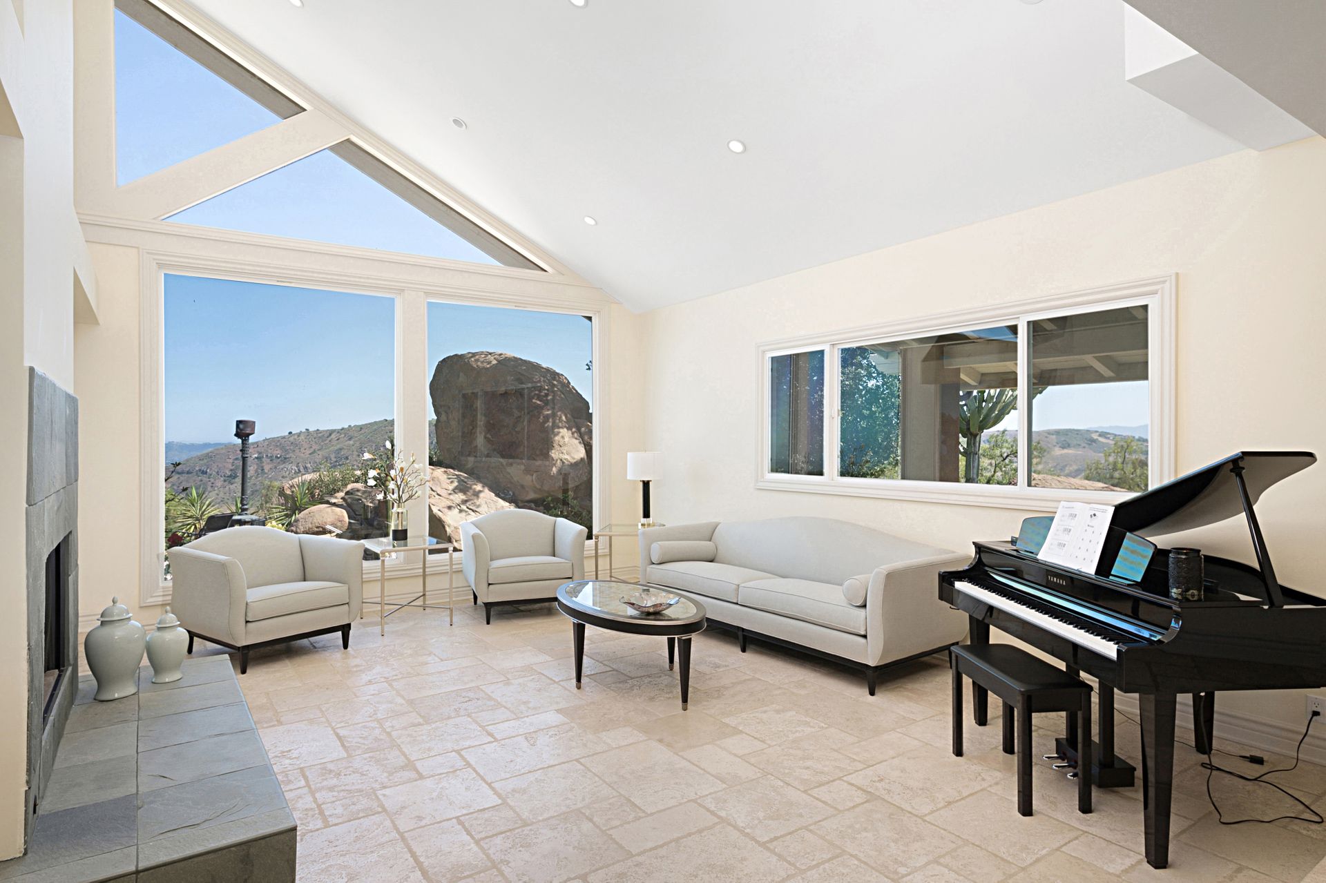 This stunning 4-bedroom estate nestled in the gated community of Bell Canyon offers unparalleled views of the canyon, boulders, and cityscape. Stepping into the grand living and dining areas, you're greeted by soaring cathedral wood ceilings and a double-sided slate fireplace. Floor-to-ceiling windows merge indoor and outdoor living, bathing the space in natural light.