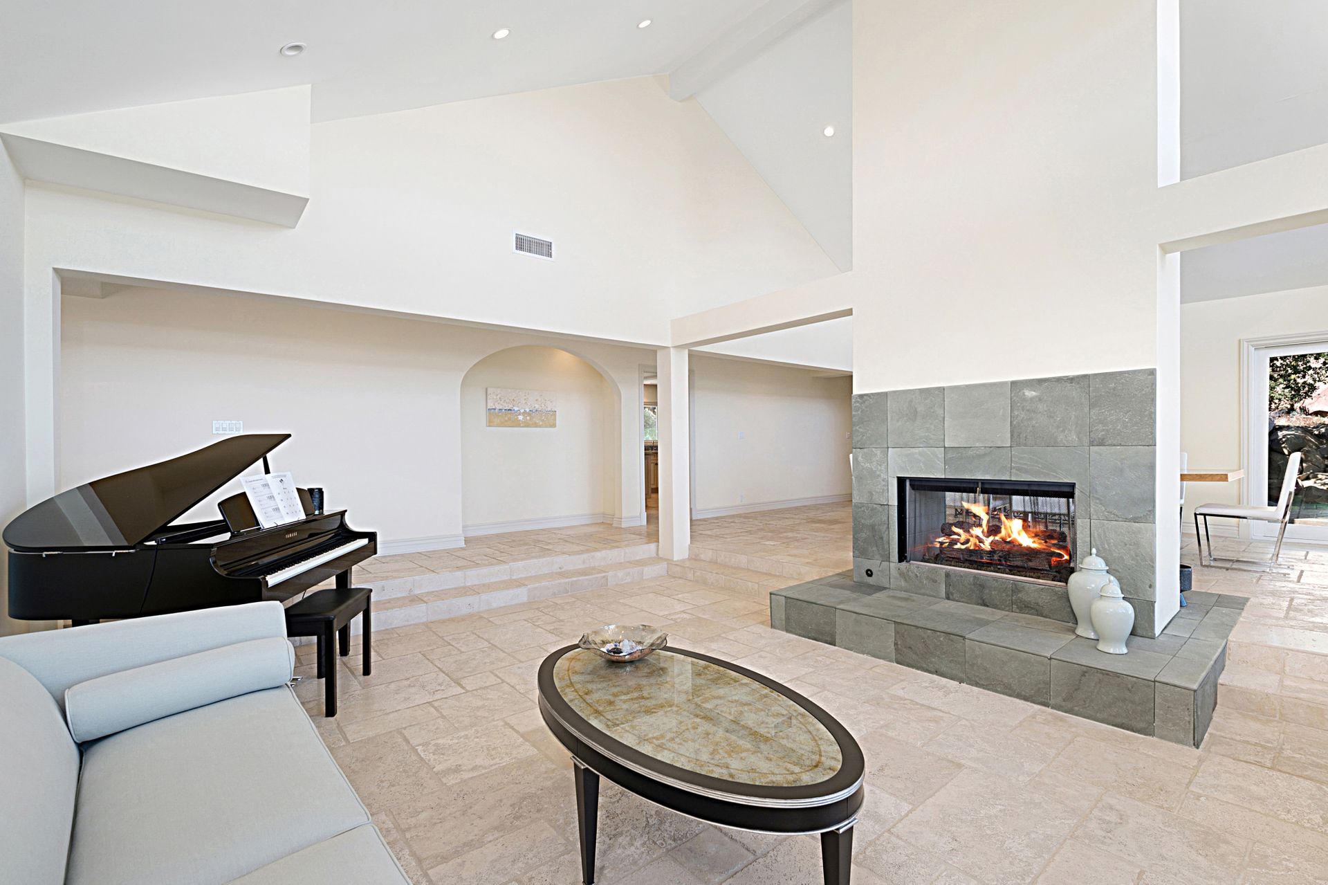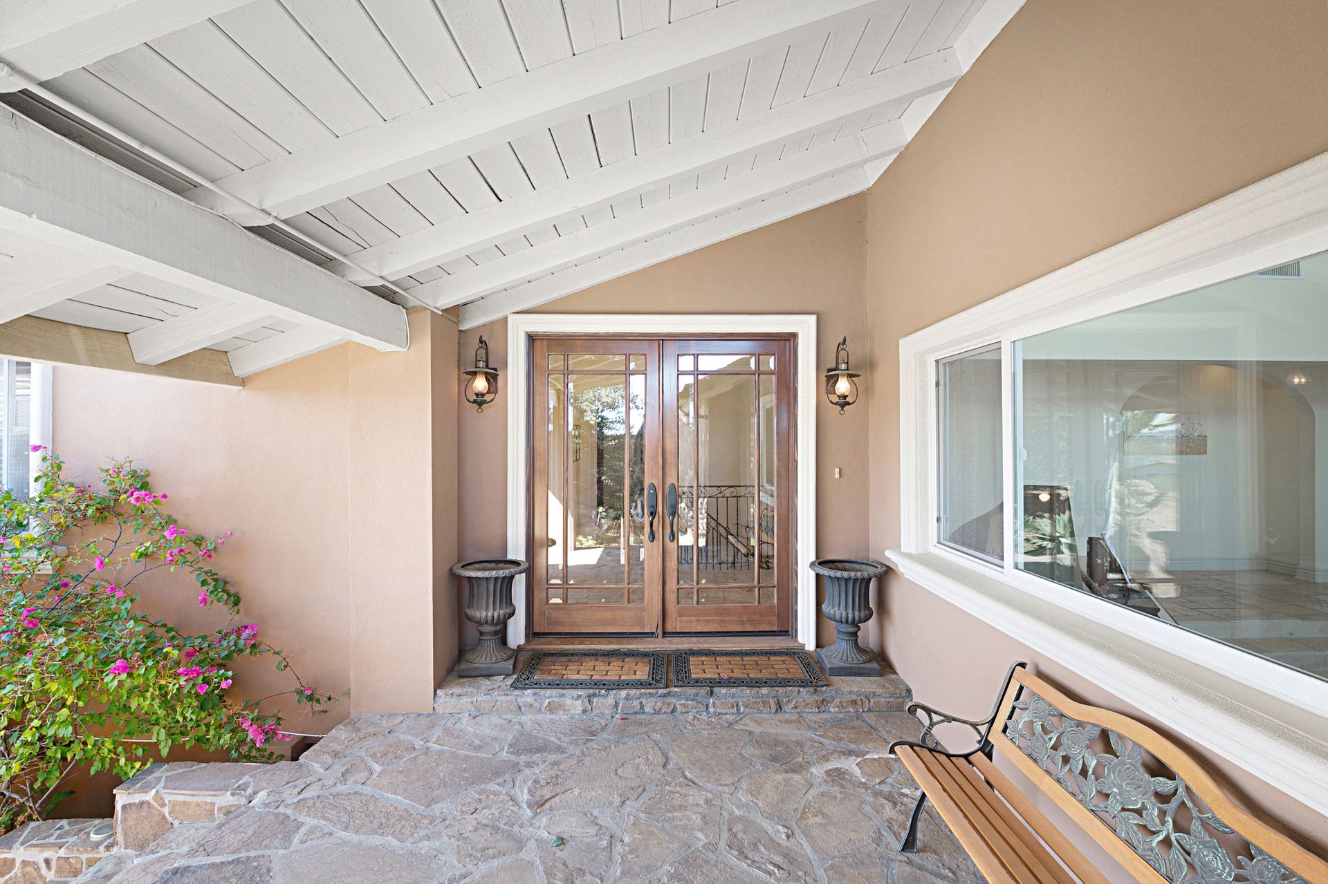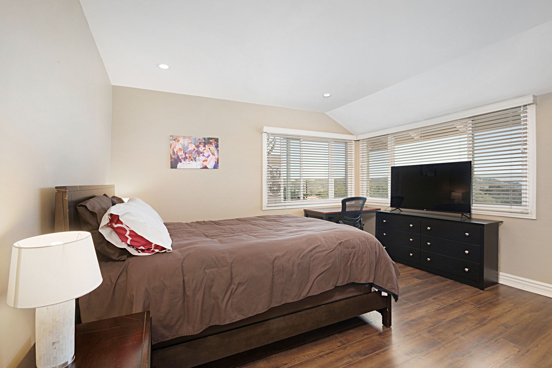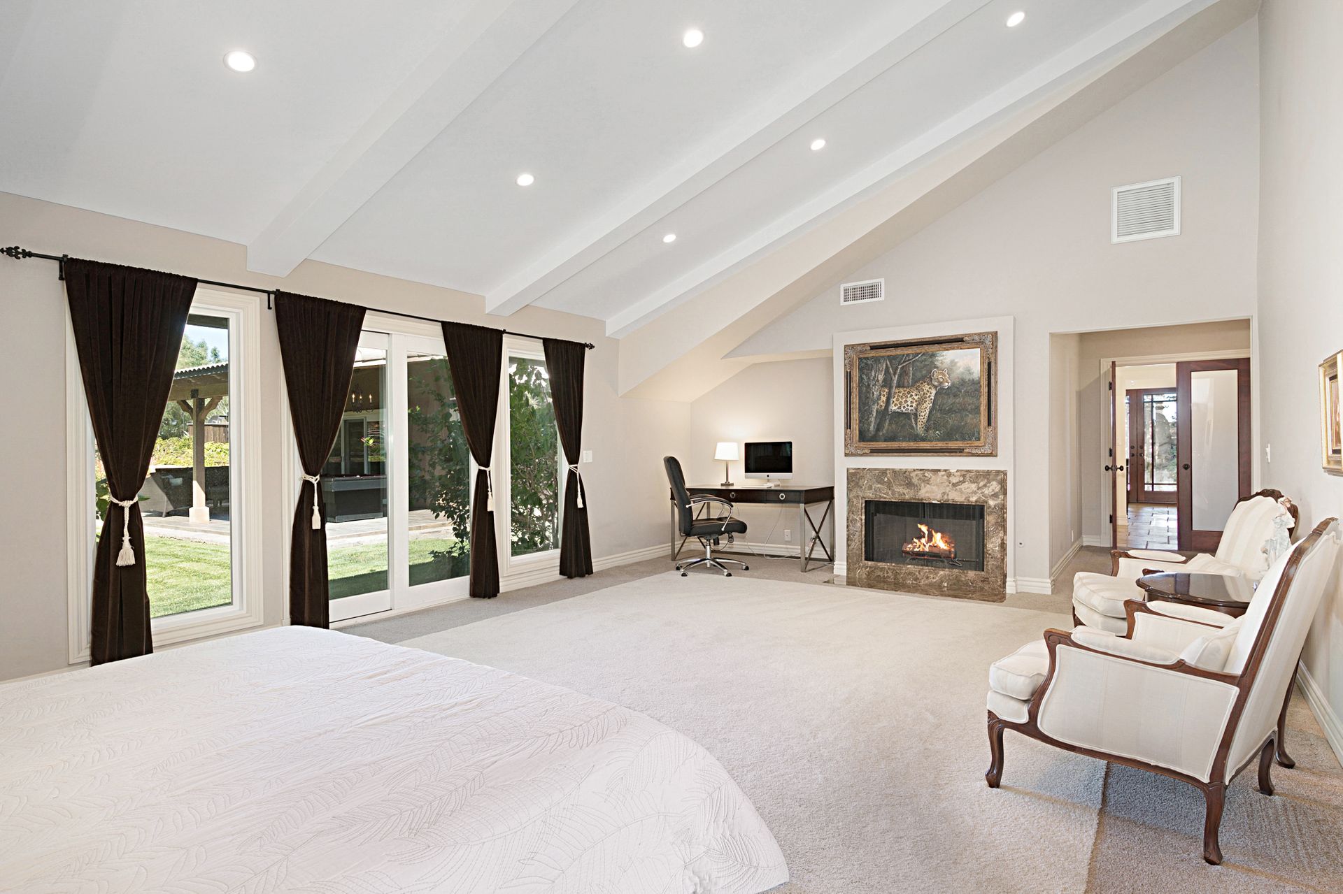 This stunning 4-bedroom estate nestled in the gated community of Bell Canyon offers unparalleled views of the canyon, boulders, and cityscape. Stepping into the grand living and dining areas, you're greeted by soaring cathedral wood ceilings and a double-sided slate fireplace. Floor-to-ceiling windows merge indoor and outdoor living, bathing the space in natural light.