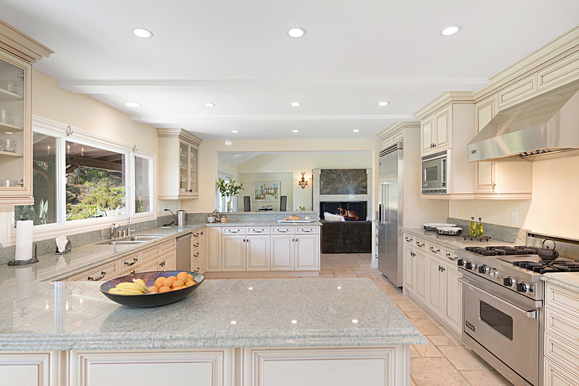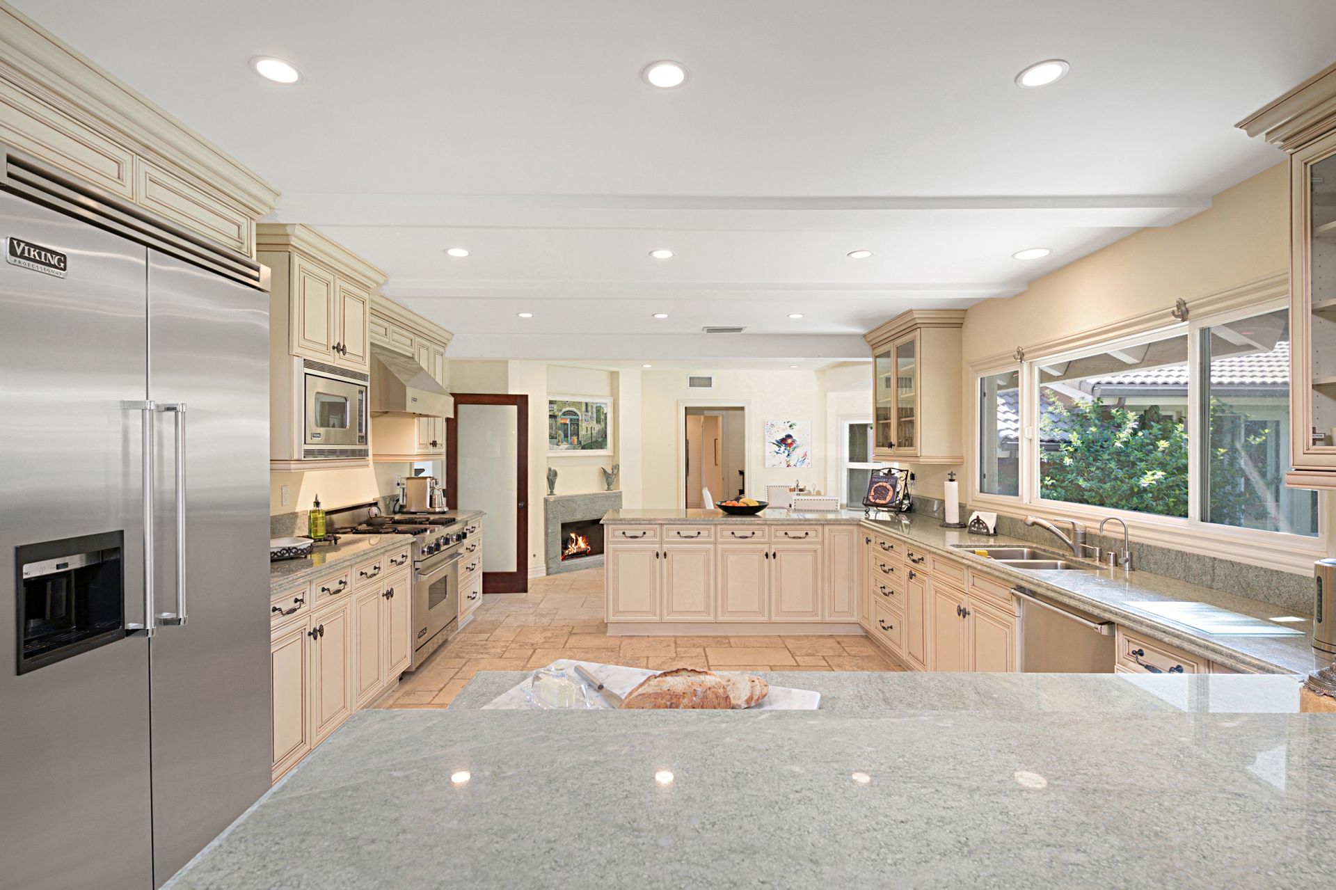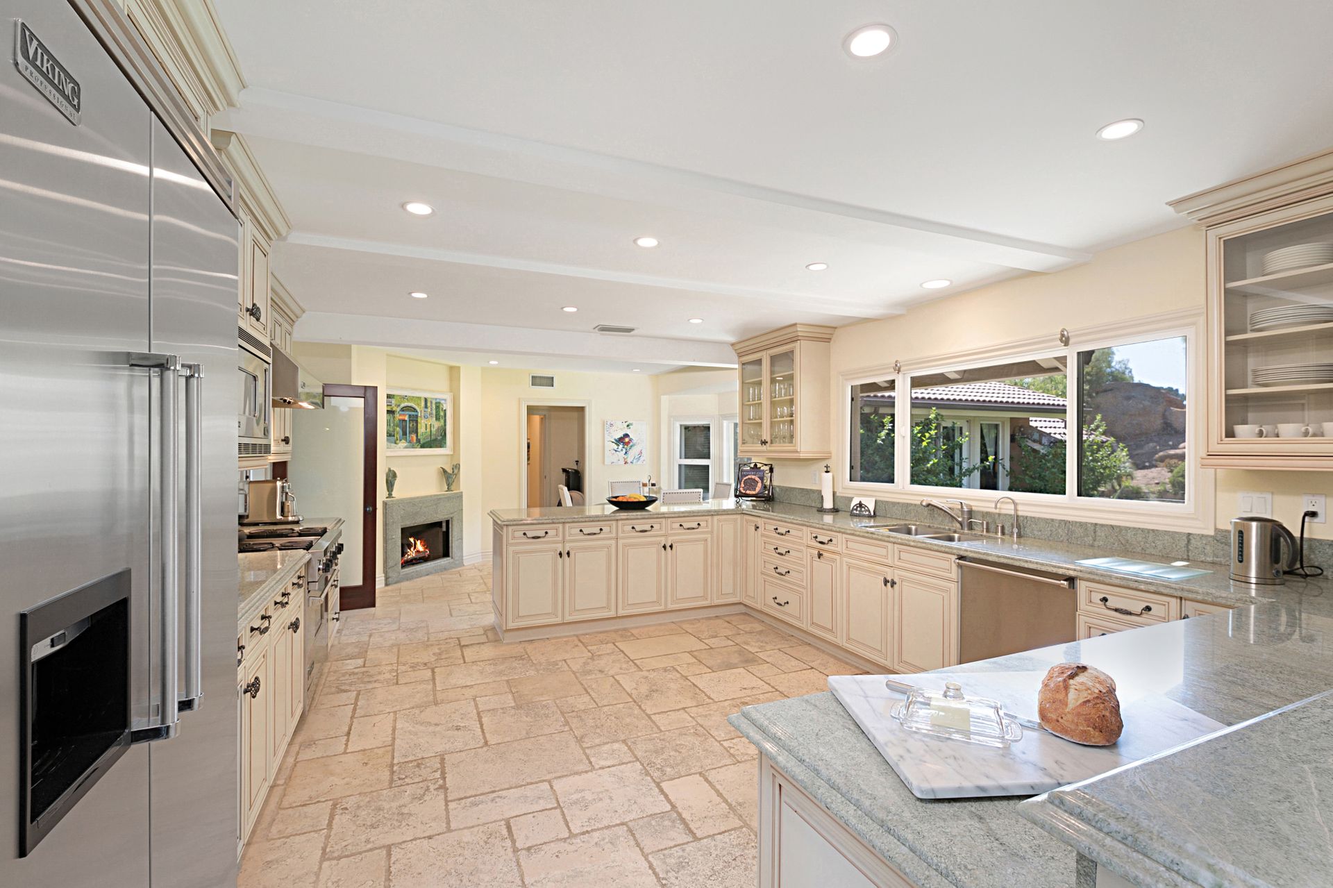 Travertine floors grace the living spaces, including the expansive gourmet kitchen featuring Viking appliances, granite countertops, custom cabinets, and a cozy fireplace-adorned breakfast nook. Flowing from the kitchen, the family room boasts a majestic marble and granite fireplace with a raised hearth, perfect for cozy gatherings. Ascend the spiral staircase to discover a private office space with cathedral wood ceilings, offering a serene retreat.