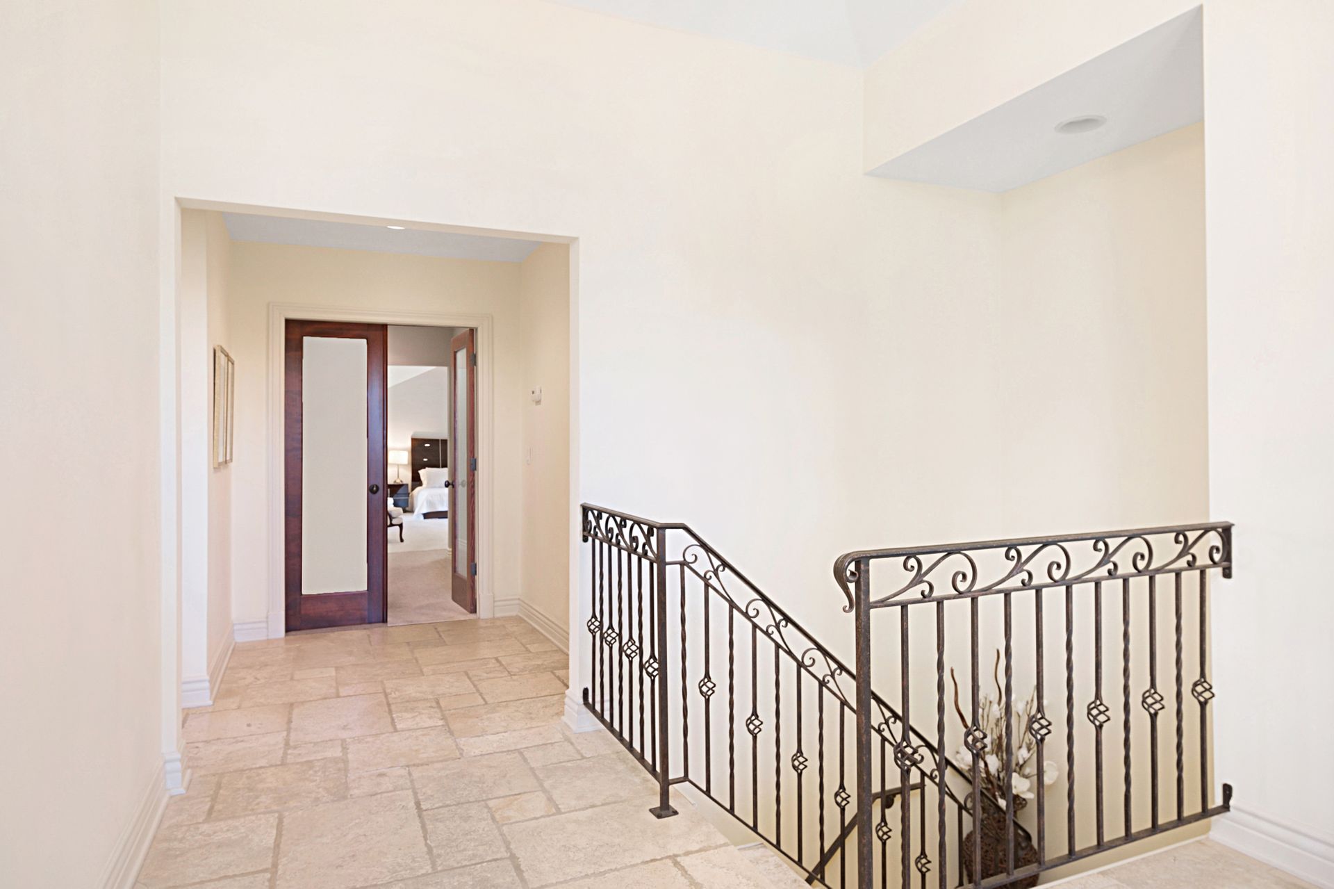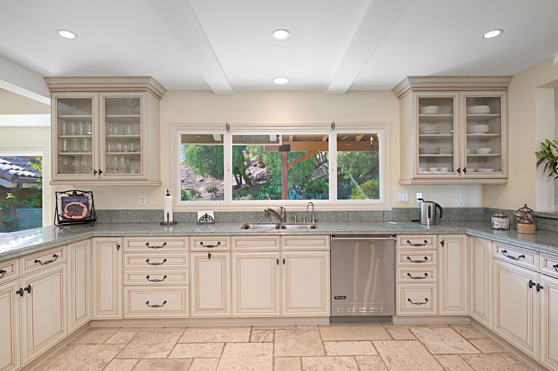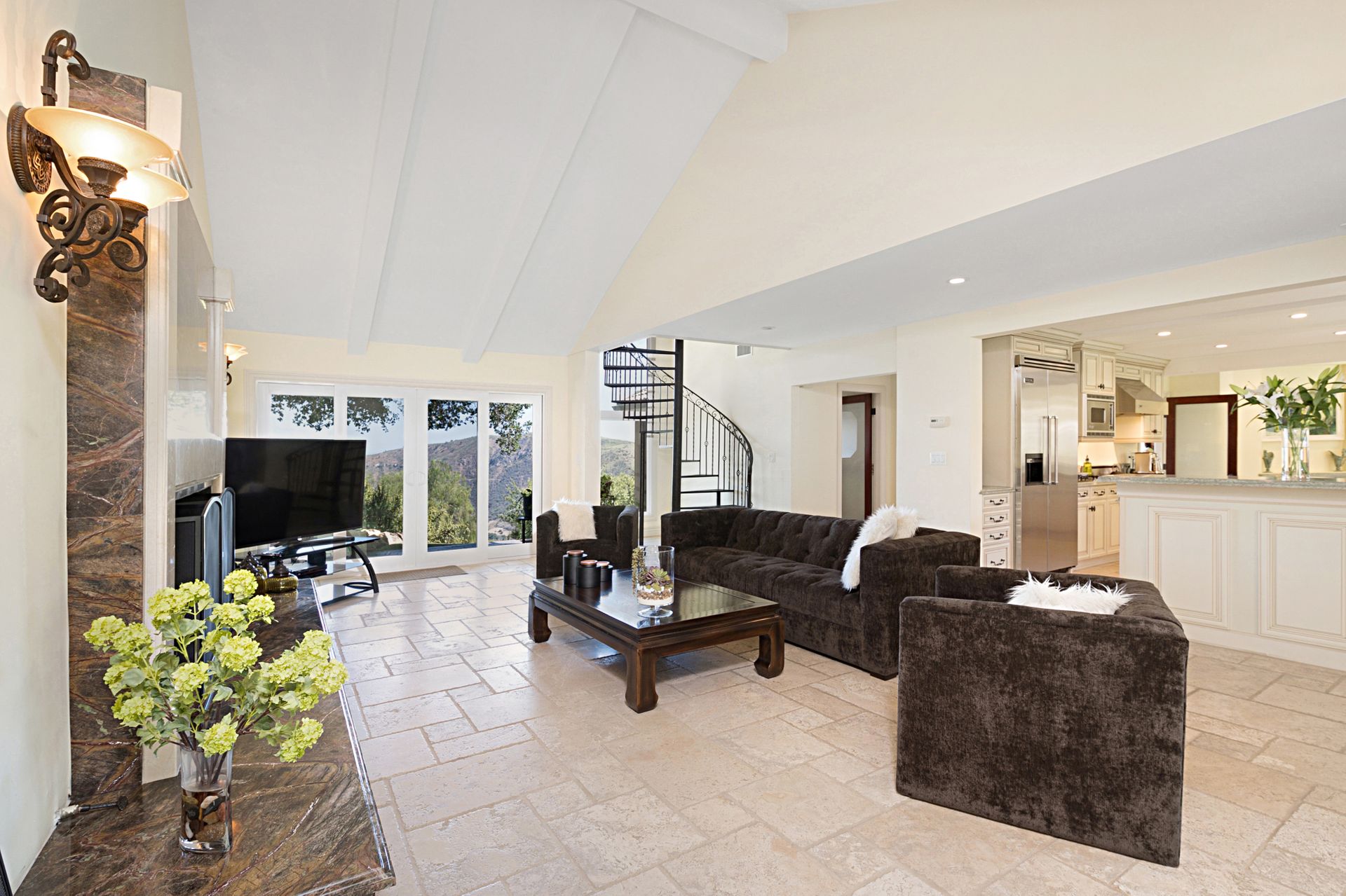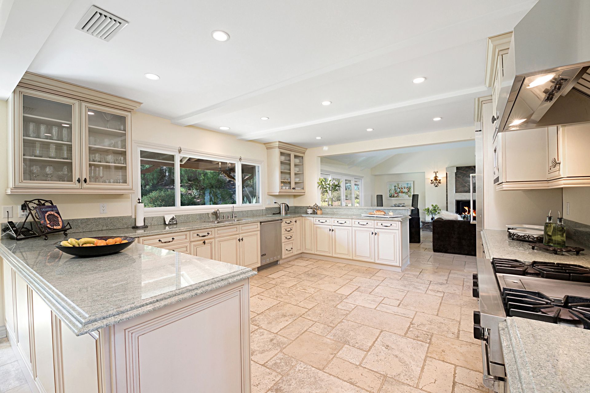 Travertine floors grace the living spaces, including the expansive gourmet kitchen featuring Viking appliances, granite countertops, custom cabinets, and a cozy fireplace-adorned breakfast nook. Flowing from the kitchen, the family room boasts a majestic marble and granite fireplace with a raised hearth, perfect for cozy gatherings. Ascend the spiral staircase to discover a private office space with cathedral wood ceilings, offering a serene retreat.