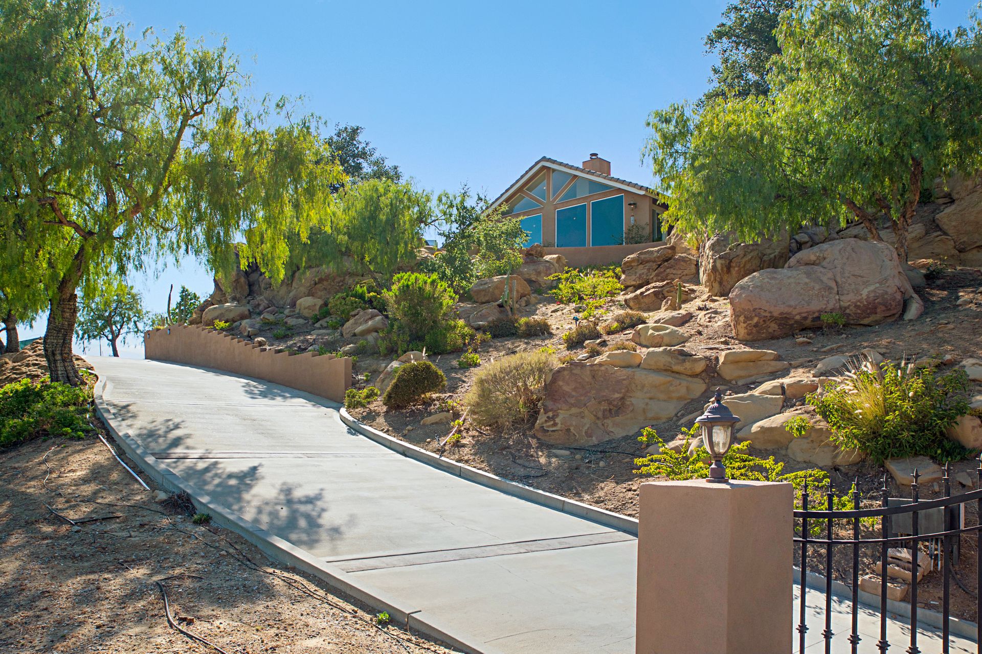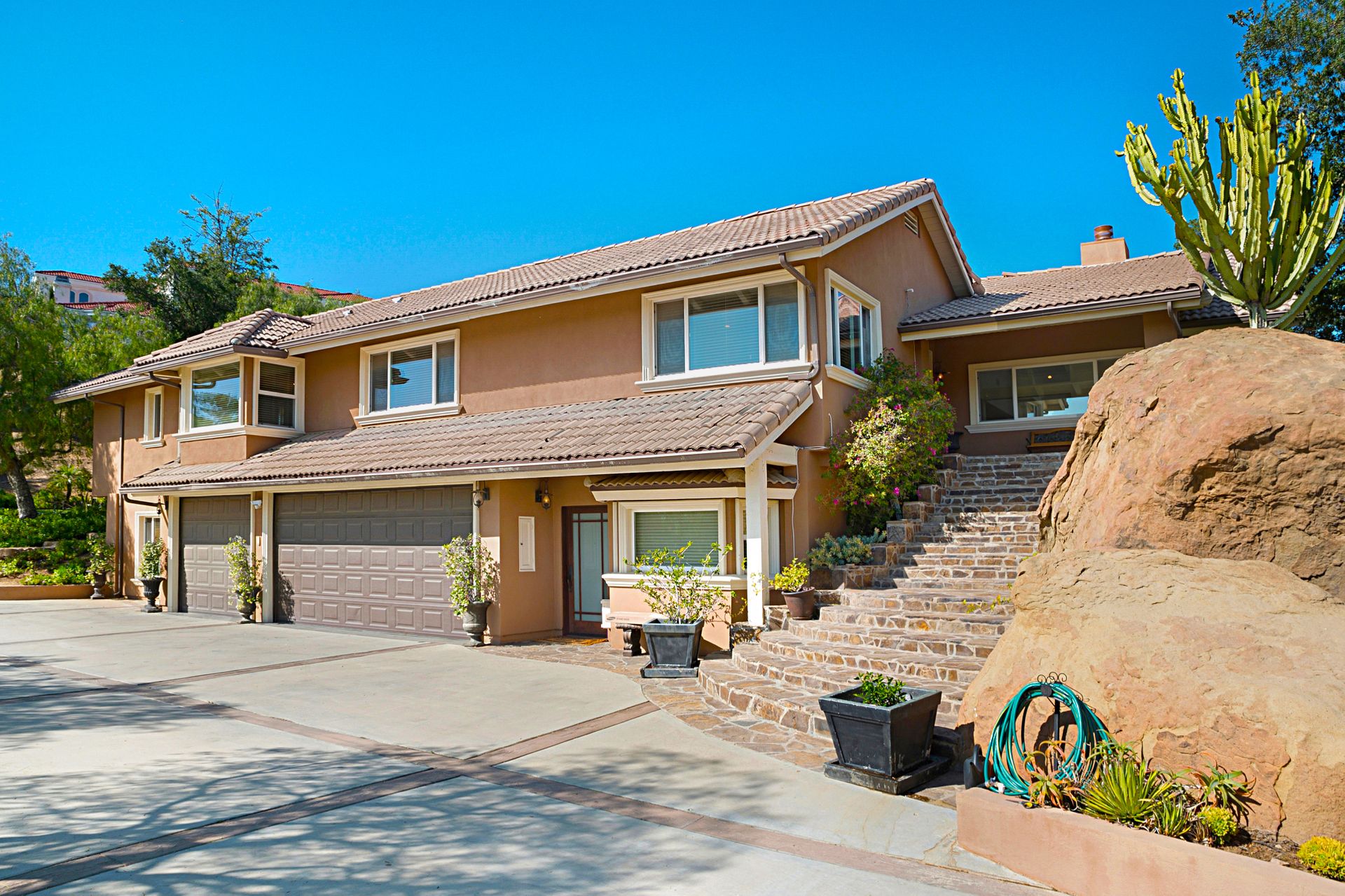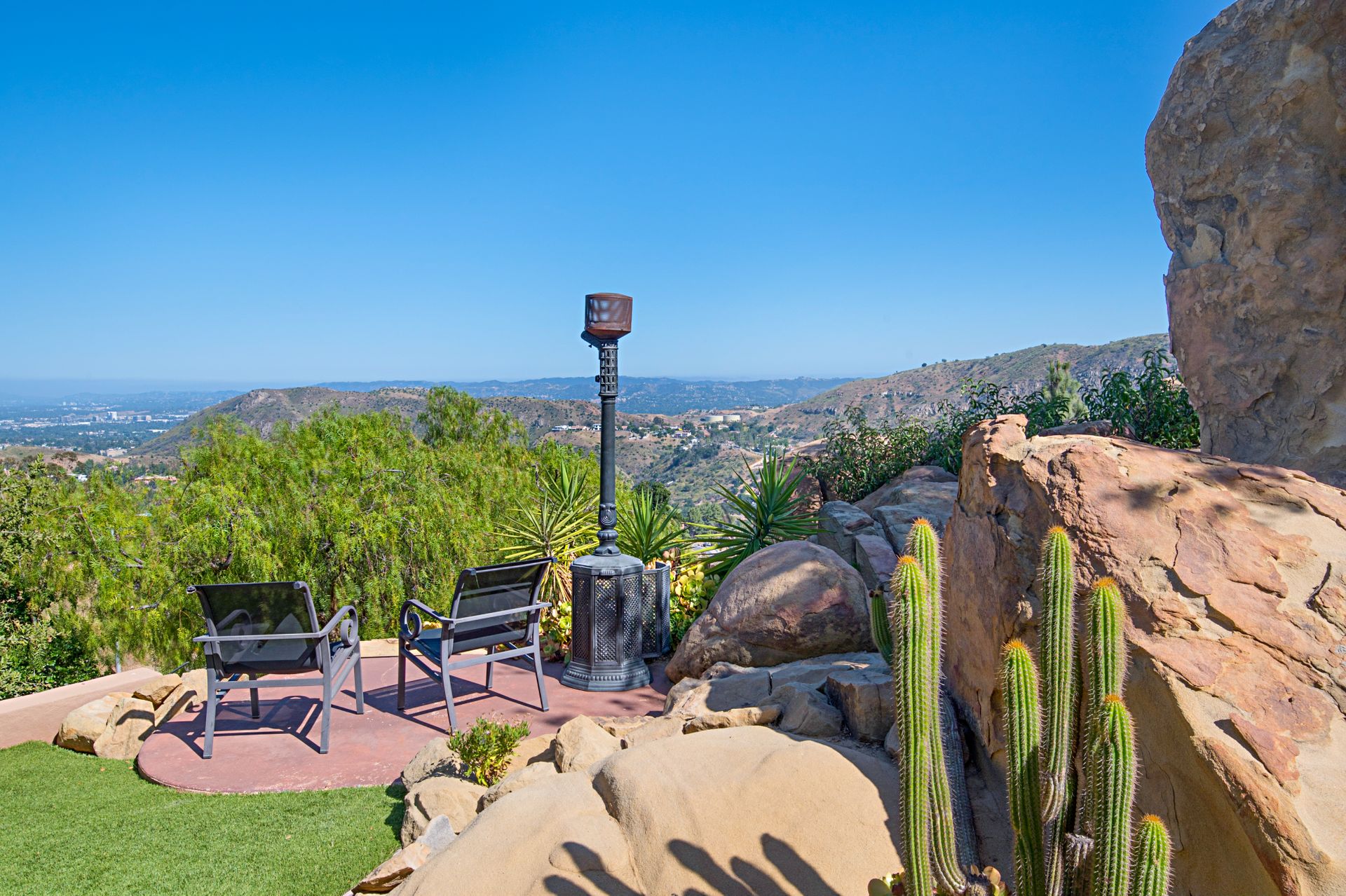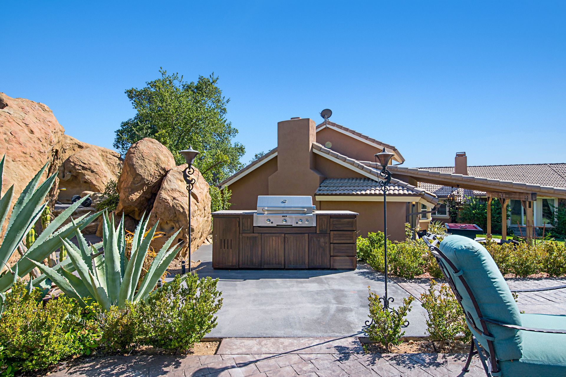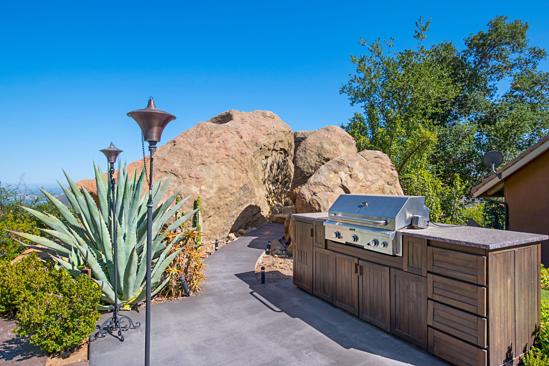 There is a half basketball court and ample parking space complemented by an oversized three-car garage with a spacious storage room. Witness breathtaking sunrises and sunsets framed by the majestic boulders, making this property a true gem.