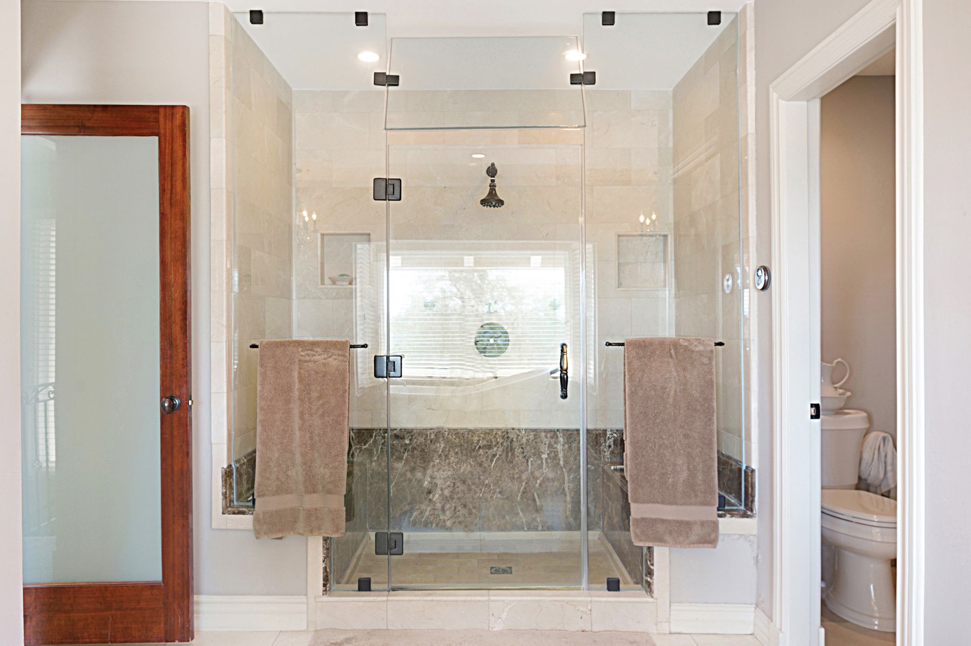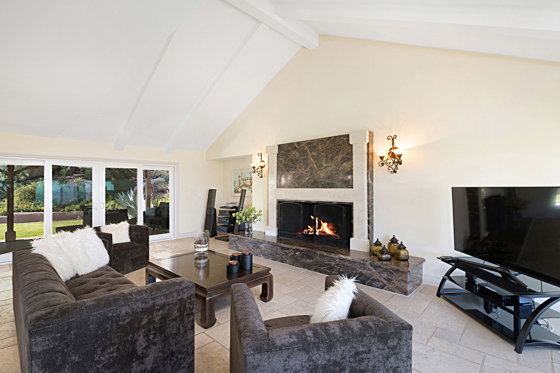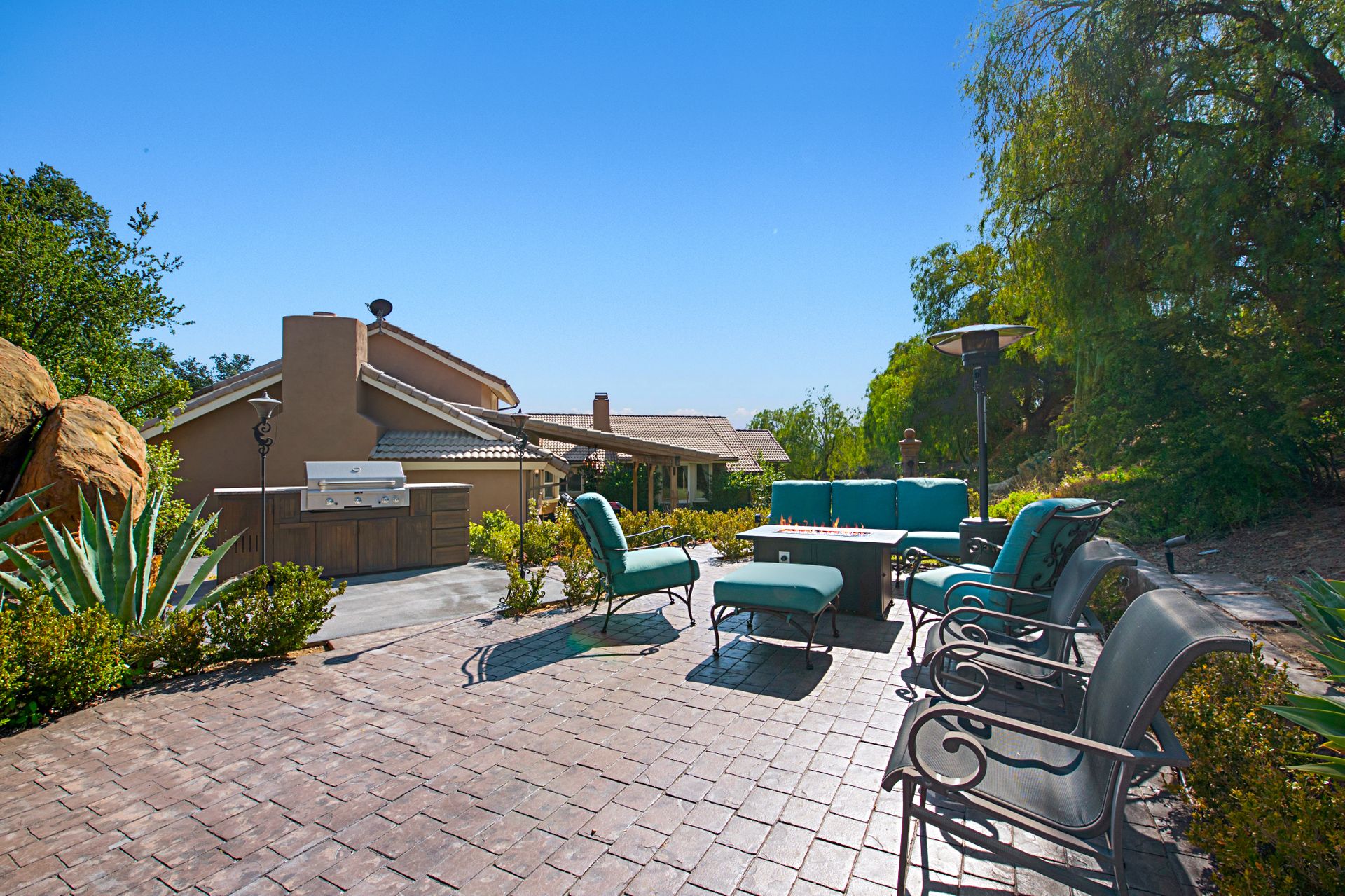 The luxurious primary suite beckons with its own fireplace, dressing area, colossal custom closet, and a soothing sauna. The ensuite bathroom is a sanctuary, featuring double vanities with marble counters, a clawfoot tub, and a rejuvenating steam shower. On the lower level, a guest bedroom with an ensuite bathroom provides convenient access from the driveway. Walls of glass lead to a covered tiled patio and meticulously landscaped grounds, complete with a charming rose garden, BBQ dining area, and natural boulder landscape.