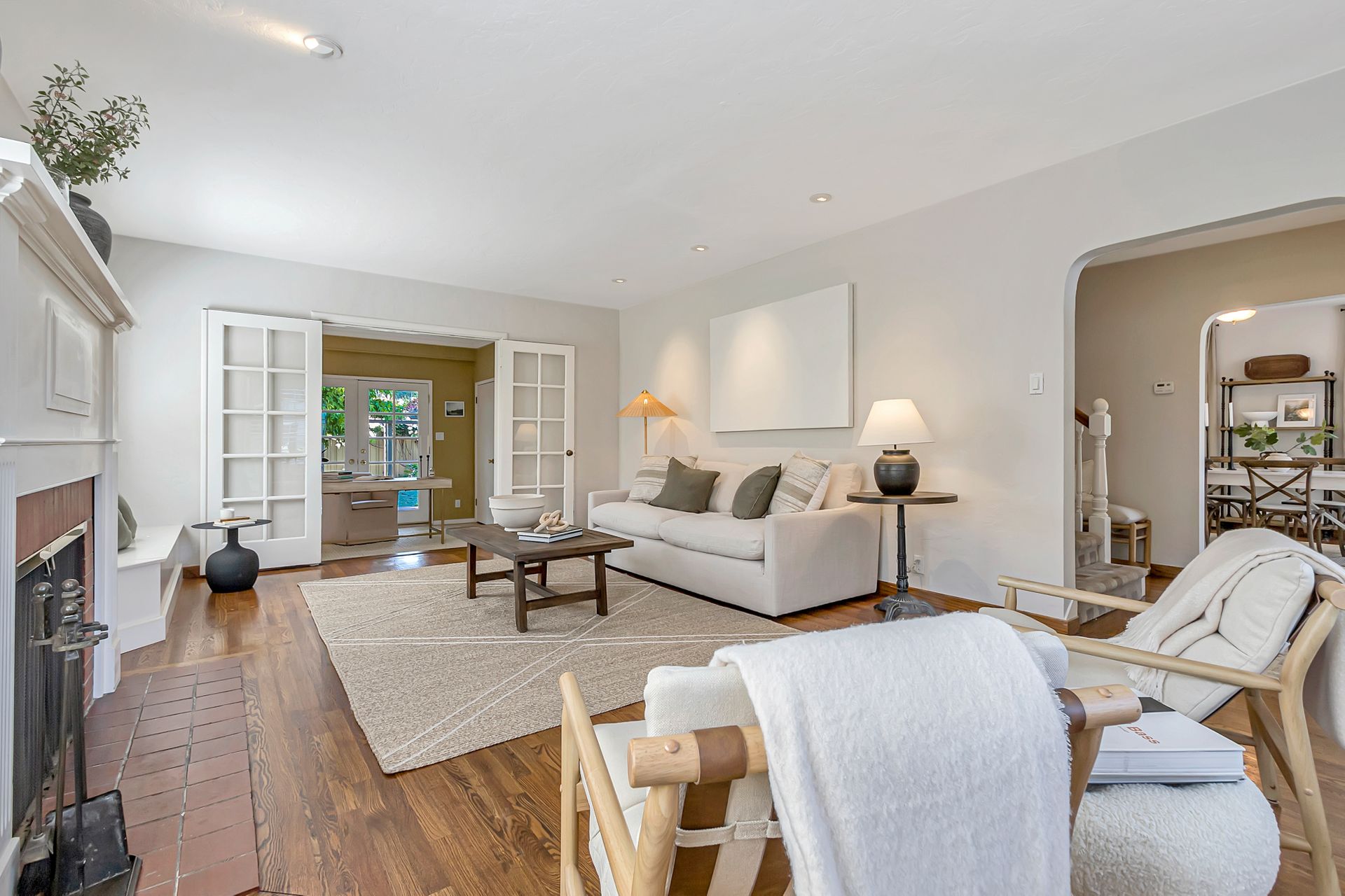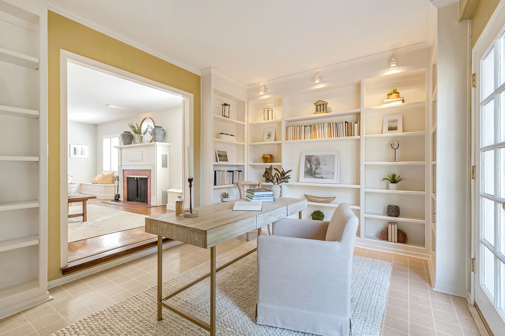 •Built-in seating/storage flanking the impressive wood burning fireplace