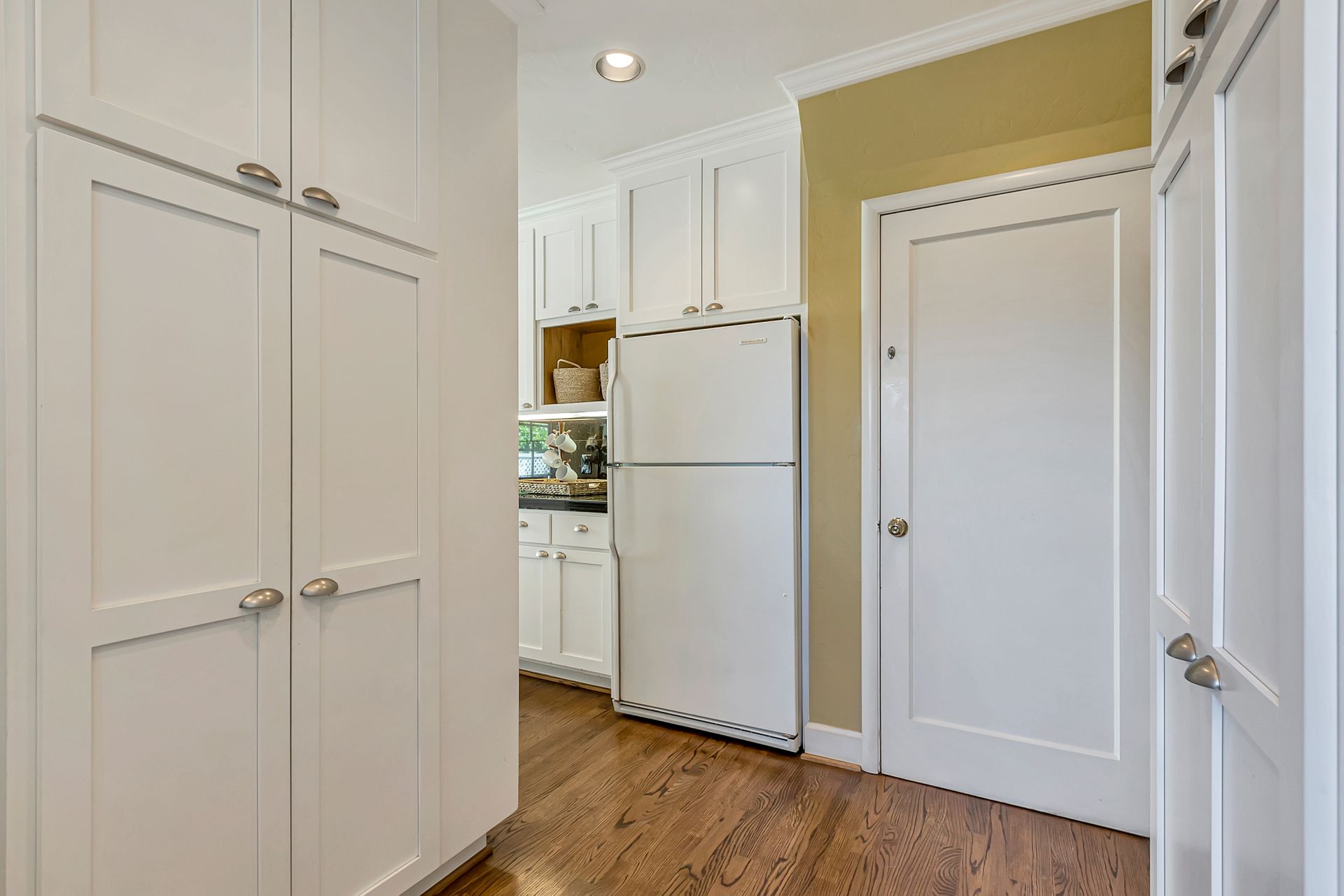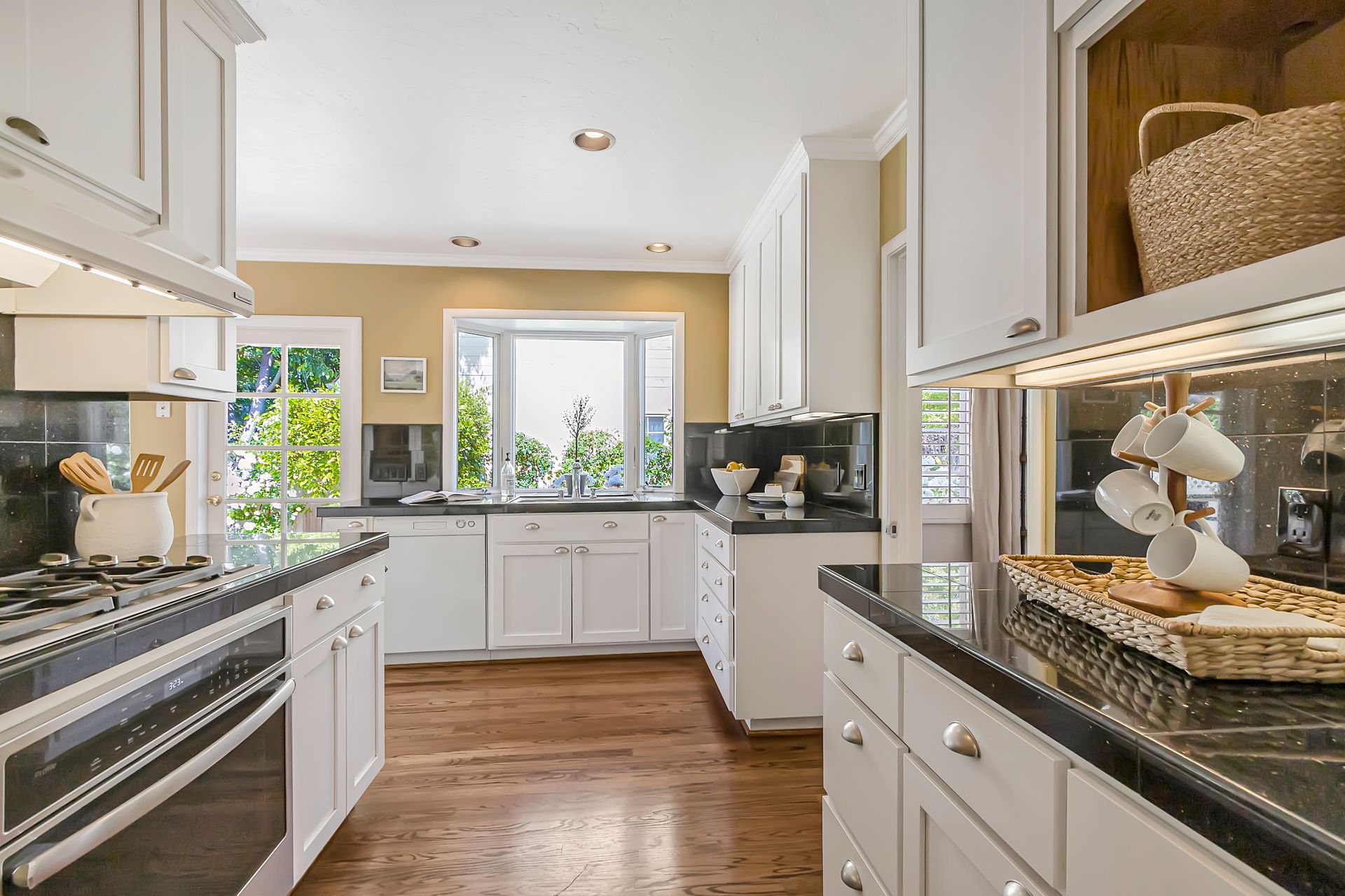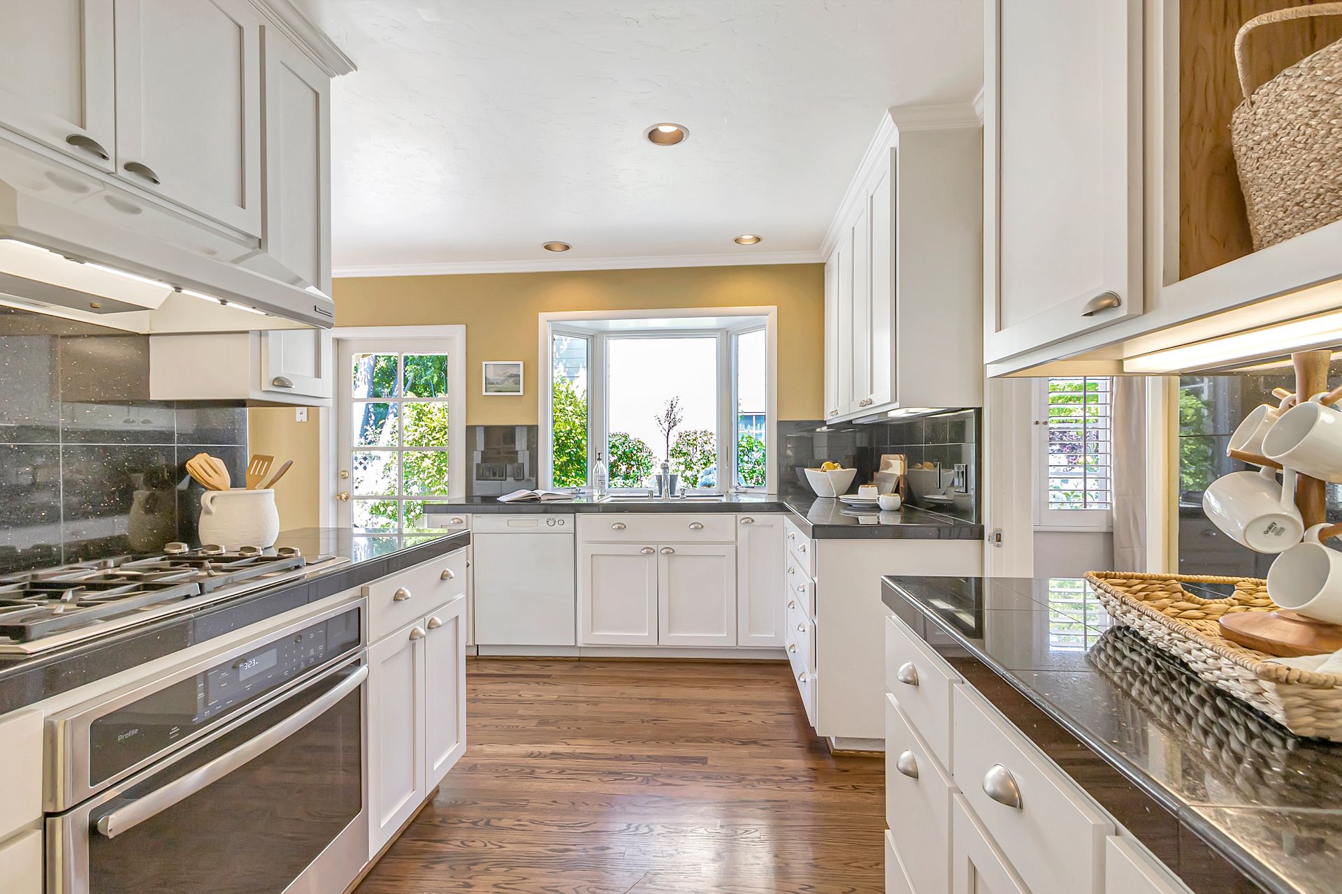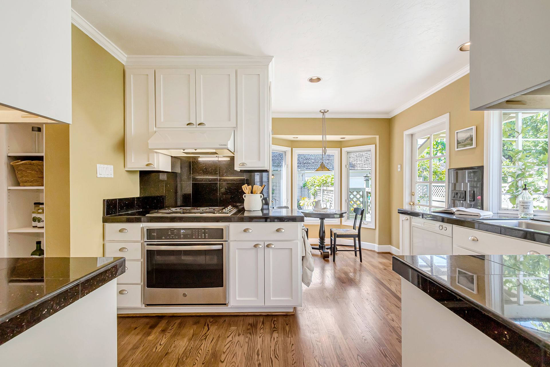 •Kitchen has classic shaker cabinets, black granite counters and a Wolf gas stove
