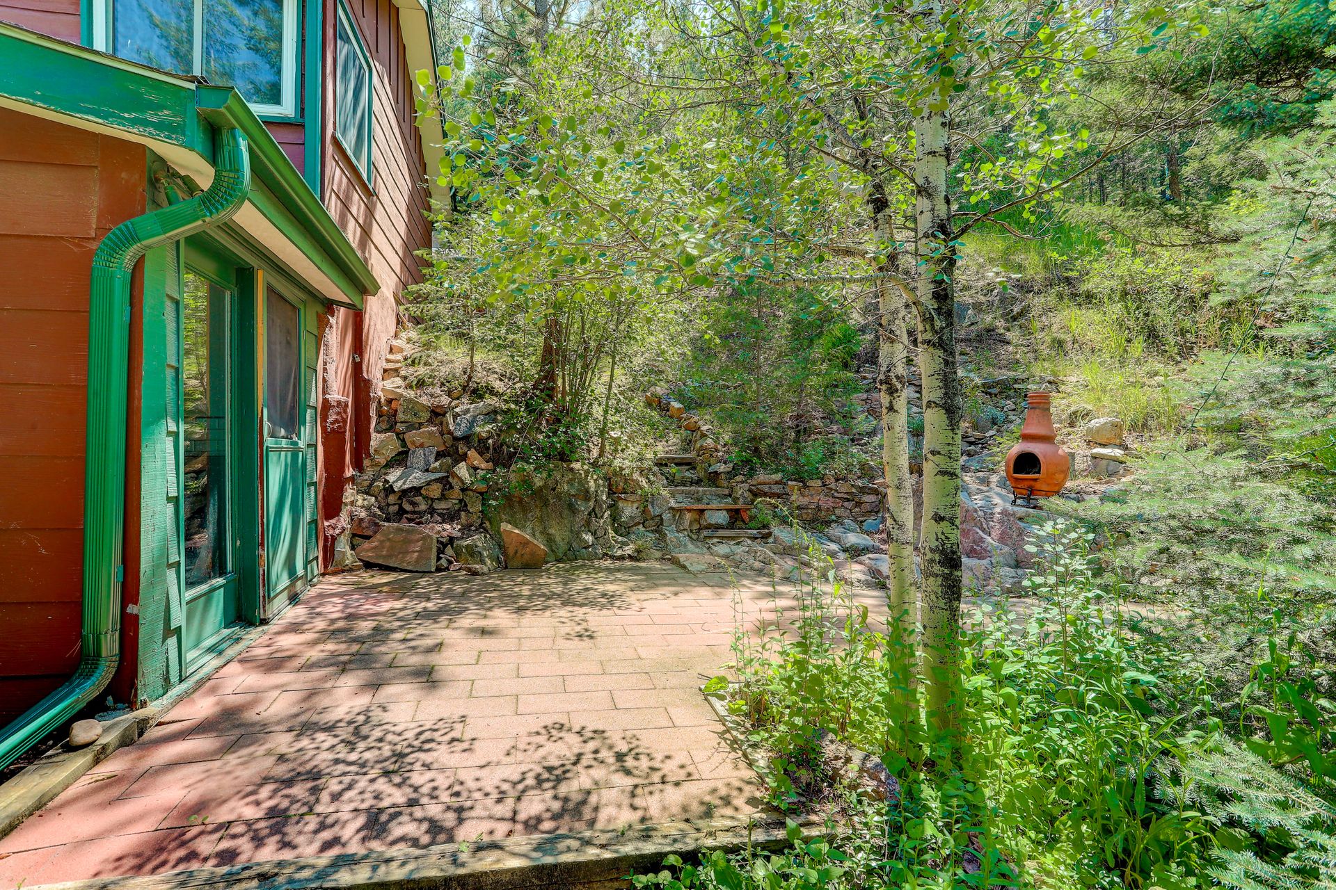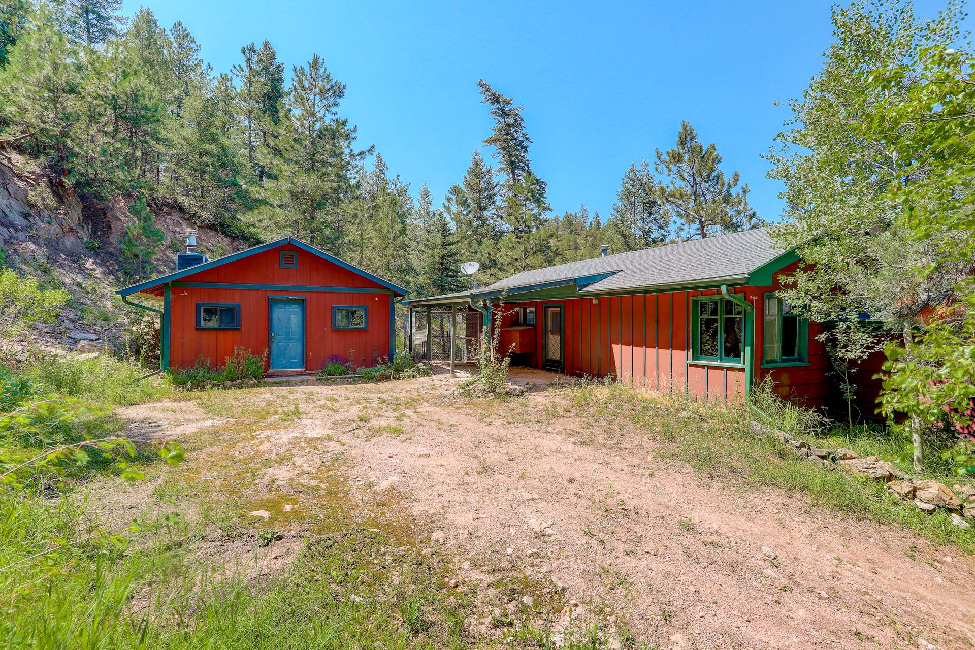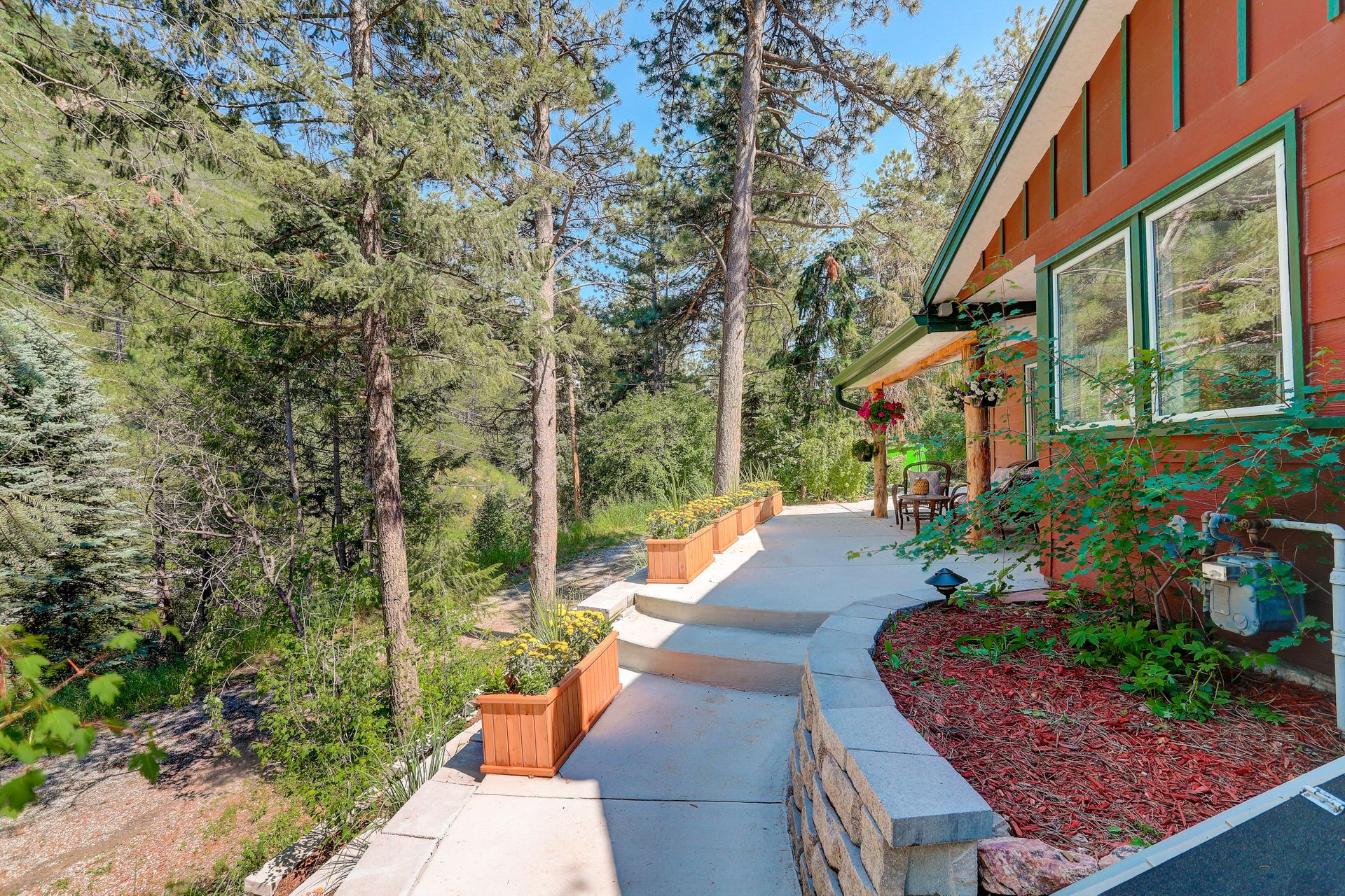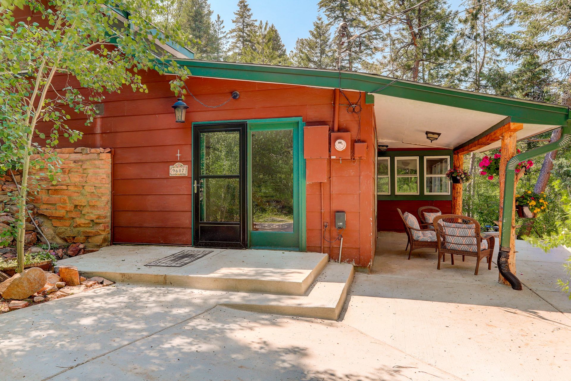 Do you dream of mountain living, with a babbling creek, towering trees, busy hummingbirds and a sense of peace surrounding you? Look no further! Only minutes, via a paved, county-maintained road, to C-470, Lockheed Martin, Chatfield and all the conveniences of town-- but feels like a private retreat the minute you pull into the driveway. This cozy modern mountain home is the perfect blend of rustic and contemporary. So much is new: interior paint, exterior terracing and concrete work, low-maintenance landscaping, JUST FINISHED remodeled bathroom, remodeled kitchen (2021), brand new hardwood stairs, flooring/carpet upstairs, light fixtures... The main floor has a huge entertaining space, that flows effortlessly from indoors to outdoors. Covered front porch and open side patio connect to the great room, which is flooded with natural light, and can be configured in many ways to accommodate extra office space, a music area or a playroom. The dining room, adjacent to the kitchen, is the perfect place to gather on chilly evenings, and bask in the warmth of the gas stove with natural stone surround. The kitchen features solid quartz countertops, a farmhouse sink, new cabinetry and appliances. Easy access to the newly finished laundry room! Upstairs, you'll find three large bedrooms (one staged as an office) and a brand-new five-piece bathroom! From the office, there is direct access to the back porch and an oversized outbuilding, that can serve as extra storage or could be fully finished for additional living or office space. This home is oozing with charm, has close proximity to multiple parks and trailheads, and provides an unmatched connection to nature.