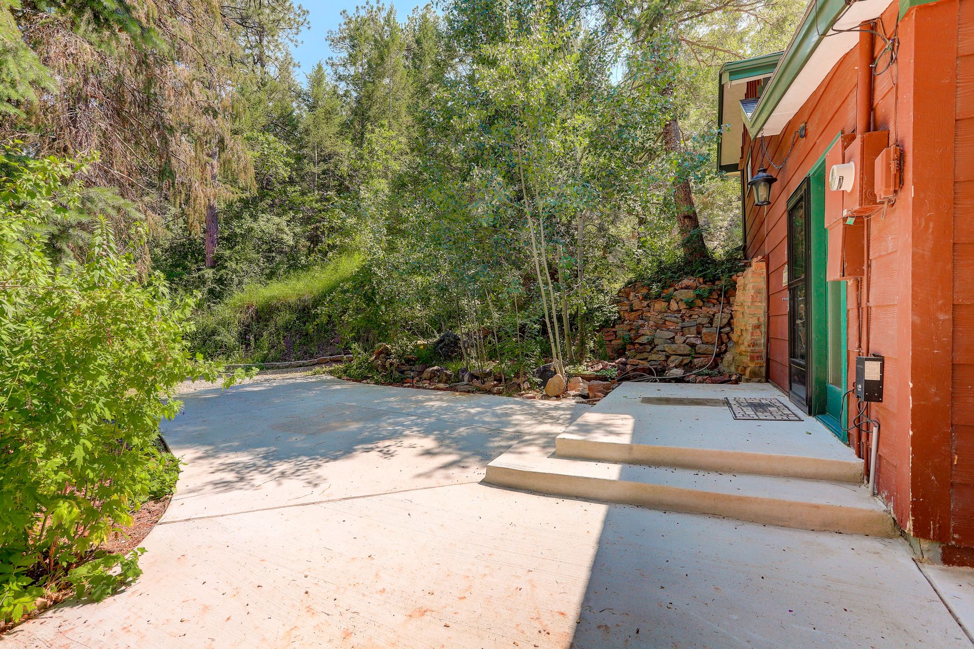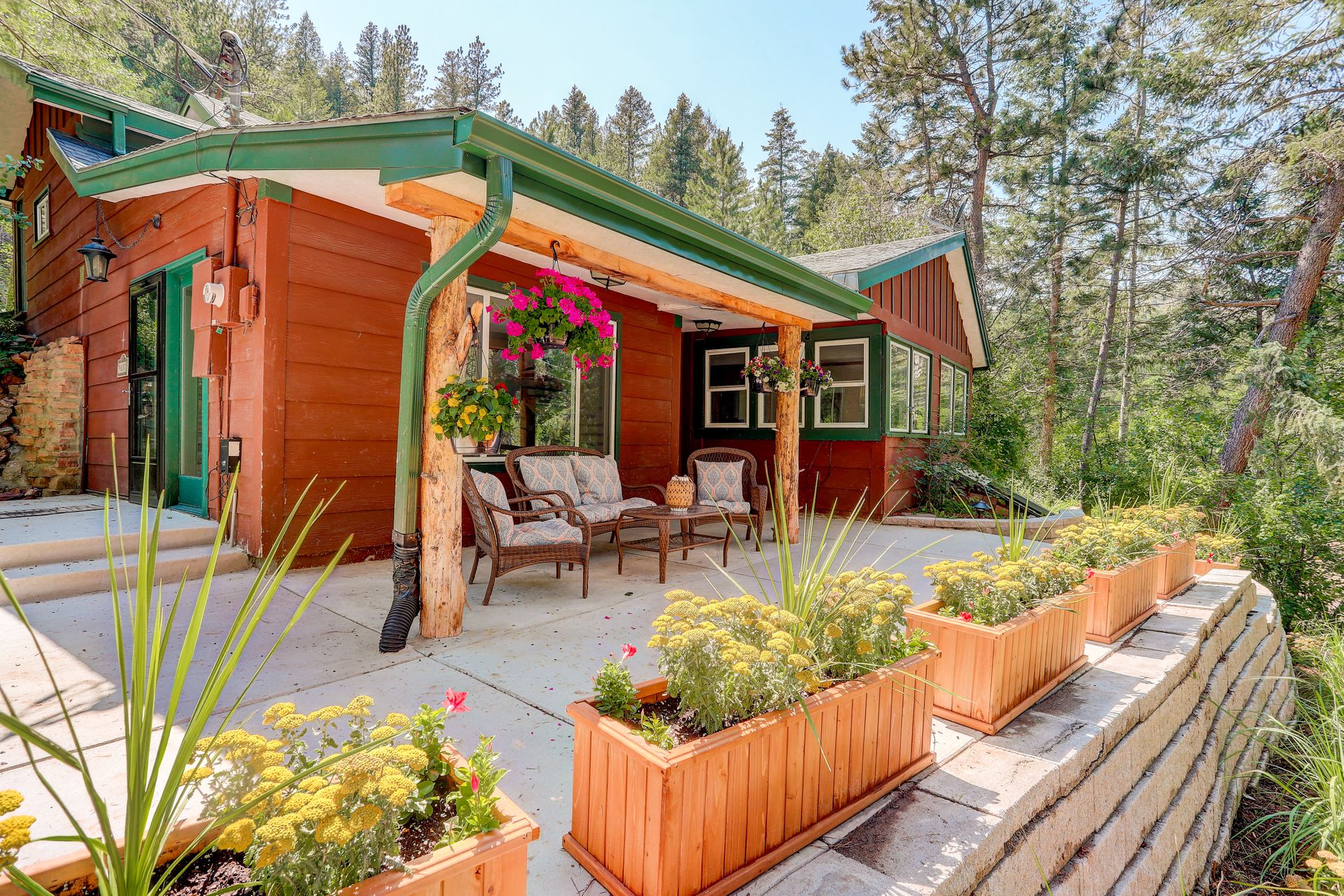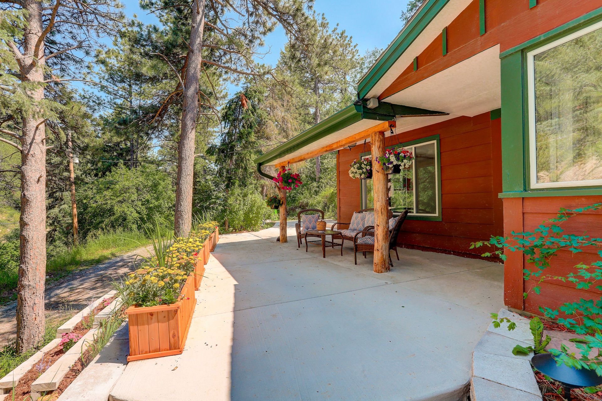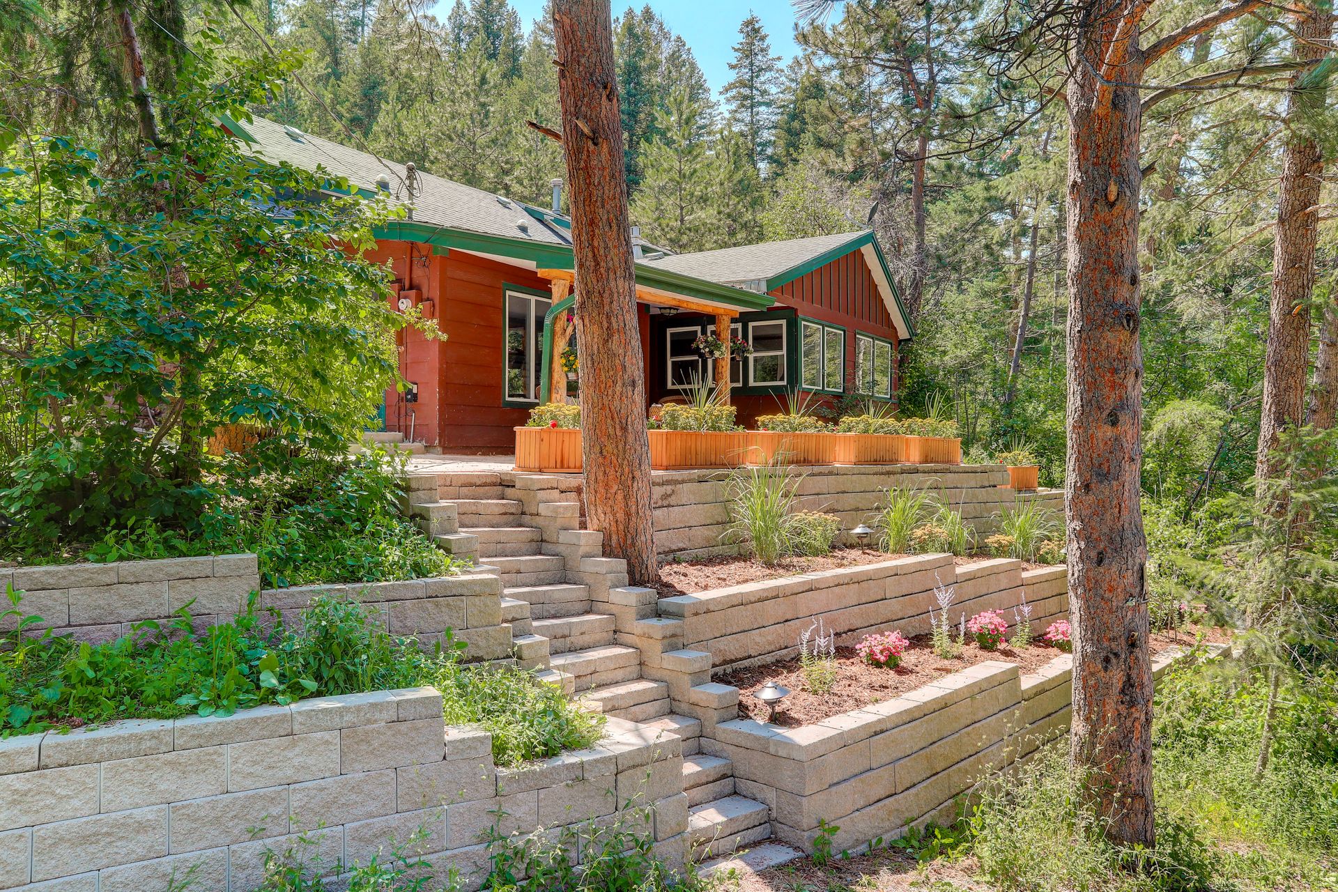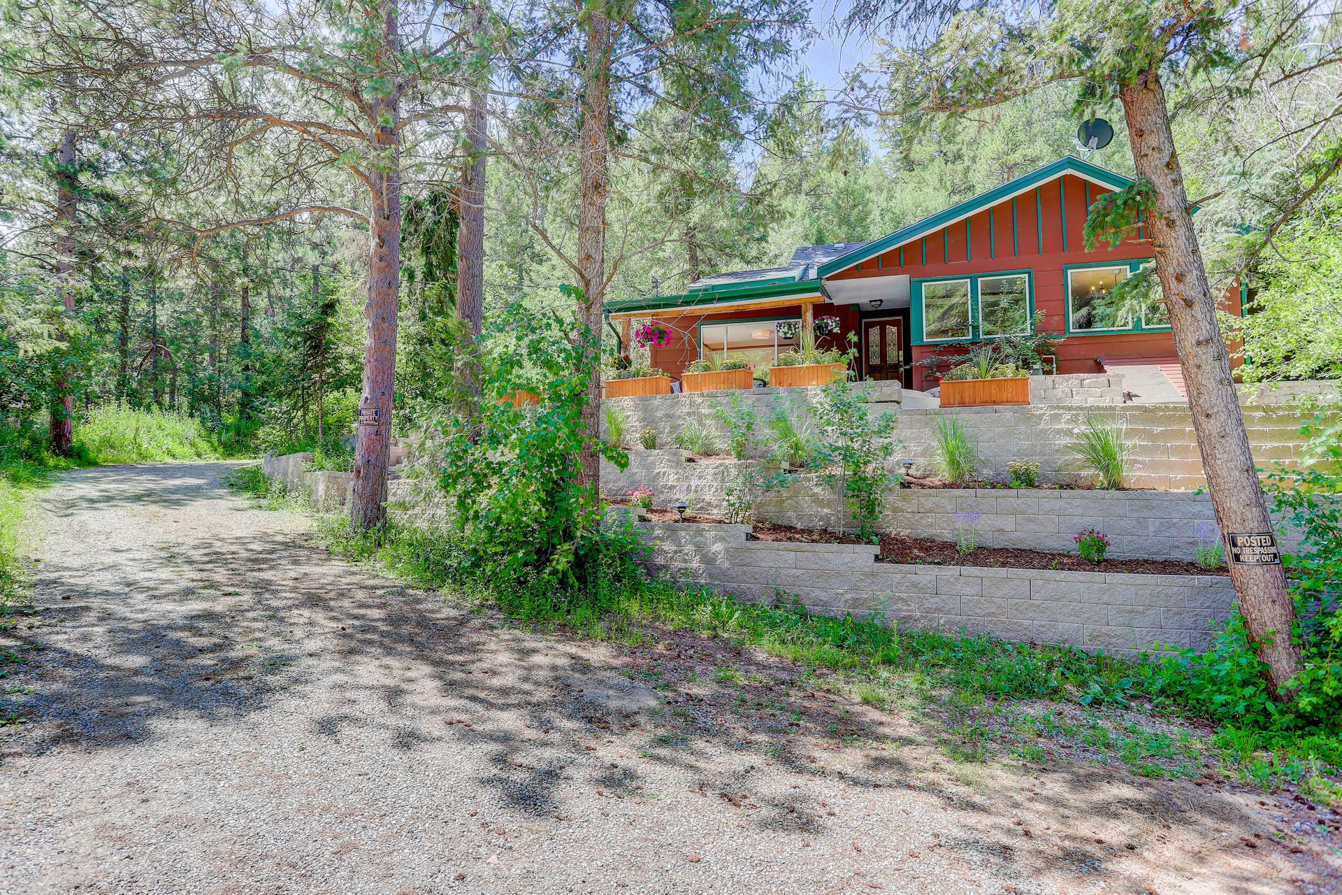 Do you dream of mountain living, with a babbling creek, towering trees, busy hummingbirds and a sense of peace surrounding you? Look no further! Only minutes, via a paved, county-maintained road, to C-470, Lockheed Martin, Chatfield and all the conveniences of town-- but feels like a private retreat the minute you pull into the driveway. This cozy modern mountain home is the perfect blend of rustic and contemporary. So much is new: interior paint, exterior terracing and concrete work, low-maintenance landscaping, JUST FINISHED remodeled bathroom, remodeled kitchen (2021), brand new hardwood stairs, flooring/carpet upstairs, light fixtures... The main floor has a huge entertaining space, that flows effortlessly from indoors to outdoors. Covered front porch and open side patio connect to the great room, which is flooded with natural light, and can be configured in many ways to accommodate extra office space, a music area or a playroom. The dining room, adjacent to the kitchen, is the perfect place to gather on chilly evenings, and bask in the warmth of the gas stove with natural stone surround. The kitchen features solid quartz countertops, a farmhouse sink, new cabinetry and appliances. Easy access to the newly finished laundry room! Upstairs, you'll find three large bedrooms (one staged as an office) and a brand-new five-piece bathroom! From the office, there is direct access to the back porch and an oversized outbuilding, that can serve as extra storage or could be fully finished for additional living or office space. This home is oozing with charm, has close proximity to multiple parks and trailheads, and provides an unmatched connection to nature.