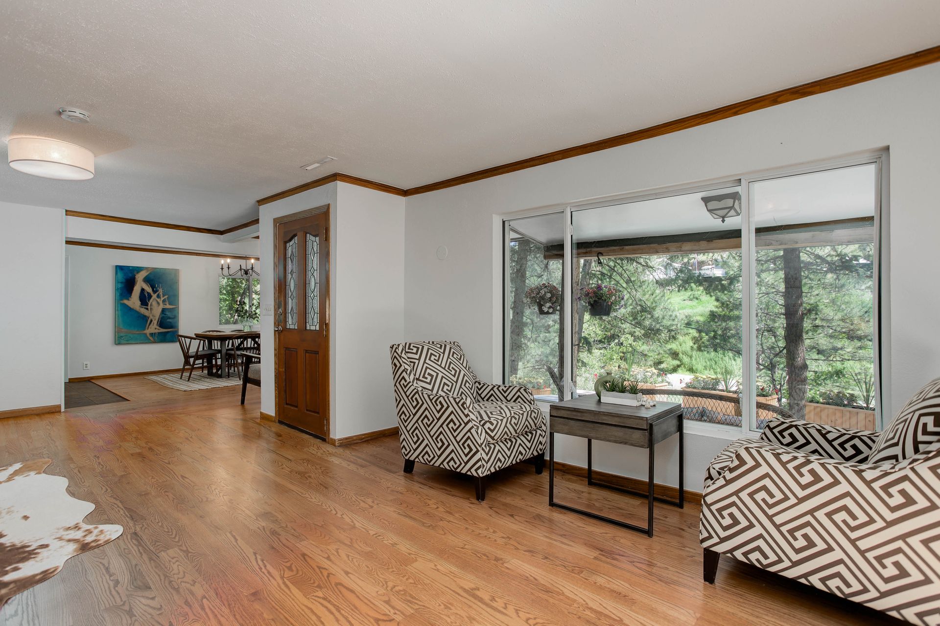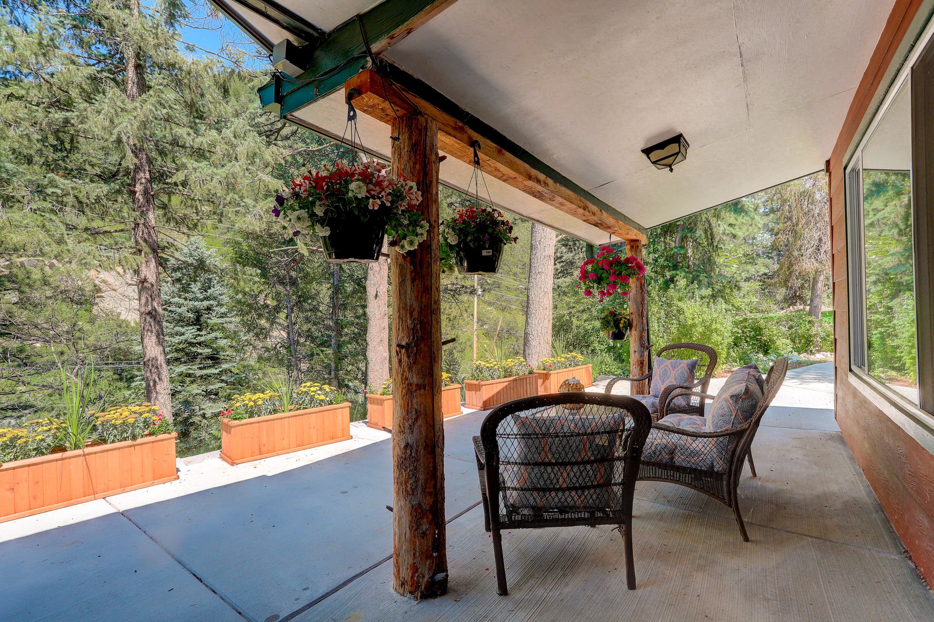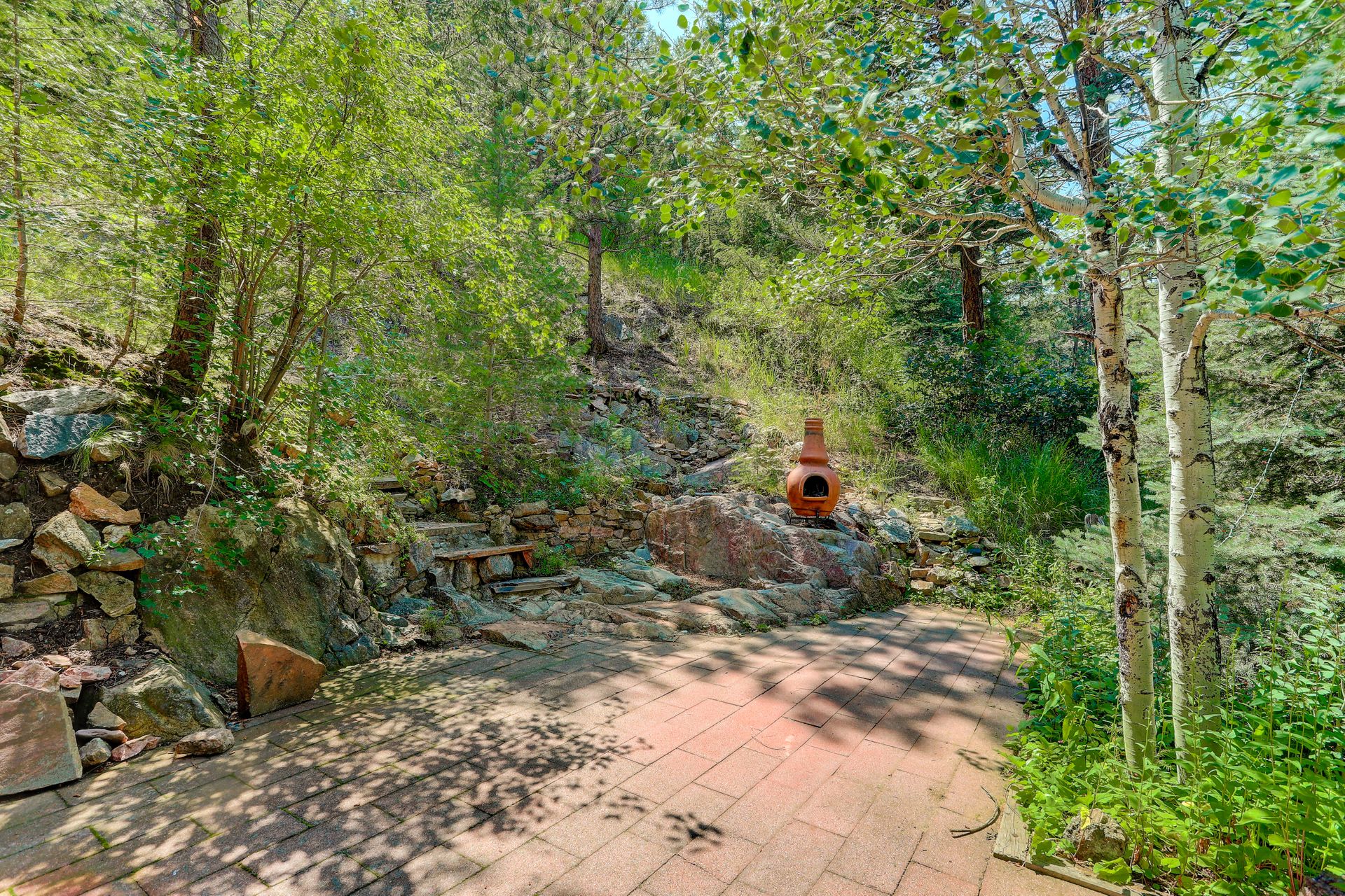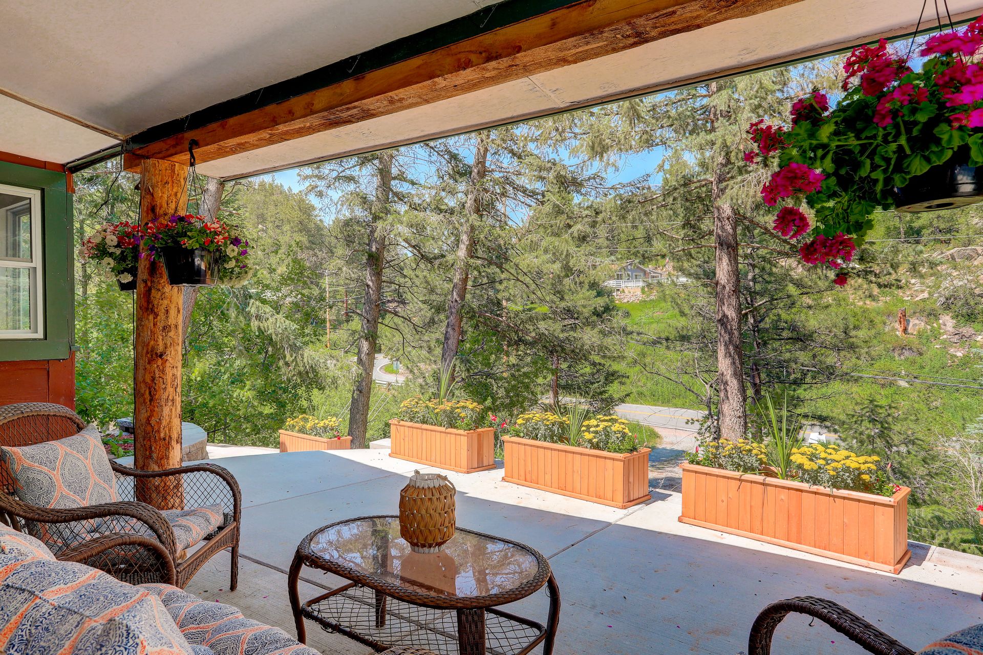 Do you dream of mountain living, with a babbling creek, towering trees, busy hummingbirds and a sense of peace surrounding you? Look no further! Only minutes, via a paved, county-maintained road, to C-470, Lockheed Martin, Chatfield and all the conveniences of town-- but feels like a private retreat the minute you pull into the driveway. This cozy modern mountain home is the perfect blend of rustic and contemporary. So much is new: interior paint, exterior terracing and concrete work, low-maintenance landscaping, JUST FINISHED remodeled bathroom, remodeled kitchen (2021), brand new hardwood stairs, flooring/carpet upstairs, light fixtures... The main floor has a huge entertaining space, that flows effortlessly from indoors to outdoors. Covered front porch and open side patio connect to the great room, which is flooded with natural light, and can be configured in many ways to accommodate extra office space, a music area or a playroom. The dining room, adjacent to the kitchen, is the perfect place to gather on chilly evenings, and bask in the warmth of the gas stove with natural stone surround. The kitchen features solid quartz countertops, a farmhouse sink, new cabinetry and appliances. Easy access to the newly finished laundry room! Upstairs, you'll find three large bedrooms (one staged as an office) and a brand-new five-piece bathroom! From the office, there is direct access to the back porch and an oversized outbuilding, that can serve as extra storage or could be fully finished for additional living or office space. This home is oozing with charm, has close proximity to multiple parks and trailheads, and provides an unmatched connection to nature.