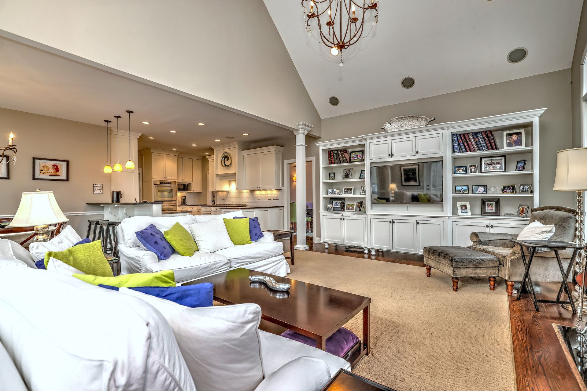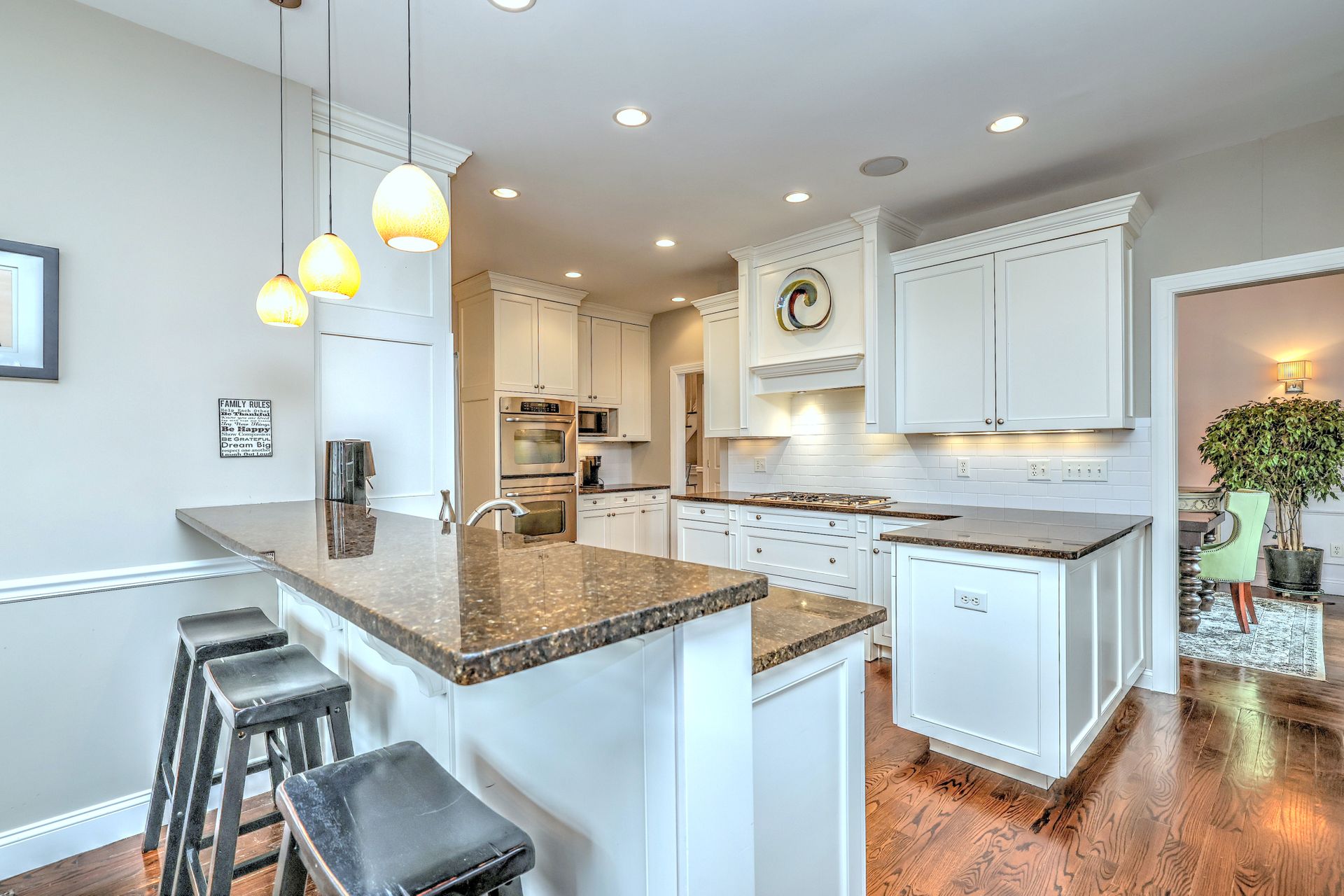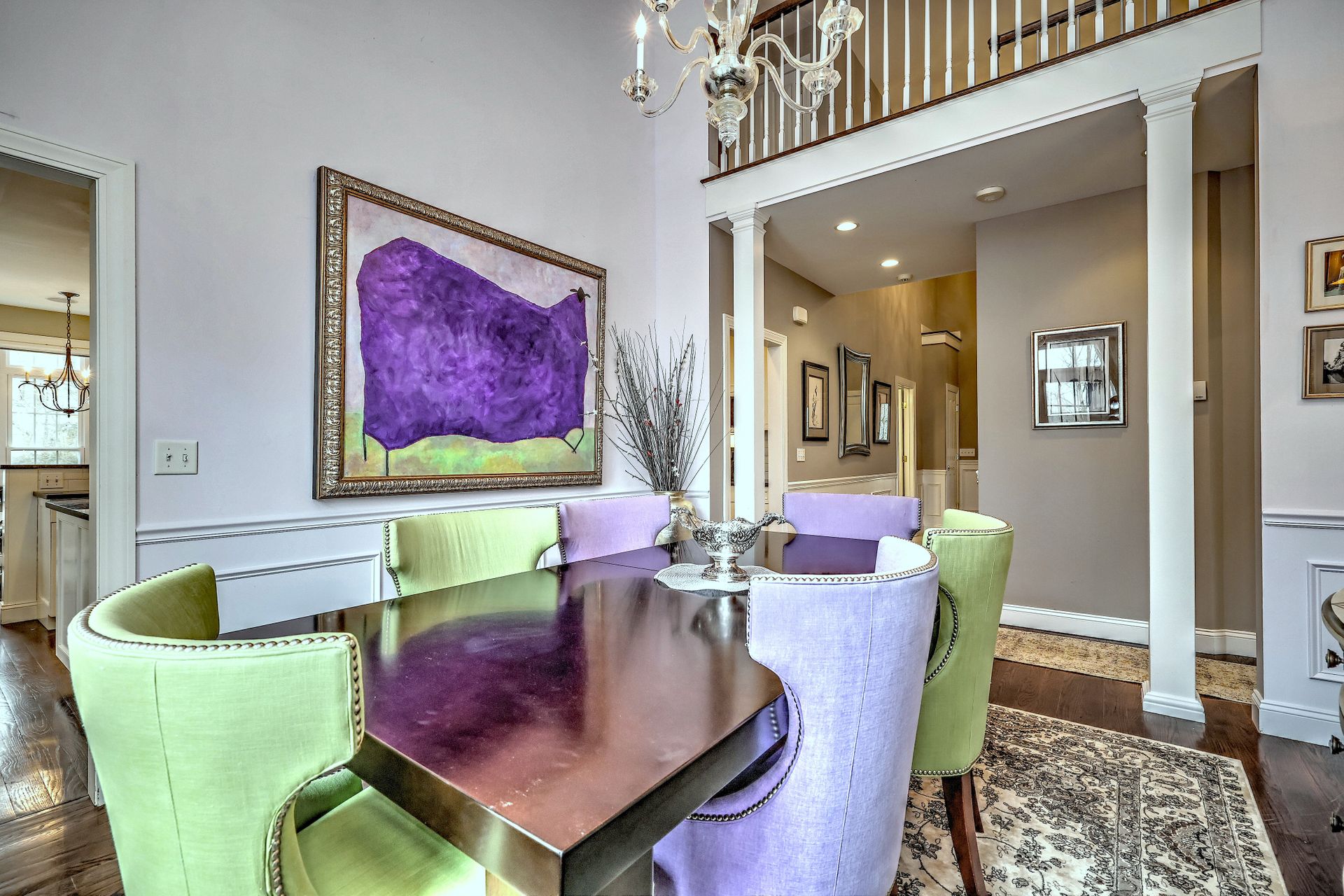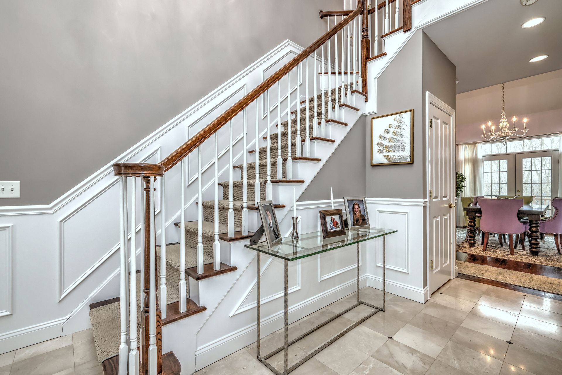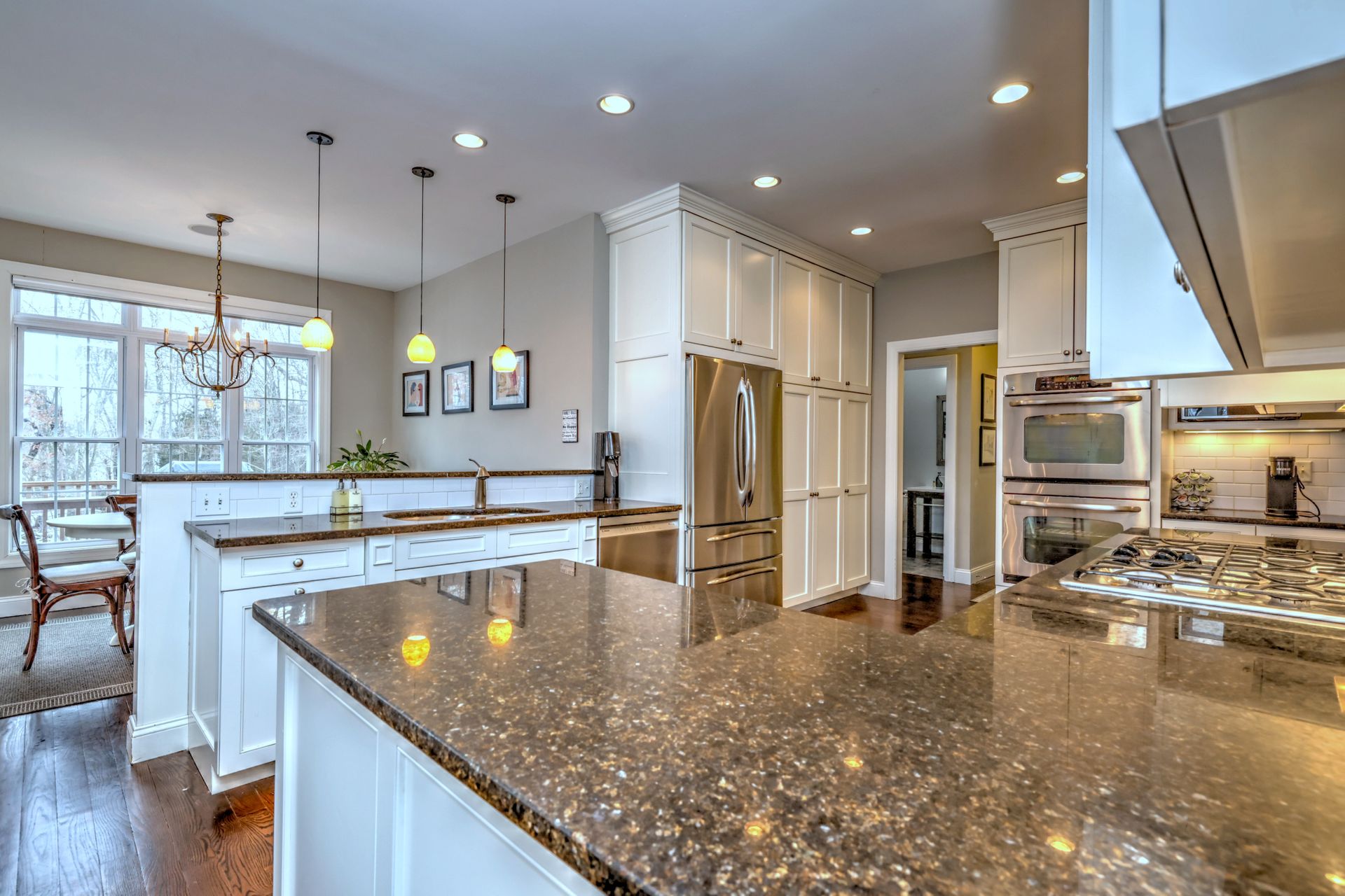 Upon entering through the delightful covered front porch, you’re greeted by a grand foyer with a stunning chandelier, gleaming marble floors with pewter accents, and detailed wall moldings. The chef’s kitchen is a dream, featuring double wall ovens, a gas cooktop with a professional-grade vent, hardwood floors, gorgeous granite counters, a breakfast bar, and a sunny breakfast nook. The sun-splashed two-story family room has a wood-burning fireplace, oversized windows, and access to a comfortable deck. The indoor/outdoor sound system with a seven-zone speaker design is an extraordinary feature, providing immersive sound throughout this amazing home. The formal dining room features a delightful balcony from the second floor, hardwood floors, and large sliders to the second deck.