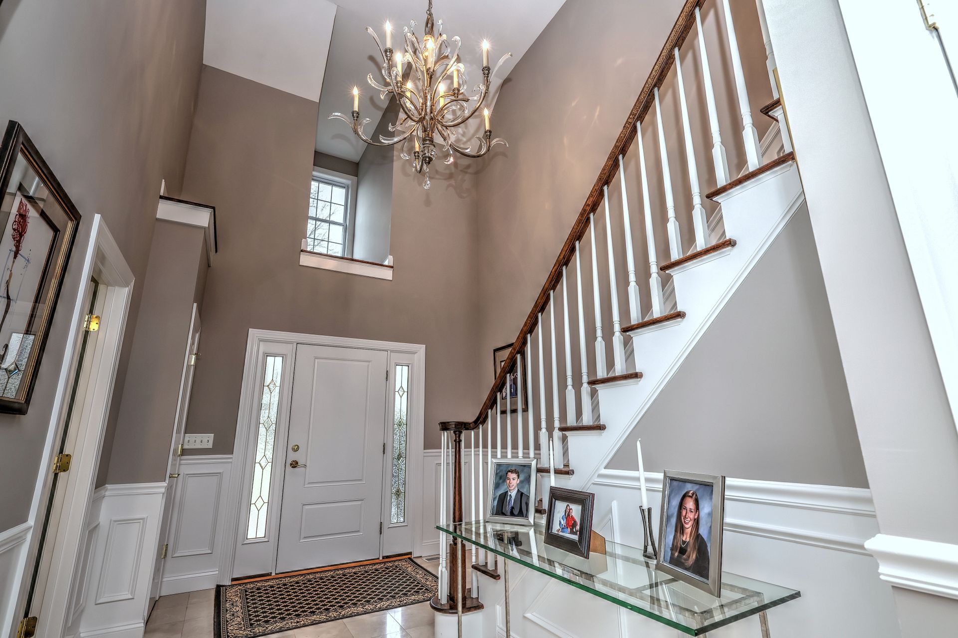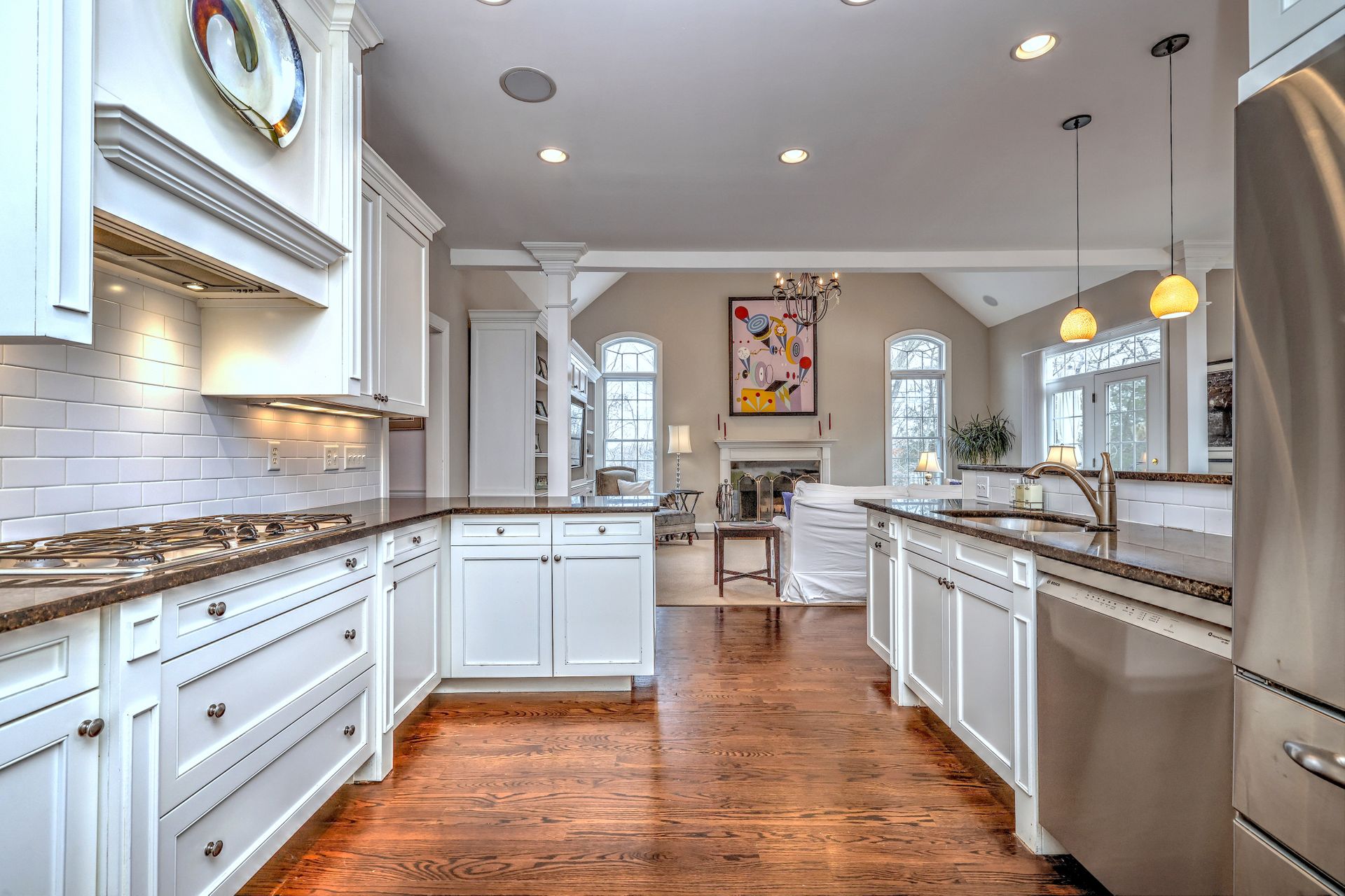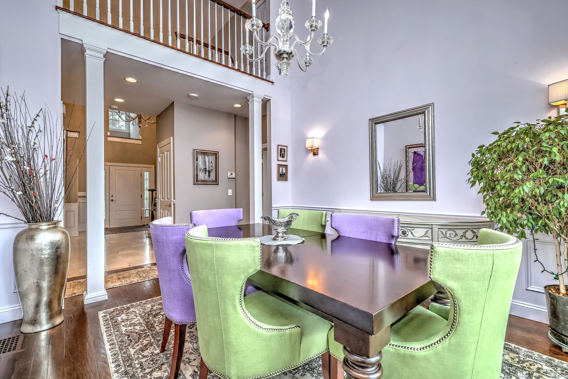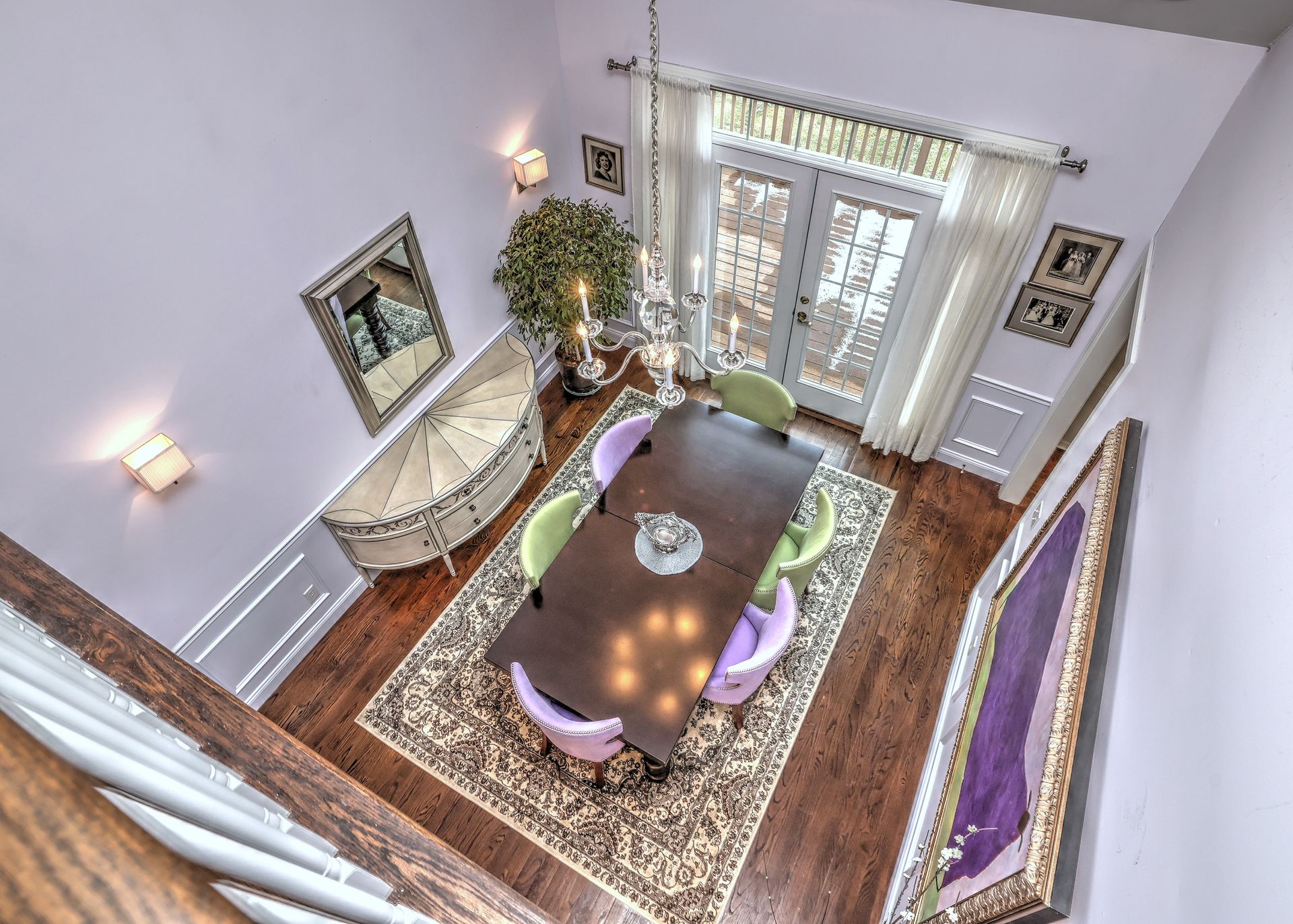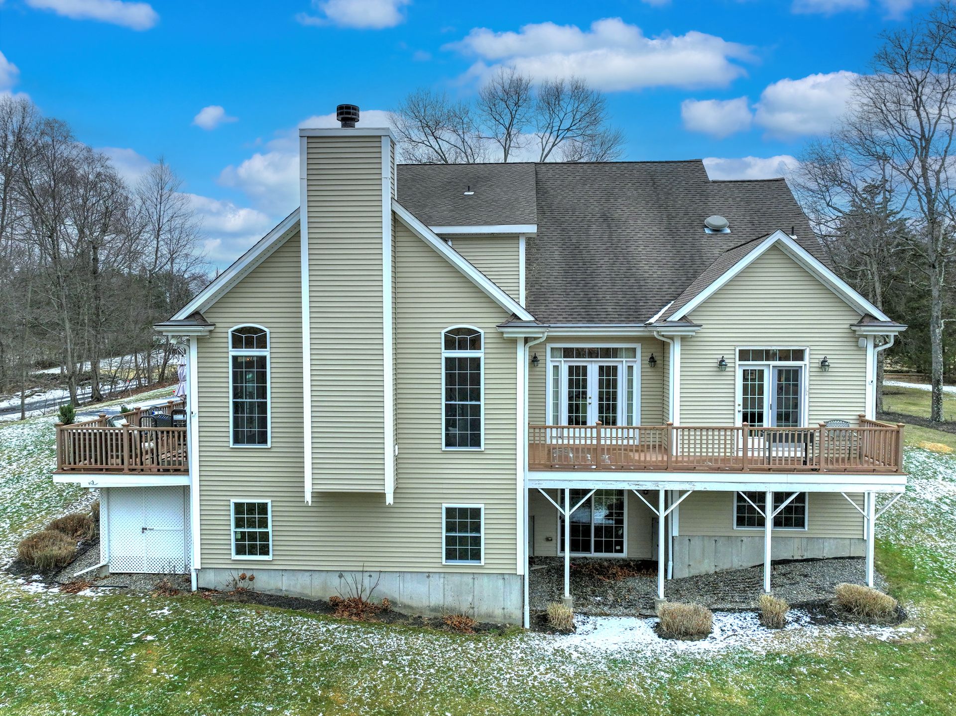 Upon entering through the delightful covered front porch, you’re greeted by a grand foyer with a stunning chandelier, gleaming marble floors with pewter accents, and detailed wall moldings. The chef’s kitchen is a dream, featuring double wall ovens, a gas cooktop with a professional-grade vent, hardwood floors, gorgeous granite counters, a breakfast bar, and a sunny breakfast nook. The sun-splashed two-story family room has a wood-burning fireplace, oversized windows, and access to a comfortable deck. The indoor/outdoor sound system with a seven-zone speaker design is an extraordinary feature, providing immersive sound throughout this amazing home. The formal dining room features a delightful balcony from the second floor, hardwood floors, and large sliders to the second deck.