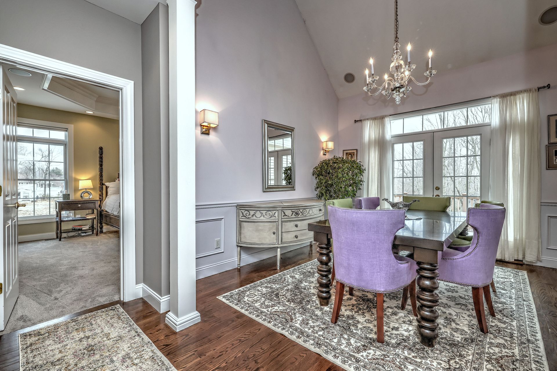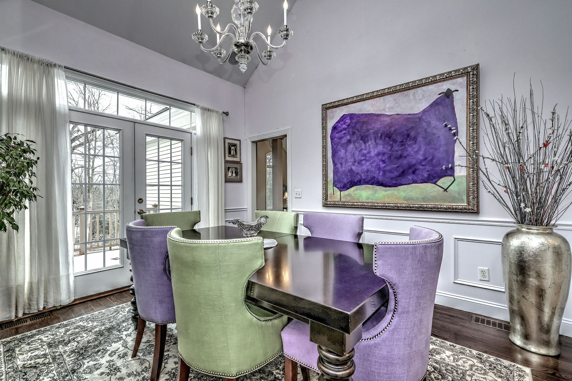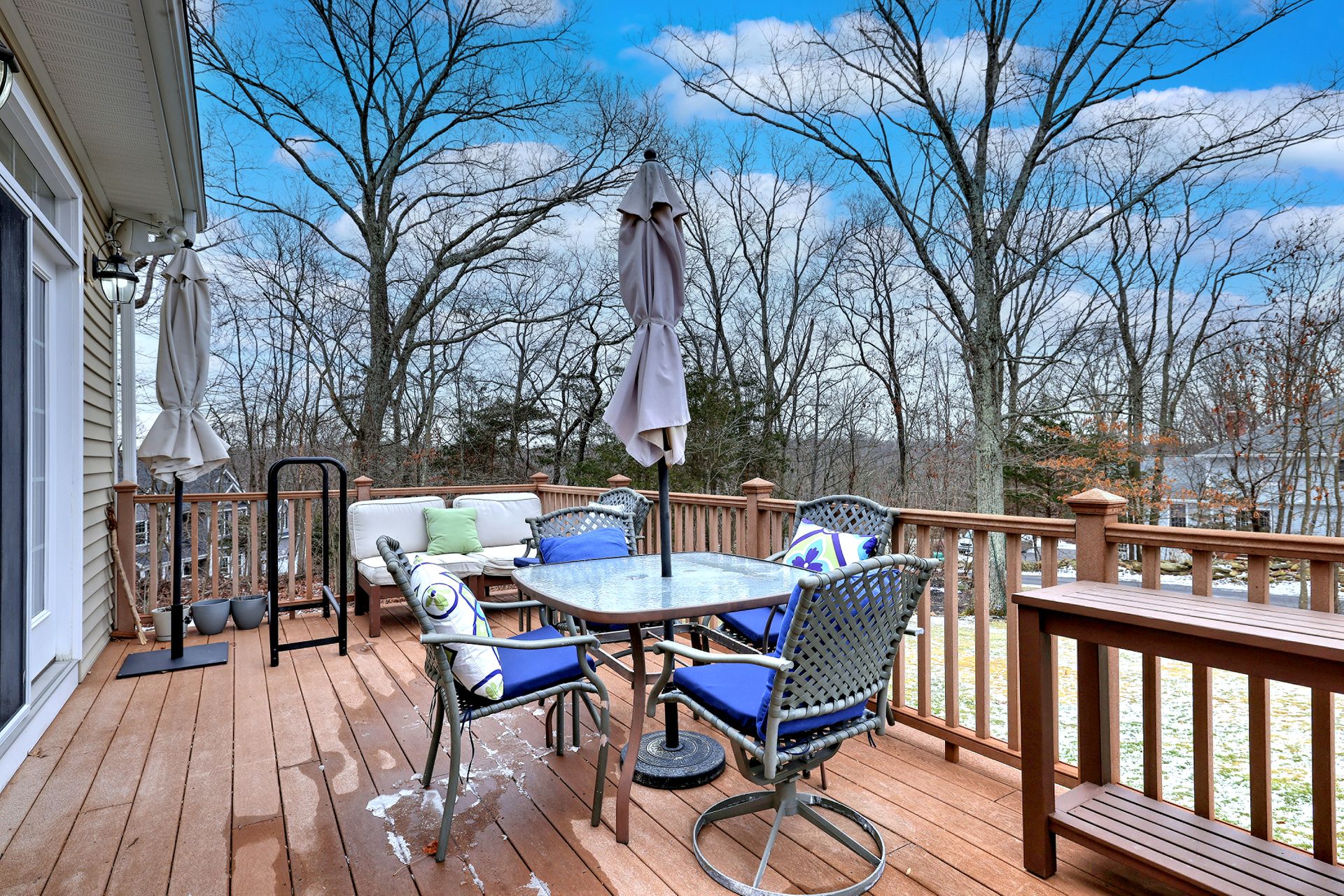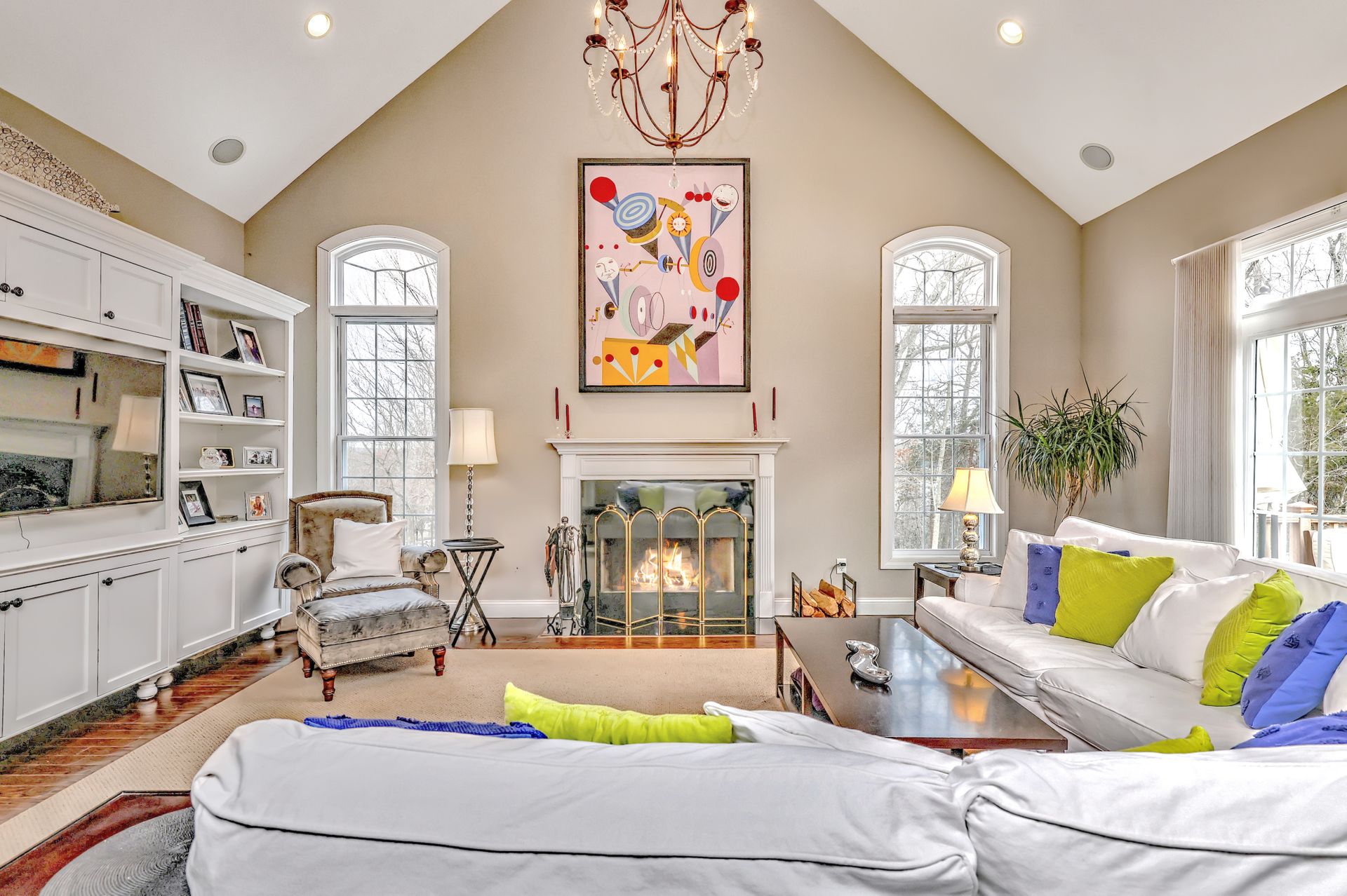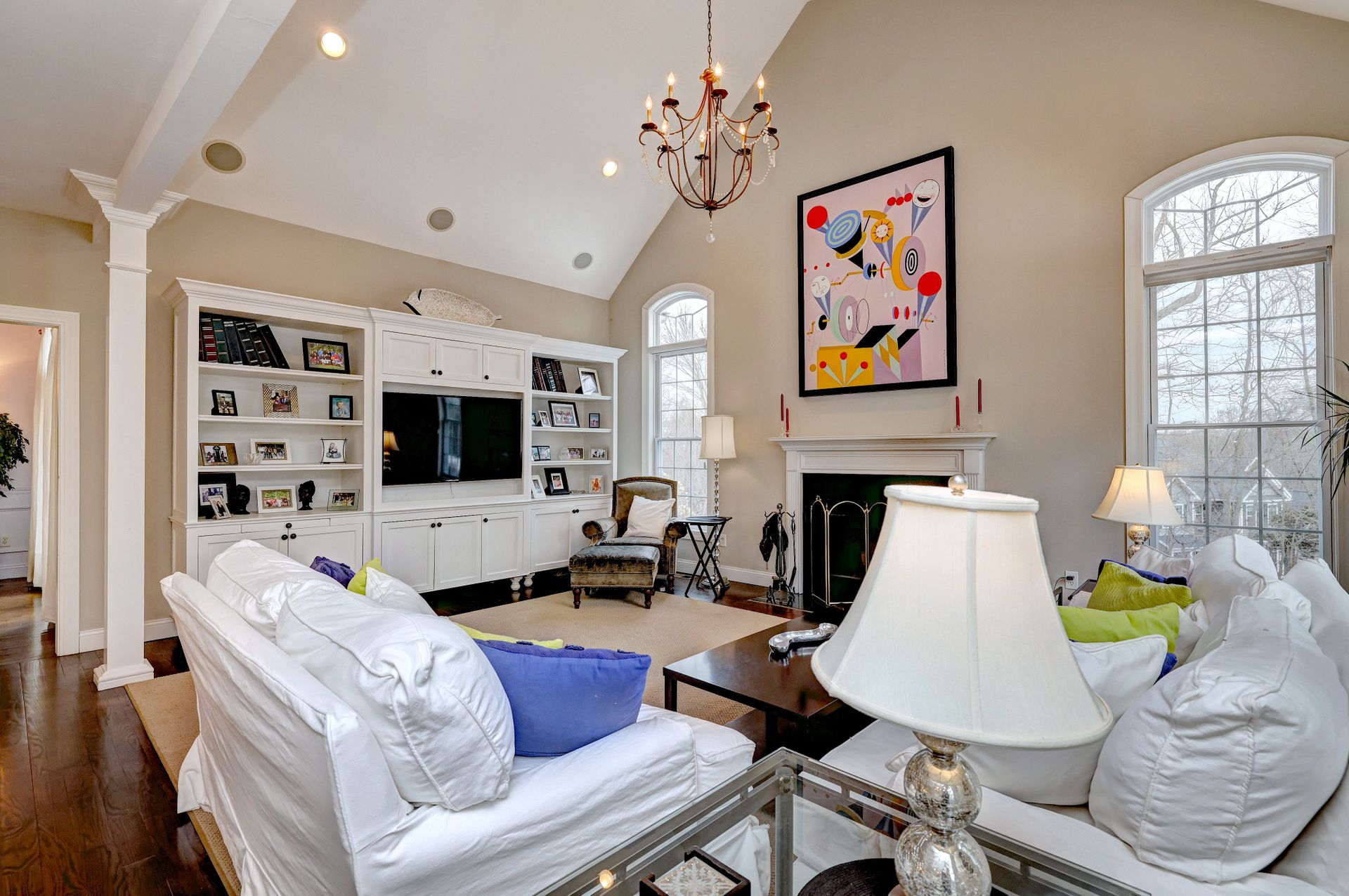 Upon entering through the delightful covered front porch, you’re greeted by a grand foyer with a stunning chandelier, gleaming marble floors with pewter accents, and detailed wall moldings. The chef’s kitchen is a dream, featuring double wall ovens, a gas cooktop with a professional-grade vent, hardwood floors, gorgeous granite counters, a breakfast bar, and a sunny breakfast nook. The sun-splashed two-story family room has a wood-burning fireplace, oversized windows, and access to a comfortable deck. The indoor/outdoor sound system with a seven-zone speaker design is an extraordinary feature, providing immersive sound throughout this amazing home. The formal dining room features a delightful balcony from the second floor, hardwood floors, and large sliders to the second deck.