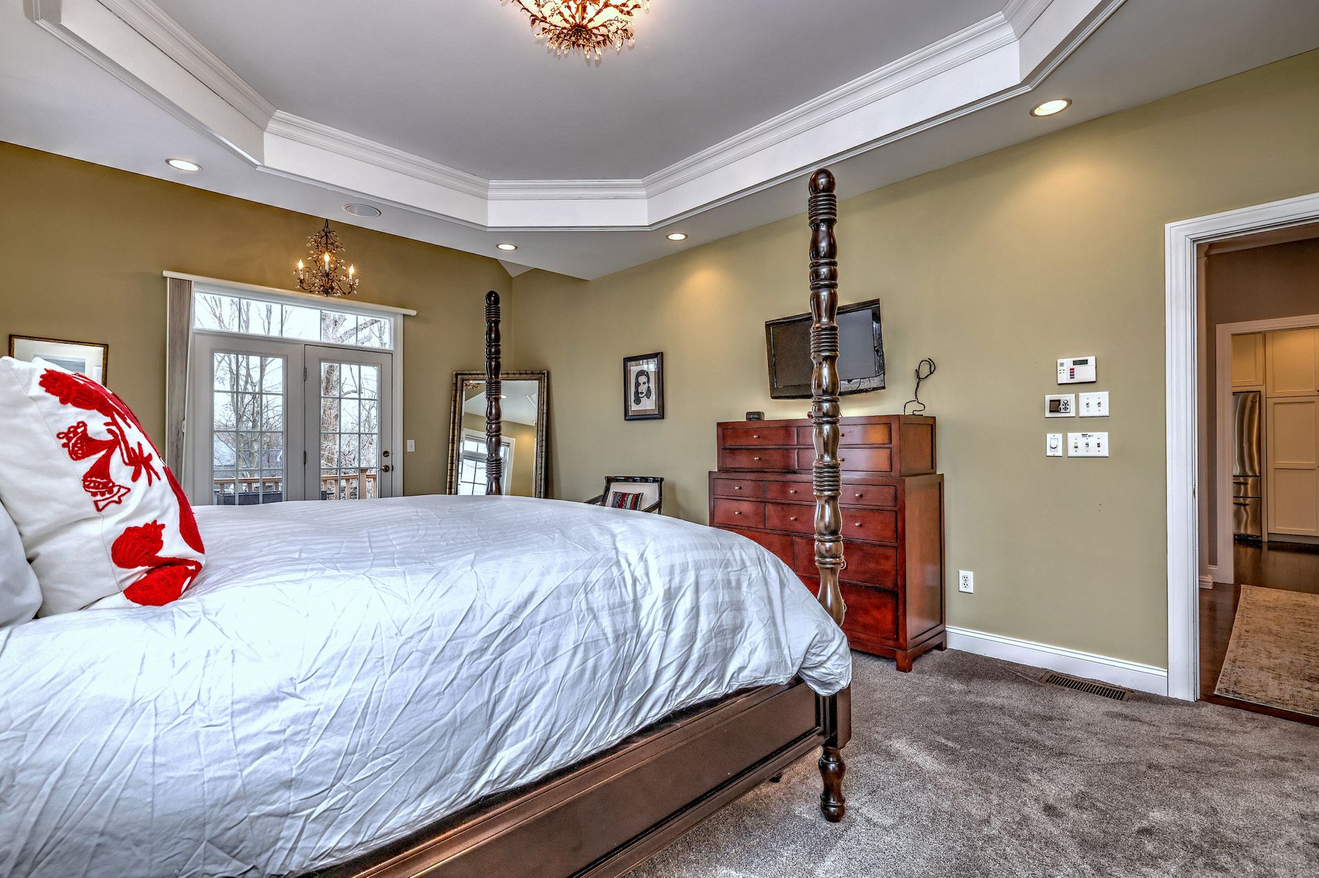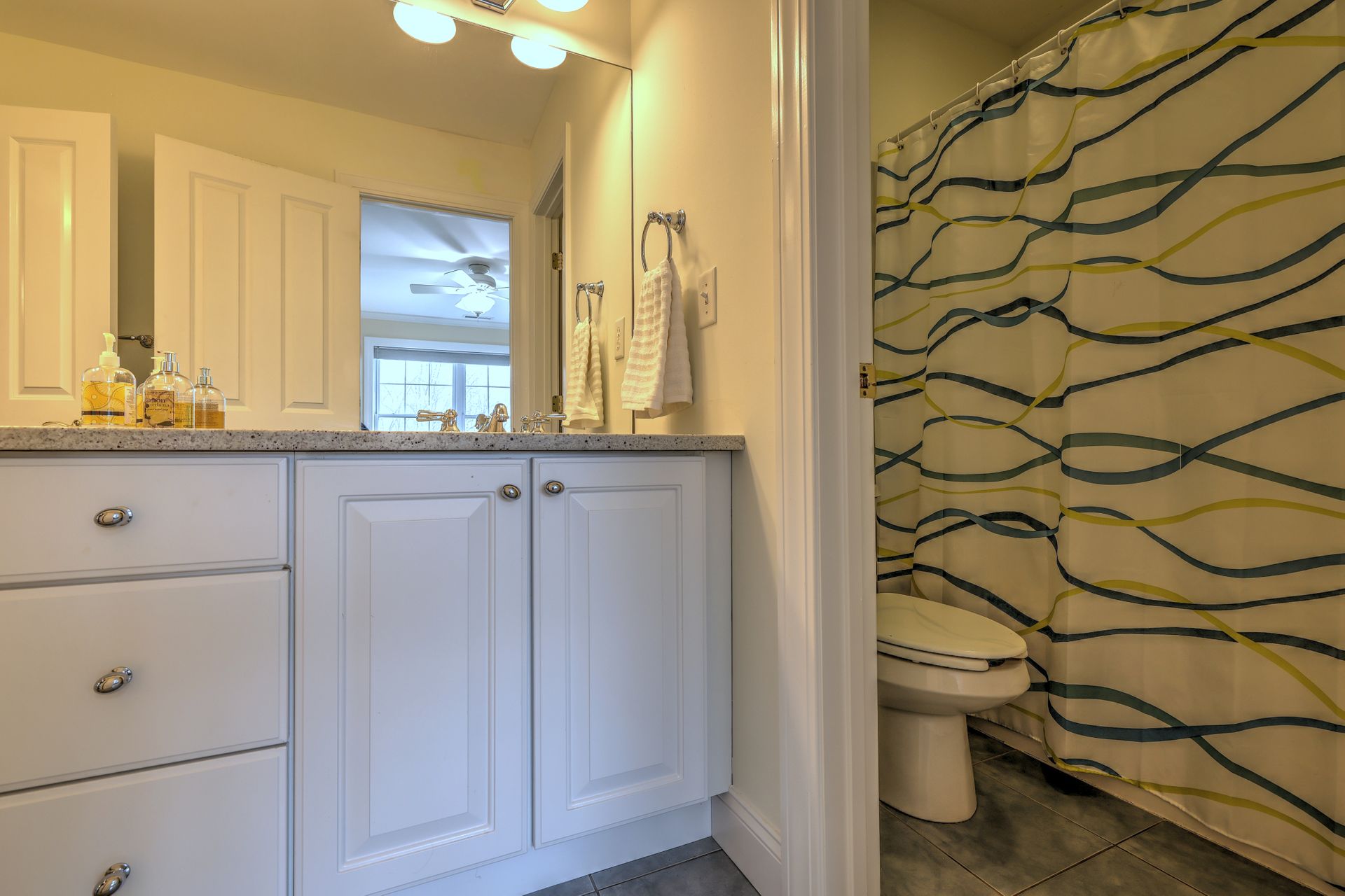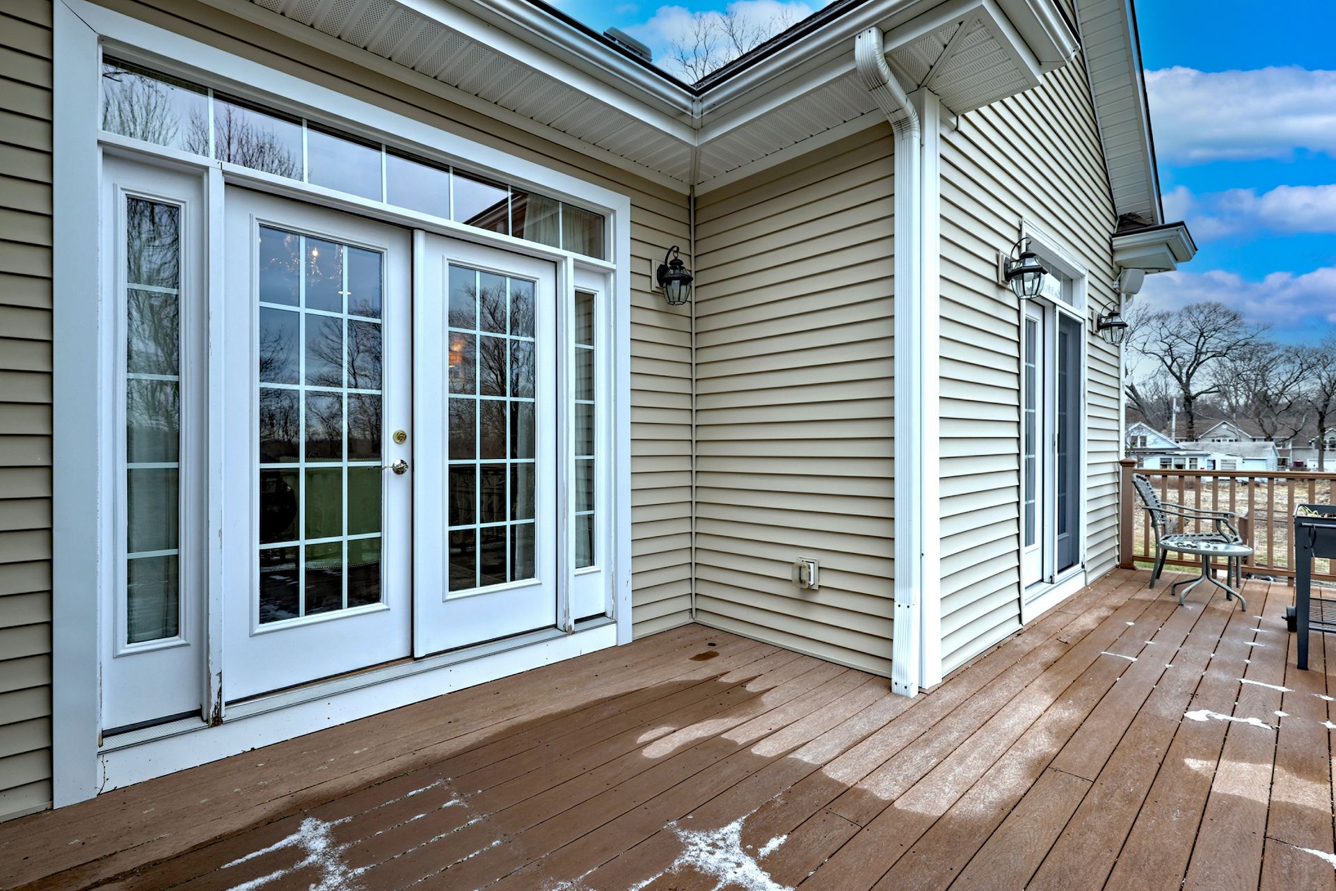 The first-floor primary suite is a peaceful retreat with additional sliders to the deck, a tray ceiling, a luxurious bath with a Whirlpool tub, an oversized shower, and a walk-in closet. A private office on the main floor with walk-in closet and adjacent full bath offers versatility—ideal for a fifth bedroom.