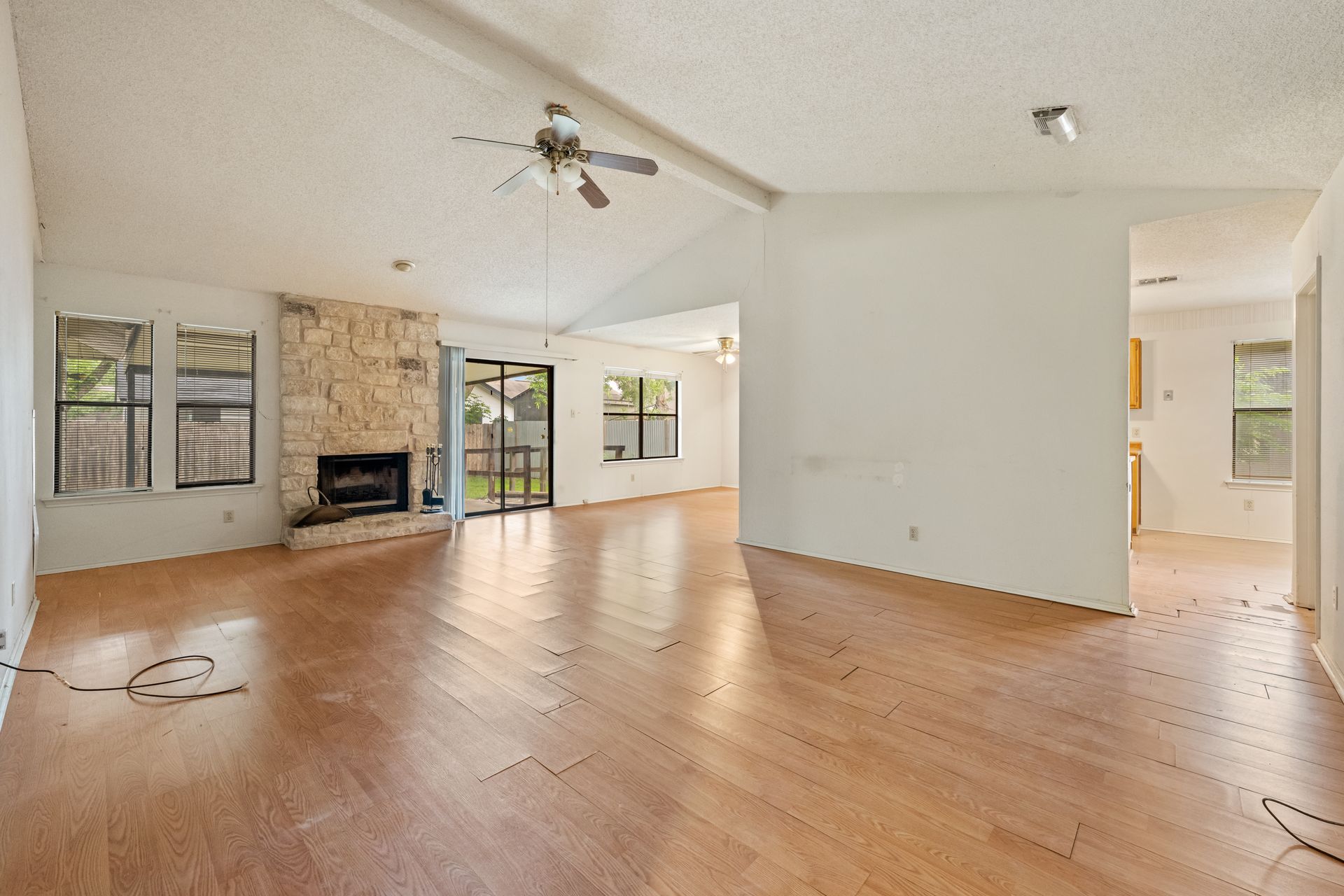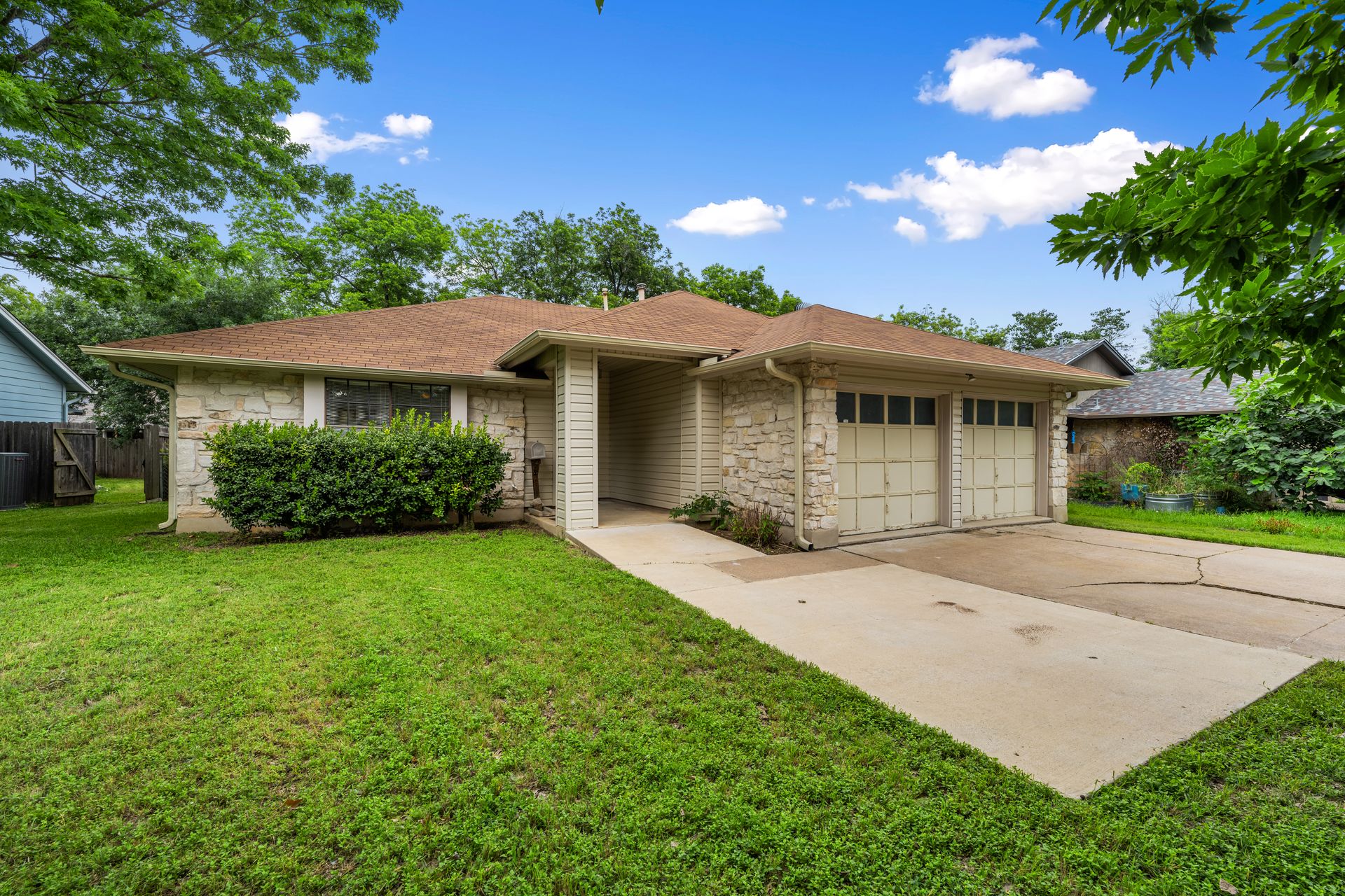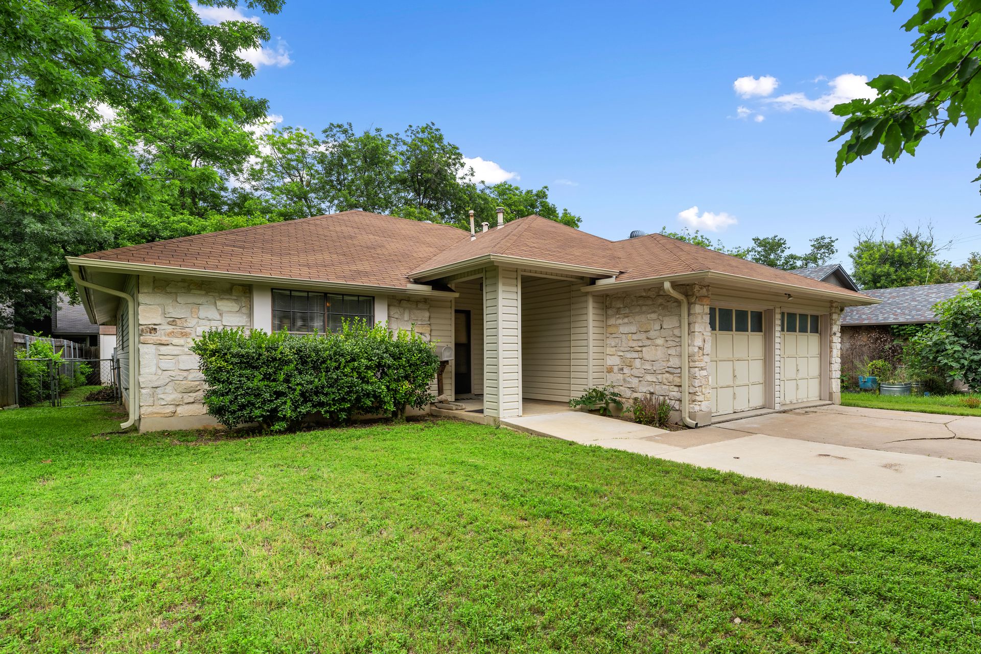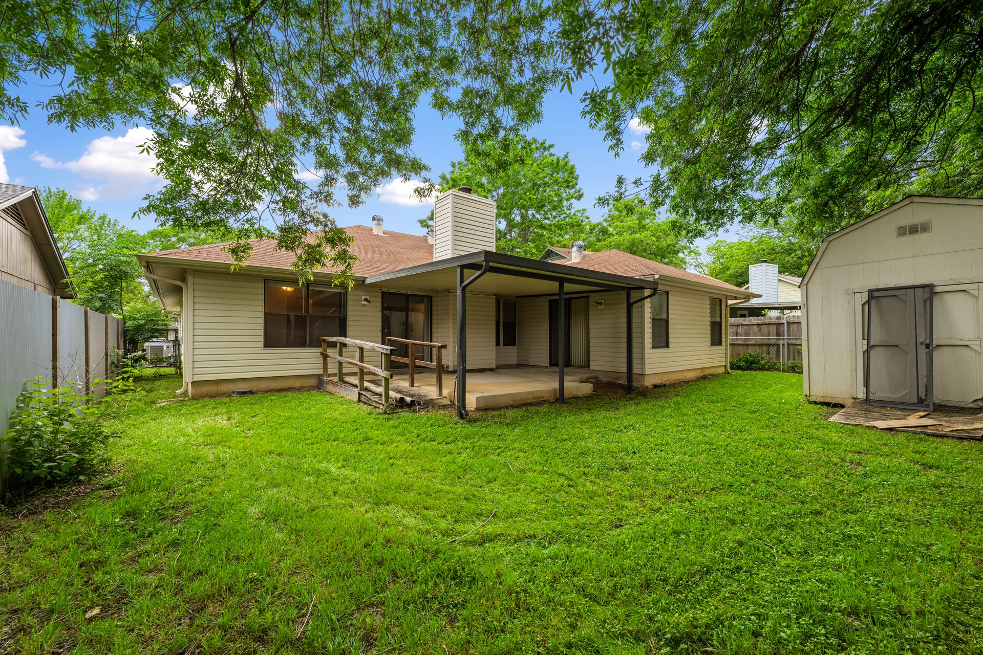 Unleash Your Inner Designer! This charming home is a blank canvas waiting for your creative touch. Nestled in a desirable South Austin neighborhood, this single story 3 bedroom, 2 bath home is a true hidden gem waiting to be discovered. You'll love the open floor plan with vaulted, beam ceilings and cozy wood burning fireplace in the living area. The formal dining off the living room as well as the breakfast area in the kitchen offers plenty of room for entertaining guests. The spacious primary retreat includes a full bath and two walk-in closets. The secondary bedrooms and bathroom are separated from the primary bedroom making this the perfect floor plan. Enjoy summer evenings on the covered patio overlooking a shaded backyard, perfect for barbecues or family gatherings. Private fenced yard with covered patio. One storage buildings provide extra storage space for all your needs!