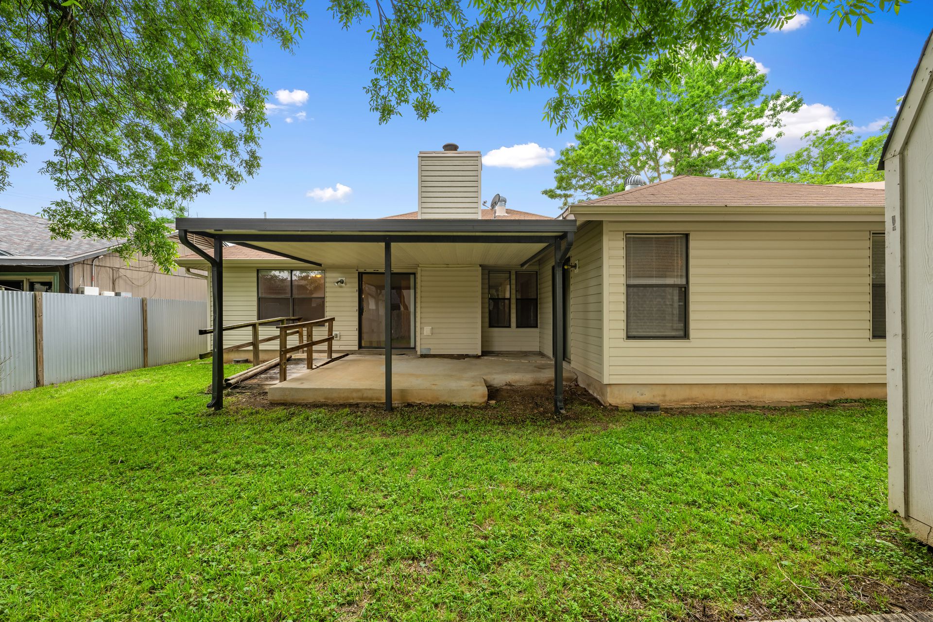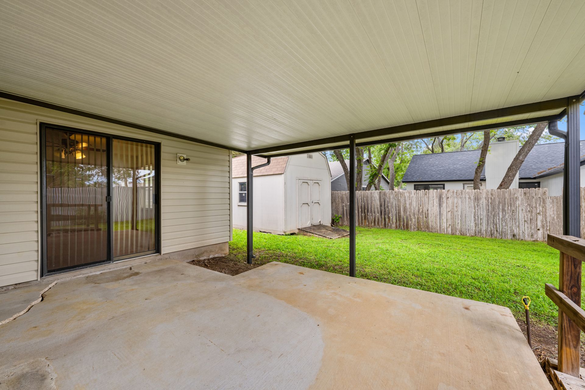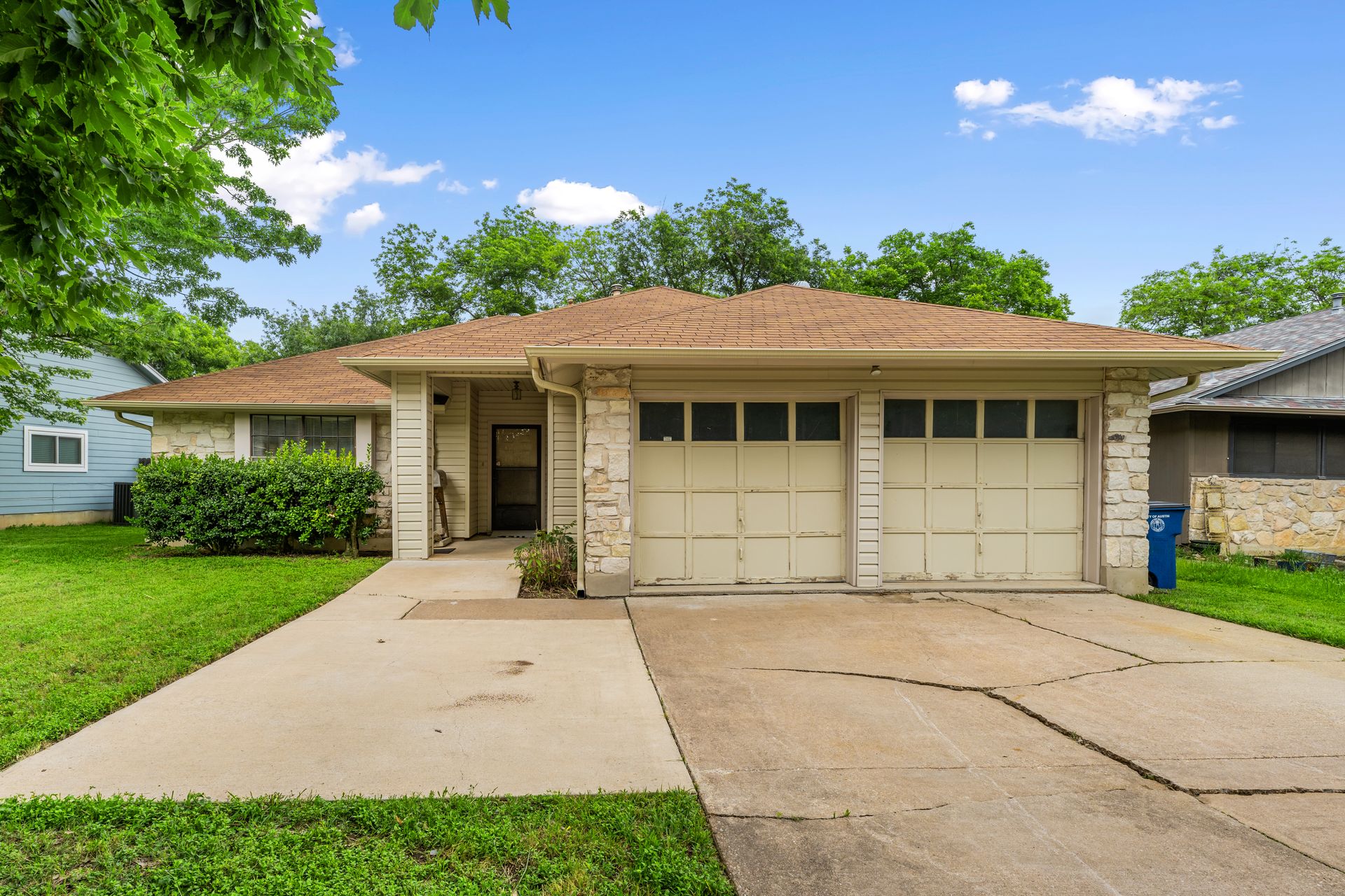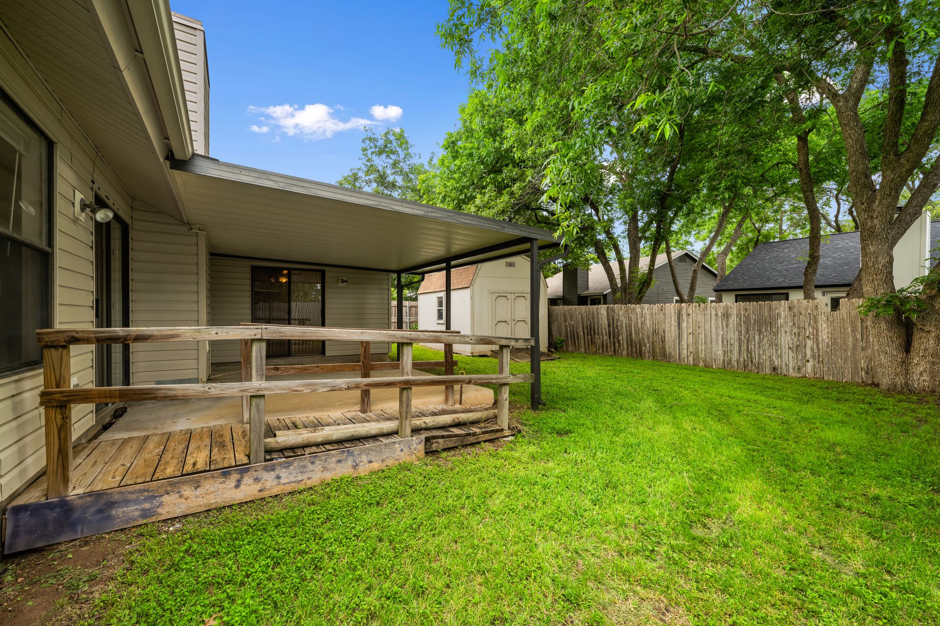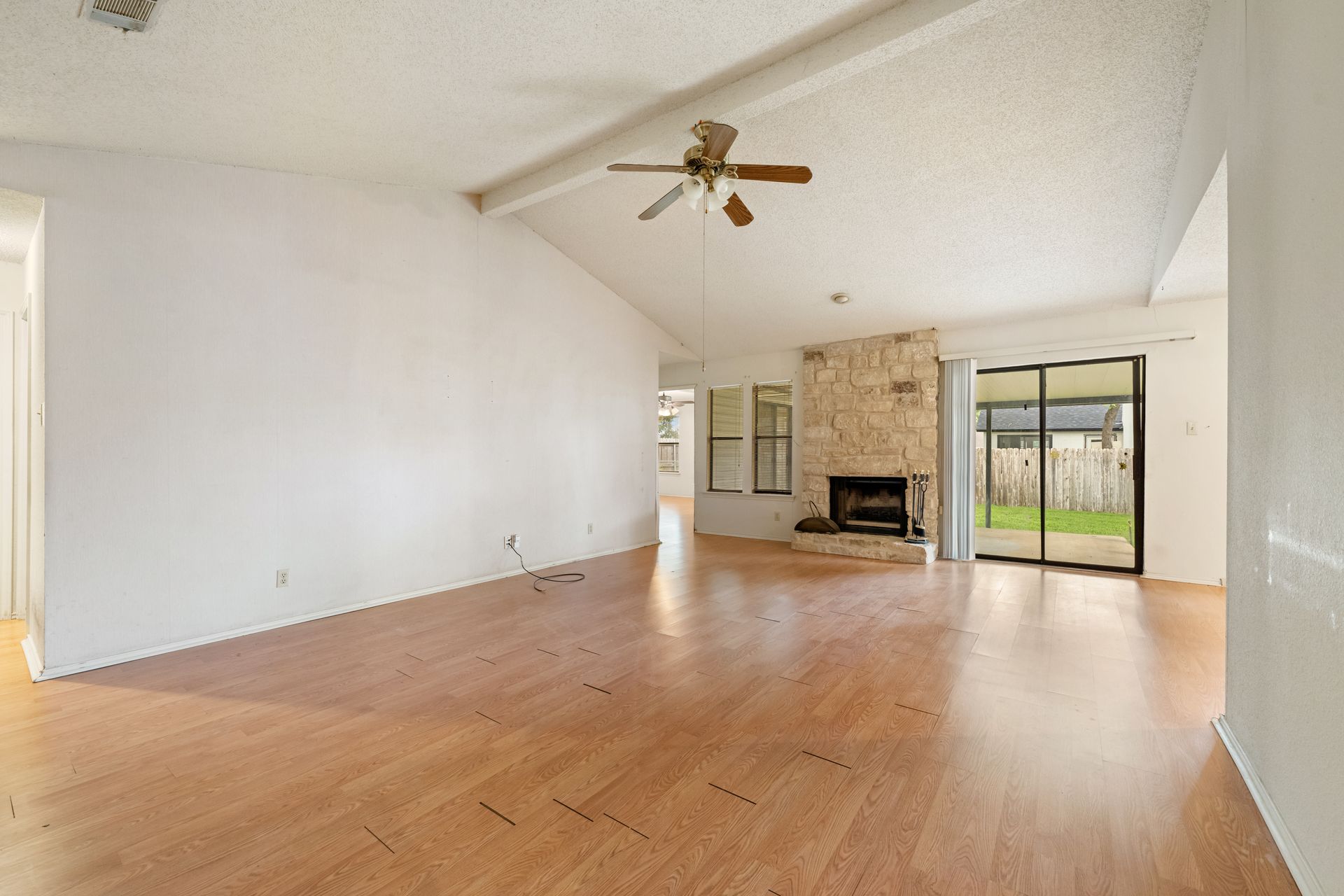Unleash Your Inner Designer! This charming home is a blank canvas waiting for your creative touch. Nestled in a desirable South Austin neighborhood, this single story 3 bedroom, 2 bath home is a true hidden gem waiting to be discovered. You'll love the open floor plan with vaulted, beam ceilings and cozy wood burning fireplace in the living area. The formal dining off the living room as well as the breakfast area in the kitchen offers plenty of room for entertaining guests. The spacious primary retreat includes a full bath and two walk-in closets. The secondary bedrooms and bathroom are separated from the primary bedroom making this the perfect floor plan. Enjoy summer evenings on the covered patio overlooking a shaded backyard, perfect for barbecues or family gatherings. Private fenced yard with covered patio. One storage buildings provide extra storage space for all your needs!