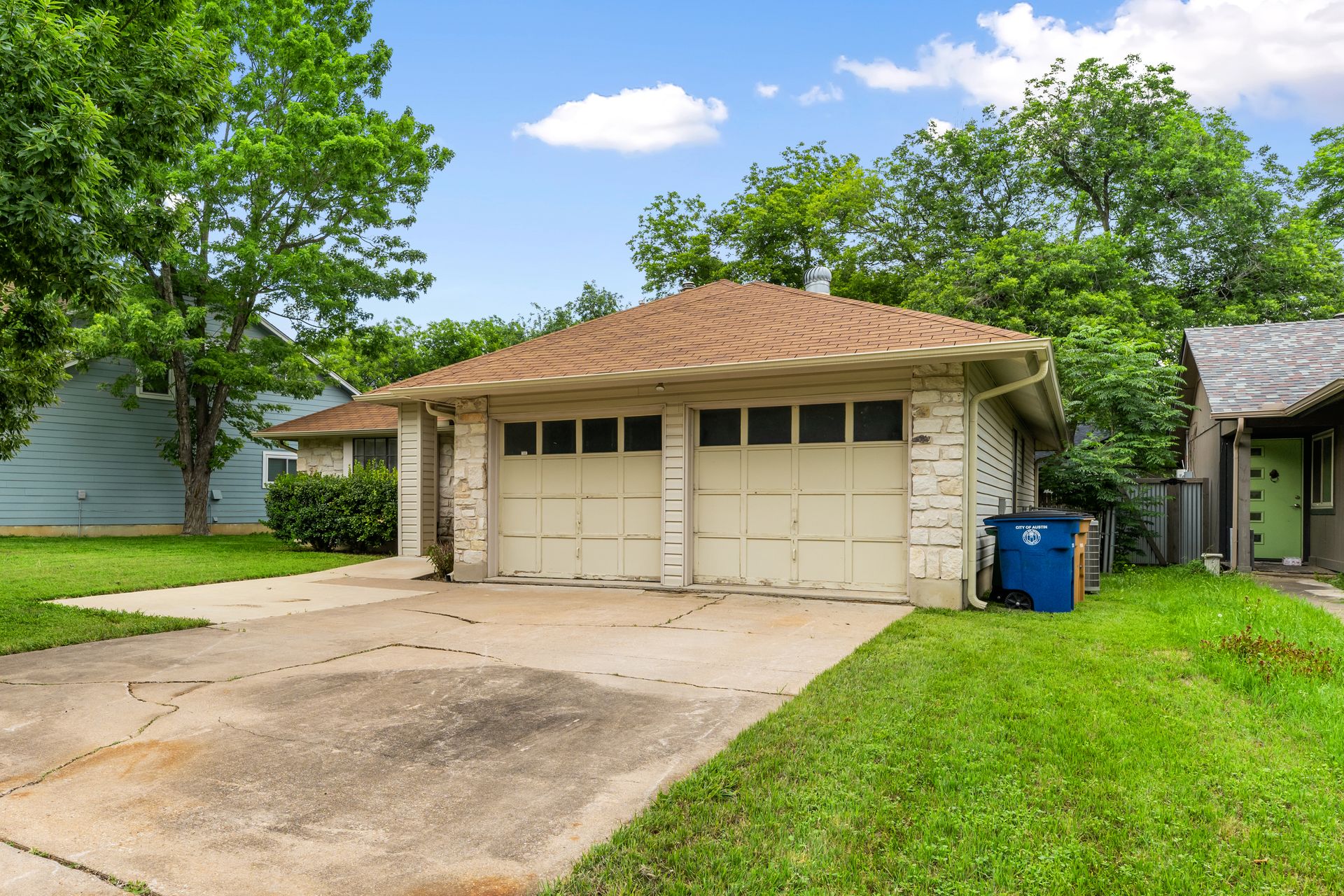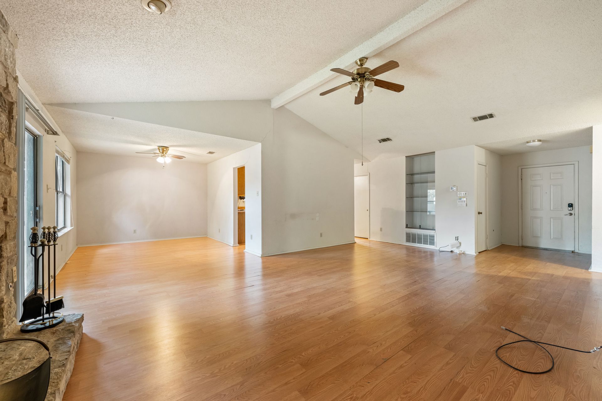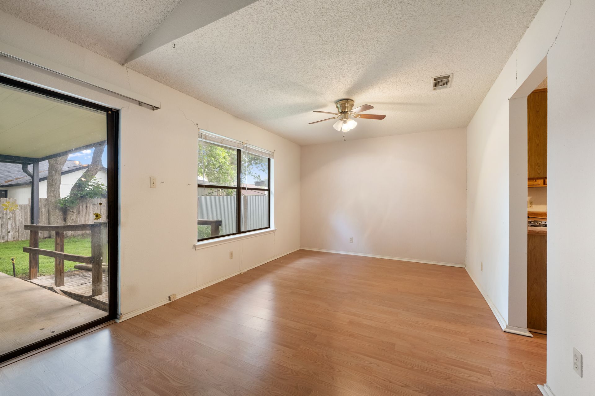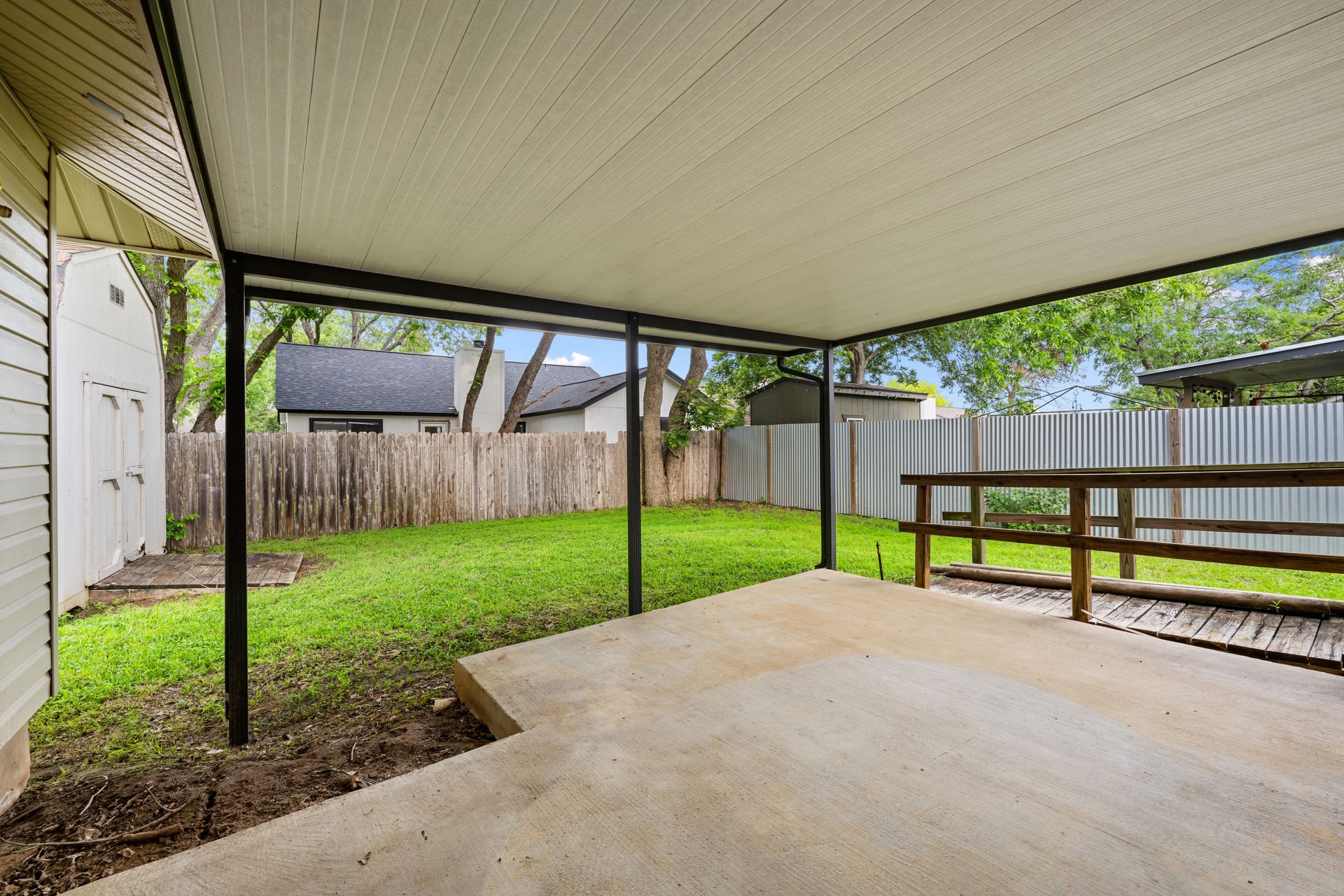 Unleash Your Inner Designer! This charming home is a blank canvas waiting for your creative touch. Nestled in a desirable South Austin neighborhood, this single story 3 bedroom, 2 bath home is a true hidden gem waiting to be discovered. You'll love the open floor plan with vaulted, beam ceilings and cozy wood burning fireplace in the living area. The formal dining off the living room as well as the breakfast area in the kitchen offers plenty of room for entertaining guests. The spacious primary retreat includes a full bath and two walk-in closets. The secondary bedrooms and bathroom are separated from the primary bedroom making this the perfect floor plan. Enjoy summer evenings on the covered patio overlooking a shaded backyard, perfect for barbecues or family gatherings. Private fenced yard with covered patio. One storage buildings provide extra storage space for all your needs!