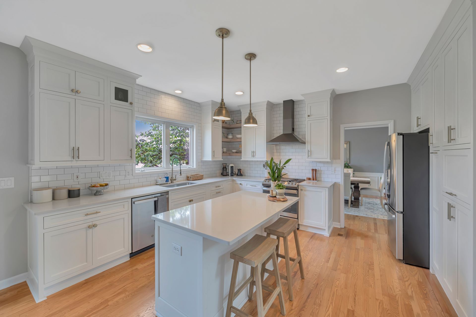 The updated kitchen is the heart of the home. It boasts oversized cabinetry and quartz counters complemented by trending hardware and lighting, making it a dream for both the avid cook and the entertainer. The refinished hardwood floors flow seamlessly through the main living areas, enhancing the home's inviting atmosphere.