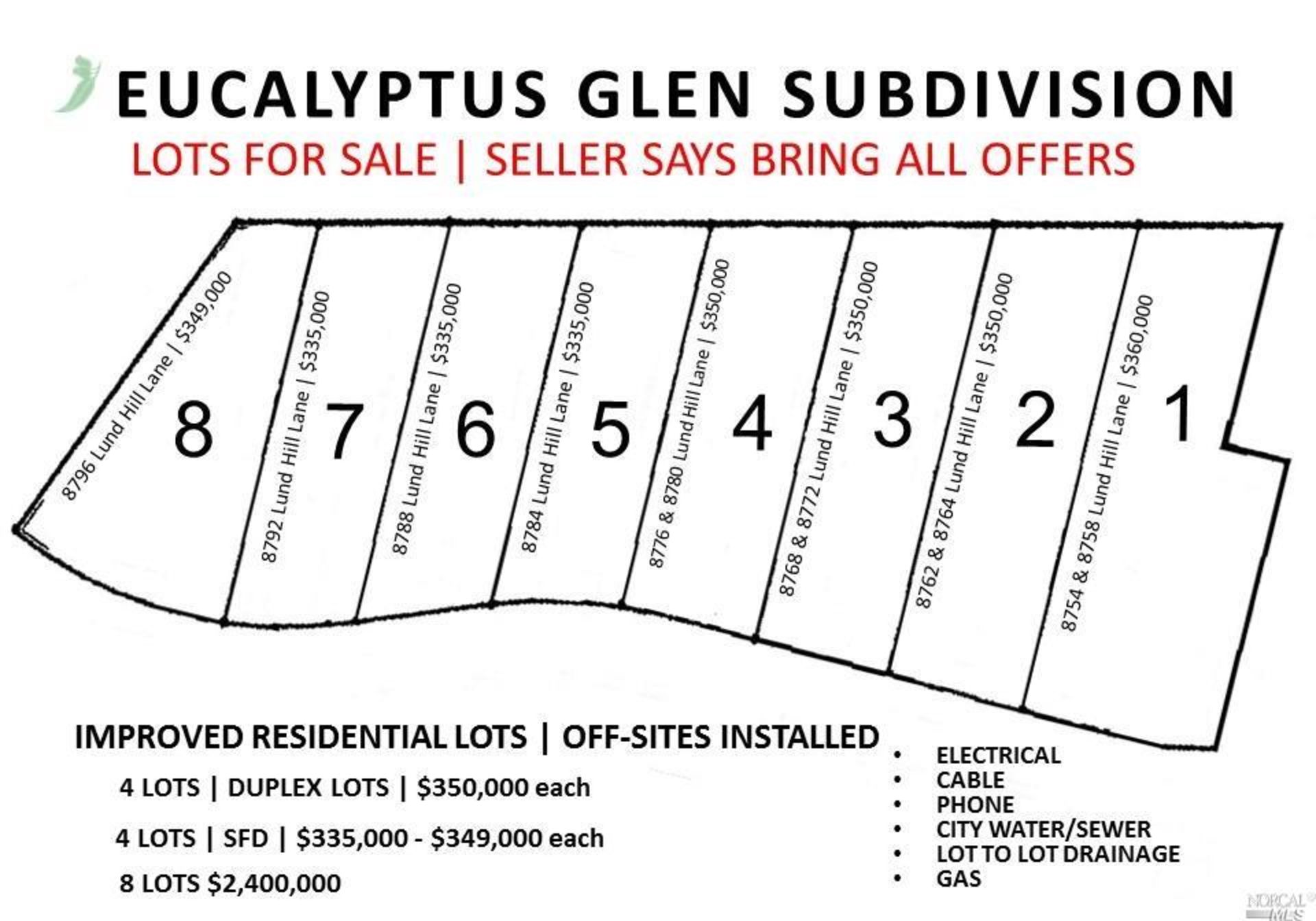 GREAT OPPORTUNITY! Prices slashed up to $185,000 for quick sales! Build your dream home or construct you brand new investment units to help round out your portfolio, eight sites approved in the Eucalyptus Glen subdivision. All off-sites already installed plus electrical, cable, phone, water, sewer and lot to lot drainage! All improvement fees including permits and hook-up fees will be at buyers' expense. Bring your creative vision.